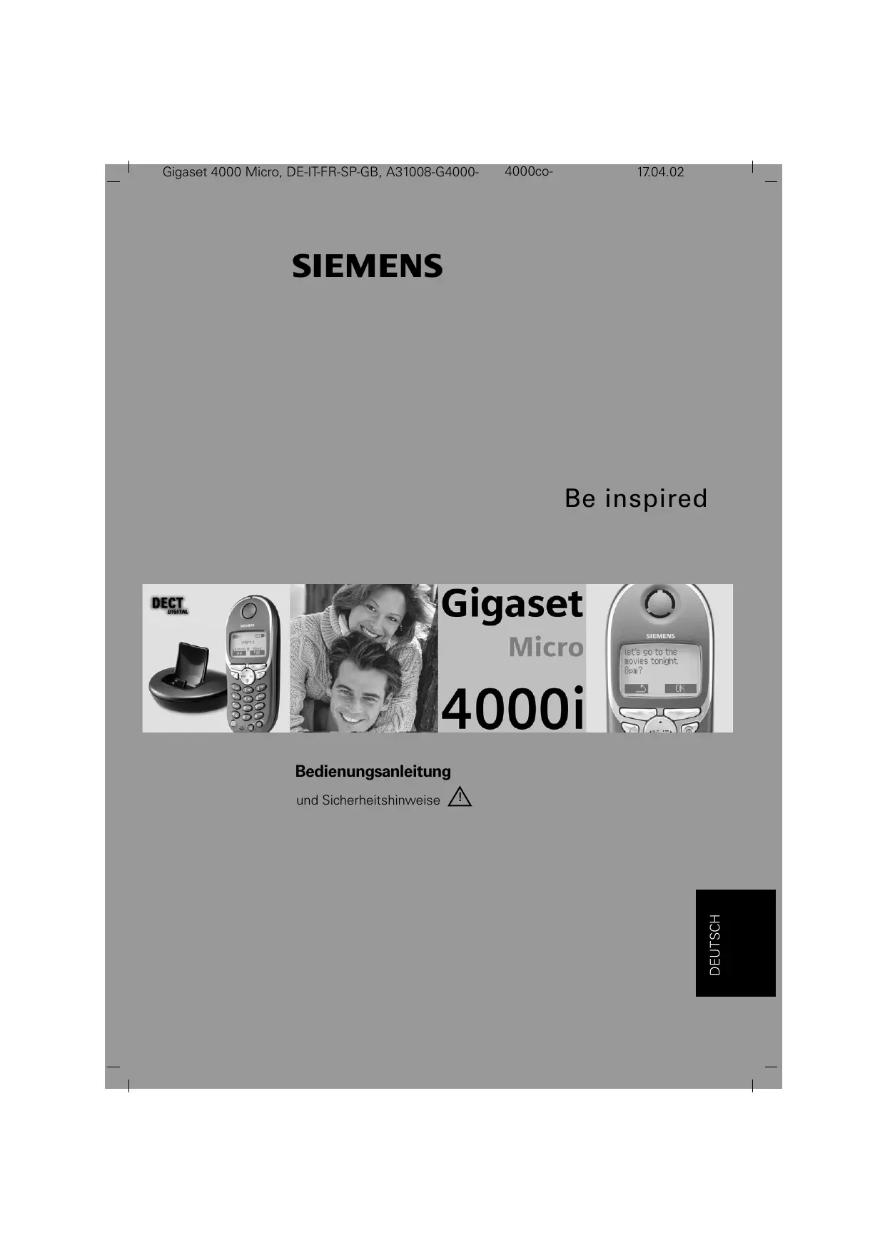 Laden Sie die Anleitung für Ihr Schnurloses Telefon kostenlos im PDF-Format! Finden Sie Ihr Handbuch GIGASET 4000I MICRO - SIEMENS und nehmen Sie Ihr elektronisches Gerät wieder in die Hand. Auf dieser Seite sind alle Dokumente veröffentlicht, die für die Verwendung Ihres Geräts notwendig sind. GIGASET 4000I MICRO von der Marke SIEMENS.