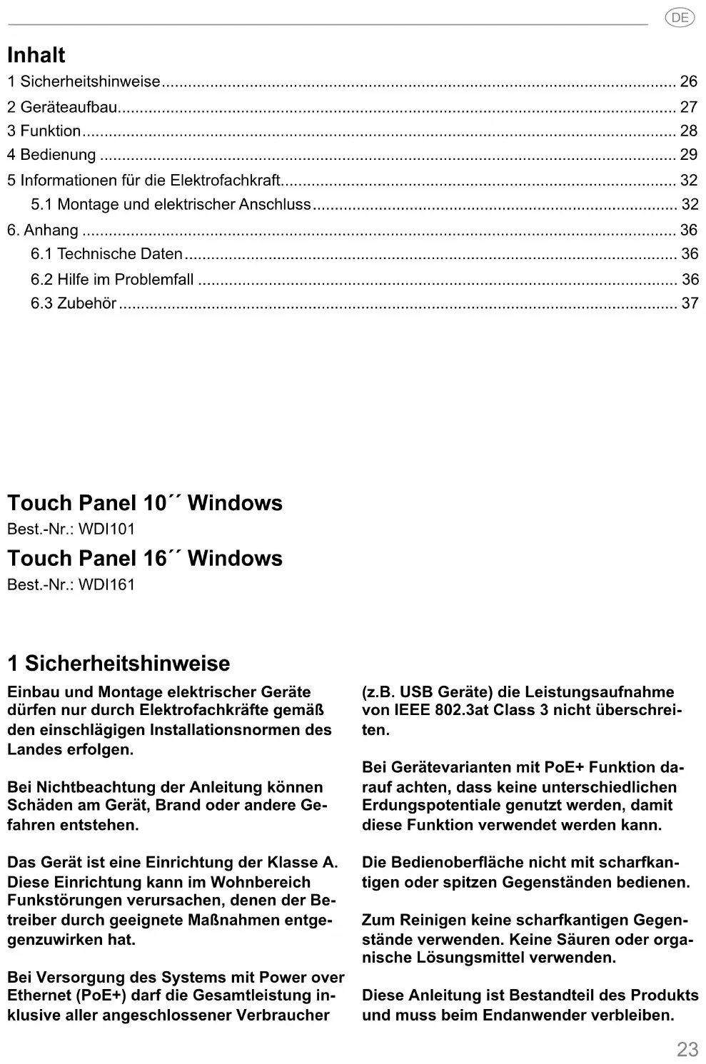 - 6.3 Zubehör Touch Panel 10´´ Windows Best.-Nr.: WDI101 Touch Panel 16´´ Windows Best.-Nr.: WDI161 1 Sicherheitshinweise Einbau und Montage elektrischer Geräte dürfen nur durch Elektrofachkräfte gemäß den einschlägigen Installationsnormen des Landes erfolgen. Bei Nichtbeachtung der Anleitung können Schäden am Gerät, Brand oder andere Ge- fahren entstehen. Das Gerät ist eine Einrichtung der Klasse A. Diese Einrichtung kann im Wohnbereich Funkstörungen verursachen, denen der Be- treiber durch geeignete Maßnahmen entge- genzuwirken hat. Bei Versorgung des Systems mit Power over Ethernet (PoE+) darf die Gesamtleistung in- klusive aller angeschlossener Verbraucher (z.B. USB Geräte) die Leistungsaufnahme von IEEE 802.3at Class 3 nicht überschrei- ten. Bei Gerätevarianten mit PoE+ Funktion da- rauf achten, dass keine unterschiedlichen Erdungspotentiale genutzt werden, damit diese Funktion verwendet werden kann. Die Bedienoberäche nicht mit scharfkan- tigen oder spitzen Gegenständen bedienen. Zum Reinigen keine scharfkantigen Gegen- stände verwenden. Keine Säuren oder orga- nische Lösungsmittel verwenden. Diese Anleitung ist Bestandteil des Produkts und muss beim Endanwender verbleiben. p. 37