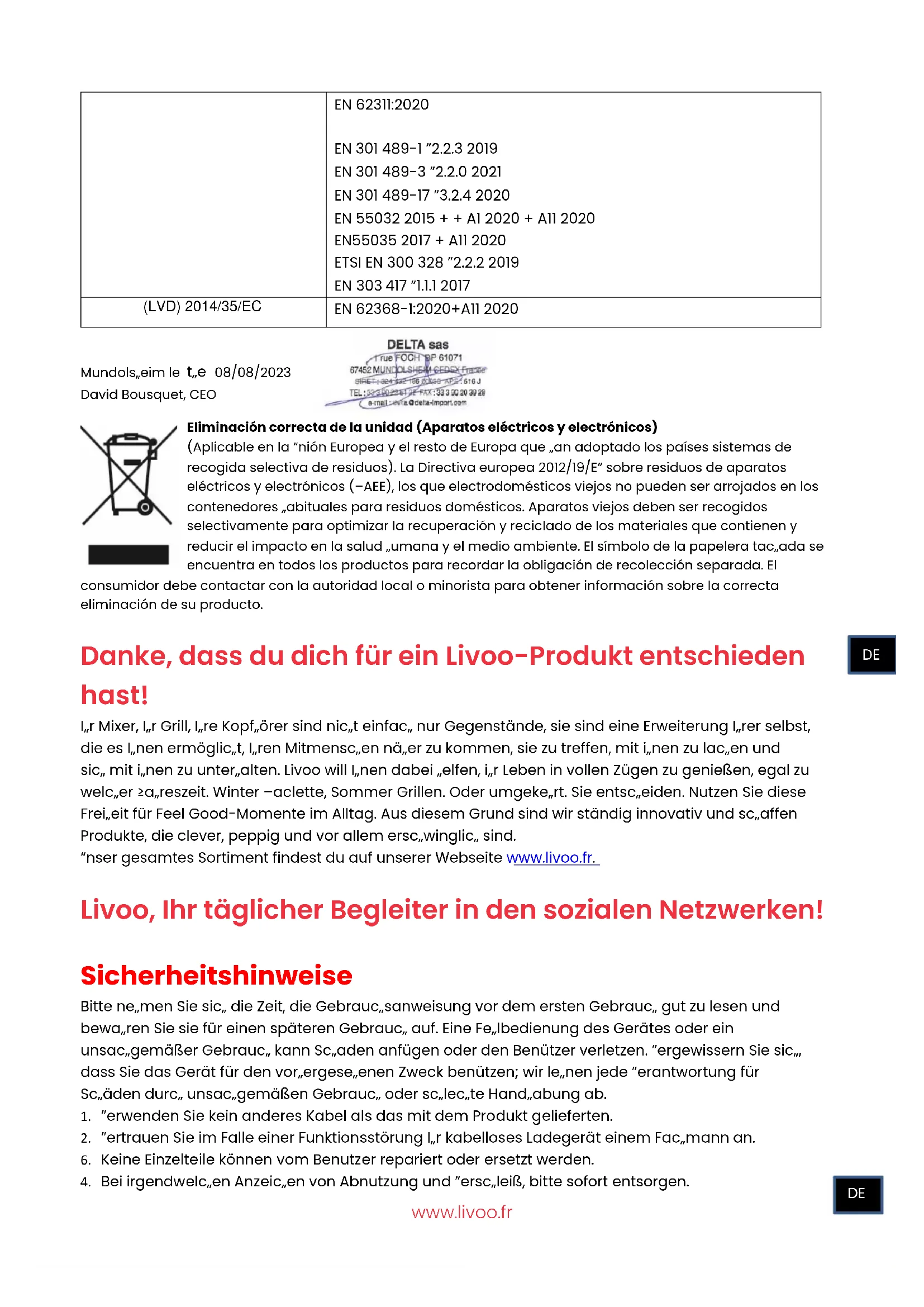 Wir DELTA BP61071 67452 Mundolsheim - Frankreich Erklären unter unserer eigenen Verantwortung, dass der Artikel: Beschreibung: - LED-Lautsprecher mit wireless ladegerät - Referenz: TES259 auf den sich diese Erklärung bezieht, mit den einschlägigen Harmonisierungsrechtsvorschriften der Union übereinstimmt : DEwww.livoo.fr RICHTLINIEN NORMEN oder Anforderungen (ROHS) 2011/65/EU Der oben beschriebene Gegenstand der Erklärung entspricht der Richtlinie 2011/65/EU des Europäischen Parlaments und des Rates vom 8. Juni 2011 zur Beschränkung der Verwendung bestimmter gefährlicher Stoffe in Elektro- und Elektronikgeräten. EU 2011/65/EU und EU 2015/863.