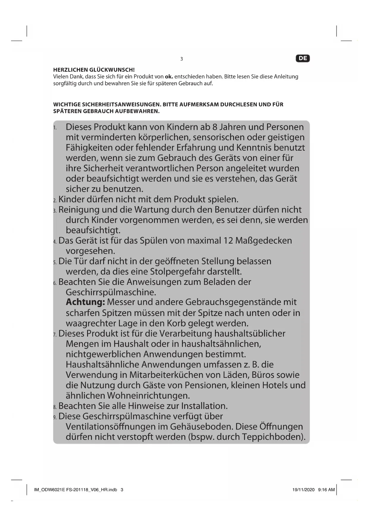 HERZLICHEN GLÜCKWUNSCH! Vielen Dank, dass Sie sich für ein Produkt von ok. entschieden haben. Bitte lesen Sie diese Anleitung sorgfältig durch und bewahren Sie sie für späteren Gebrauch auf. WICHTIGE SICHERHEITSANWEISUNGEN. BITTE AUFMERKSAM DURCHLESEN UND FÜR SPÄTEREN GEBRAUCH AUFBEWAHREN.