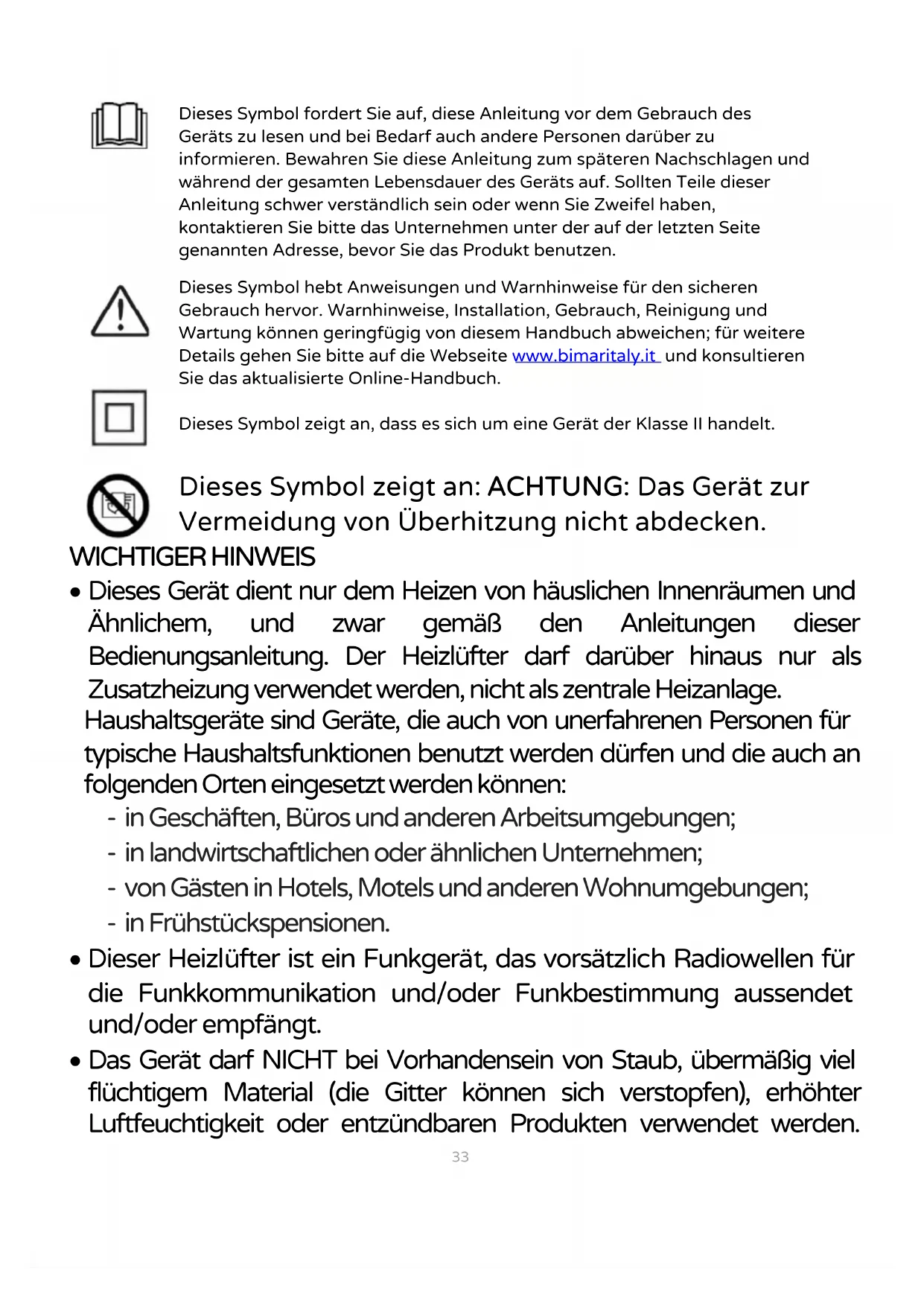 Dieses Symbol fordert Sie auf, diese Anleitung vor dem Gebrauch des Geräts zu lesen und bei Bedarf auch andere Personen darüber zu informieren. Bewahren Sie diese Anleitung zum späteren Nachschlagen und während der gesamten Lebensdauer des Geräts auf. Sollten Teile dieser Anleitung schwer verständlich sein oder wenn Sie Zweifel haben, kontaktieren Sie bitte das Unternehmen unter der auf der letzten Seite genannten Adresse, bevor Sie das Produkt benutzen. Dieses Symbol hebt Anweisungen und Warnhinweise für den sicheren Gebrauch hervor. Warnhinweise, Installation, Gebrauch, Reinigung und Wartung können geringfügig von diesem Handbuch abweichen; für weitere Details gehen Sie bitte auf die Webseite www.bimaritaly.it und konsultieren Sie das aktualisierte Online-Handbuch.