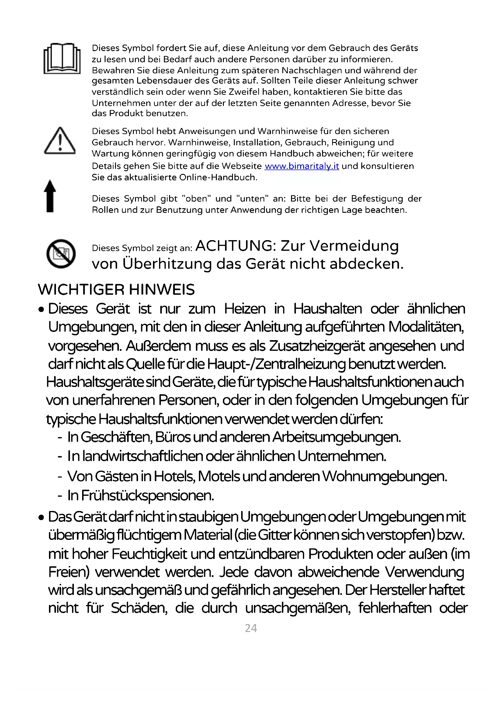 Dieses Symbol hebt Anweisungen und Warnhinweise für den sicheren Gebrauch hervor. Warnhinweise, Installation, Gebrauch, Reinigung und Wartung können geringfügig von diesem Handbuch abweichen; für weitere Details gehen Sie bitte auf die Webseite www.bimaritaly.it und konsultieren Sie das aktualisierte Online-Handbuch. Dieses Symbol gibt "oben" und "unten" an: Bitte bei der Befestigung der Rollen und zur Benutzung unter Anwendung der richtigen Lage beachten.