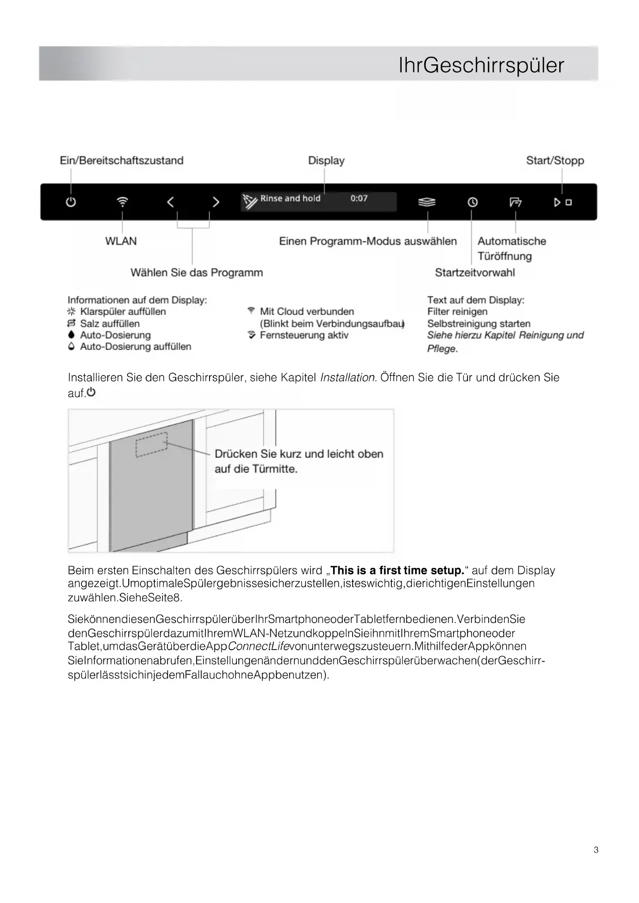 Technische Daten und Energieklassen- Aufkleber .................................................... 57Technische Daten ........................................ 57Informationen für Verbraucher ..................... 57Informationen für das Testinstitut ................. 57Konformitätserklärung .................................. InhaltsverzeichnisSalz auffüllen Display Start/Stopp Einen Programm-Modus auswählen Wählen Sie das Programm Automatische Türöffnung Startzeitvorwahl Ein/Bereitschaftszustand WLAN Mit Cloud verbunden Auto-Dosierung Auto-Dosierung auffüllen (Blinkt beim Verbindungsaufbau) Informationen auf dem Display: Klarspüler auffüllen Text auf dem Display: Filter reinigen Selbstreinigung starten Siehe hierzu Kapitel Reinigung und Pflege. Fernsteuerung aktiv Installieren Sie den Geschirrspüler, siehe Kapitel Installation. Öffnen Sie die Tür und drücken Sie auf . Drücken Sie kurz und leicht oben auf die Türmitte. Beim ersten Einschalten des Geschirrspülers wird „This is a first time setup.“ auf dem Display angezeigt. Um optimale Spülergebnisse sicherzustellen, ist es wichtig, die richtigen Einstellungen zu wählen. Siehe Seite 8. Sie können diesen Geschirrspüler über Ihr Smartphone oder Tablet fernbedienen. Verbinden Sie den Geschirrspüler dazu mit Ihrem WLAN-Netz und koppeln Sie ihn mit Ihrem Smartphone oder Tablet, um das Gerät über die App ConnectLife von unterwegs zu steuern. Mithilfe der App können Sie Informationen abrufen, Einstellungen ändern und den Geschirrspüler überwachen (der Geschirr- spüler lässt sich in jedem Fall auch ohne App benutzen).