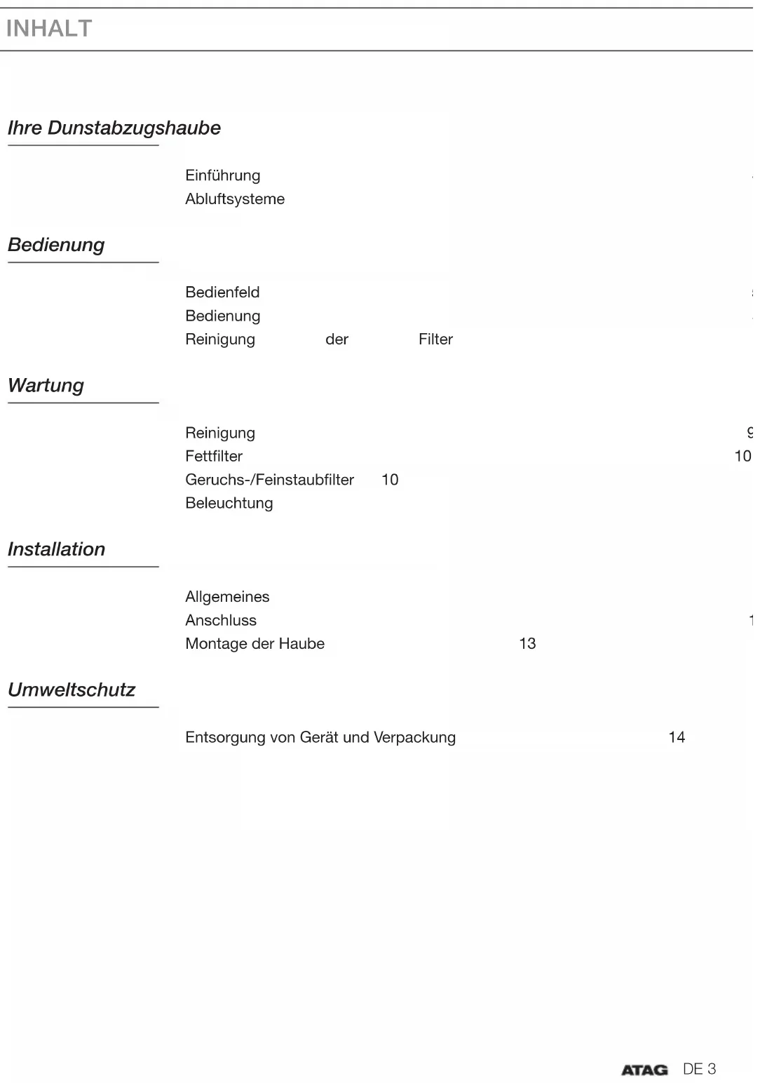 - FCKW-freies Polystyrol (PS-Hartschaum) Entsorgen Sie diese Materialien umweltgerecht und gemäß den gesetzlichen Bestimmungen. Das Gerät ist mit dem Symbol einer durchgestrichenen Mülltonne gekennzeichnet. Dieses Symbol weist darauf hin, dass Elektrogeräte getrennt entsorgt werden müssen. Das Gerät darf nicht über den normalen Hausmüll entsorgt werden. Geben Sie das Gerät bei einer kommunalen Abfallsammelstelle oder bei Ihrem Händler ab. Durch die getrennte Entsorgung von Haushaltgeräten werden Umwelt- und Gesundheitsschäden vermieden. Die bei der Herstellung dieses Geräts verwendeten Materialien lassen sich wiederverwerten, wodurch sich erhebliche Mengen an Energie und Rohstoffen einsparen lassen. Konformitätserklärung Wir erklären hiermit, dass unsere Produkte den einschlägigen europäischen Richtlinien, Normen und Vorschriften entsprechen sowie sämtliche Normen einhalten, auf welche diese verweisen.EN 3 CONTENT Your cooker hood Introduction 4 Extraction systems 4 Operation Control panel 5 Operation 5 Cleaning the filters 7 Maintenance Cleaning 9 Grease filters 10 Odour/fine particle filter 10 Lighting 12 Installation General 12 Connection 13 Mounting the cooker hood 13 Environmental aspects Disposal of packaging and appliance 14EN 4 Introduction Congratulations on choosing this Atag cooker hood. This product is designed with simple operation and optimum comfort in mind. These instructions for use explain how you can make best use of this appliance. These instructions contain information about the operation of the appliance and background information that may be of help to you during its use. First read the safety instructions before using the appliance! Read these instructions thoroughly before you first use the appliance, and keep the instructions for future use. You can find the most recent version of the instructions for use on our website. Extraction systems The cooker hood can be connected in two ways: