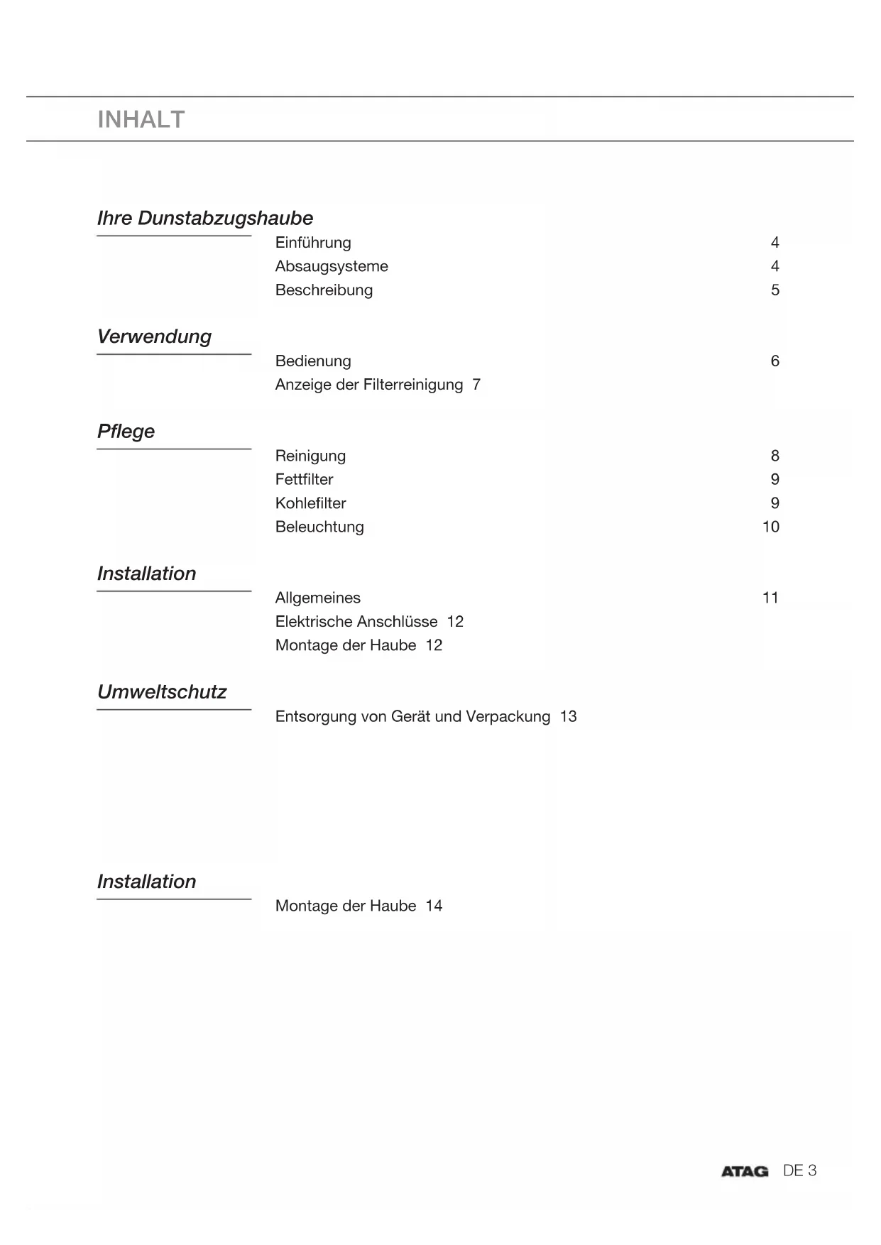 - CFK-freies Polystyrol (PS-Hartschaum). Diese Werkstoffe sind ordnungsgemäß und gemäß den behördlichen Vorschriften zu entsorgen. Zur Erinnerung an die Verpflichtung, dass Elektrohaushaltsgeräte getrennt entsorgt werden müssen, ist das Produkt mit einer durchgestrichen Mülltonne gekennzeichnet. Dies bedeutet, dass am Ende seiner Nutzzeit das Produkt nicht zusammen mit dem Hausabfall beseitigt werden darf. Es kann zu den eigens von den städtischen Behörden eingerichteten Sammelstellen oder zu den Fachhändlern, die einen Rücknahmeservice anbieten, gebracht werden. Die getrennte Entsorgung eines Haushaltsgerätes vermeidet mögliche negative Auswirkungen auf die Umwelt und die menschliche Gesundheit, die durch eine nicht vorschriftsmäßige Entsorgung entstehen können. Zudem wird die Wiederverwertung der Materialien, aus denen sich das Gerät zusammensetzt, ermöglicht. Dies bringt wiederum eine bedeutende Einsparung an Energie und Ressourcen mit sich. Konformitätserklärung Wir erklären hiermit, dass unsere Produkte die einschlägigen europäischen Richtlinien, Anweisungen und Gesetze sowie die Standards, auf die in diesen verwiesen wird, erfüllen. UMWELTSCHUTZDE 14EN 3 CONTENT Your cooker hood Introduction 4 Exhaust systems 4 Description 5 Use Operation 6 Filters cleaning indication 7 Maintenance Cleaning 8 Grease filters 9 Carbon filters 9 Lighting 10 Installation General 11 Electrical connection 12 Mounting the cooker hood 12 Umweltschutz Entsorgung von Gerät und Verpackung 13 Installation Montage der Haube 14EN 4 Introduction Congratulations on choosing this Atag cooker hood. This product is designed with simple operation and optimum comfort in mind. The cooker hood works silently and extracts at maximum efficiency. With this hood, cooking odours are a thing of the past. First read the separate safety instructions beforeusing the appliance! Read this user manual thoroughly before you first use the appliance, and store the manual safely for future use. You can find the most recent version of the instructions for use on our website. Exhaust systems The cooker hood can be connected in two ways: