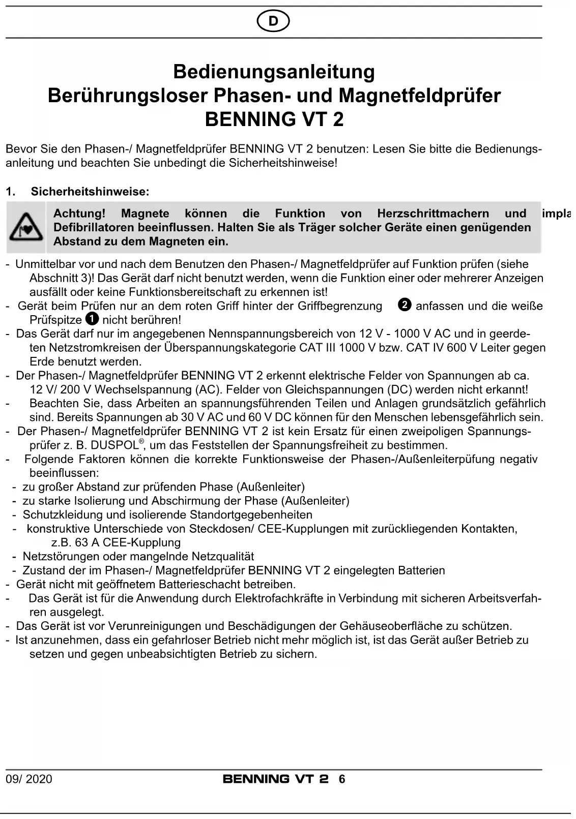 , um das Feststellen der Spannungsfreiheit zu bestimmen. - Folgende Faktoren können die korrekte Funktionsweise der Phasen-/Außenleiterpüfung negativ beeinflussen: - zu großer Abstand zur prüfenden Phase (Außenleiter) - zu starke Isolierung und Abschirmung der Phase (Außenleiter) - Schutzkleidung und isolierende Standortgegebenheiten - konstruktive Unterschiede von Steckdosen/ CEE-Kupplungen mit zurückliegenden Kontakten, z.B. 63 A CEE-Kupplung - Netzstörungen oder mangelnde Netzqualität - Zustand der im Phasen-/ Magnetfeldprüfer BENNING VT 2 eingelegten Batterien - Gerät nicht mit geöffnetem Batterieschacht betreiben. - Das Gerät ist für die Anwendung durch Elektrofachkräfte in Verbindung mit sicheren Arbeitsverfah- ren ausgelegt. - Das Gerät ist vor Verunreinigungen und Beschädigungen der Gehäuseoberfläche zu schützen. - Ist anzunehmen, dass ein gefahrloser Betrieb nicht mehr möglich ist, ist das Gerät außer Betrieb zu setzen und gegen unbeabsichtigten Betrieb zu sichern.09/ 2020 BENNING VT 2 7 Elektrische Symbole auf dem Gerät: Symbol BedeutungAchtung! Magnete können die Funktion von Herzschrittmachern und implantierten Debrillatoren beeinussen. Halten Sie als Träger solcher Geräte einen genügenden Abstand zu dem Magneten ein. Achtung Dokumentation beachten!Das Symbol gibt an, dass die Hinweise in der Bedienungsanleitung zu beachten sind, um Gefahren zu vermeidenDieses Symbol auf dem Gerät bedeutet, dass der BENNING VT 2 schutzisoliert (Schutzklasse II) ausgeführt ist.Bedienungsanleitung beachten.Dieses Symbol auf dem Gerät bedeutet, dass das Gerät konform zu den EU-Richtlinien ist. AC Wechselspannung Erde (Spannung gegen Erde)Dieses Symbol zeigt die Ausrichtung der Batterien zum polrichtigen Einlegen an2. Gerätebeschreibung(Bild A) PrüfspitzemitLED-Anzeige (rot/grün) Griffbegrenzung