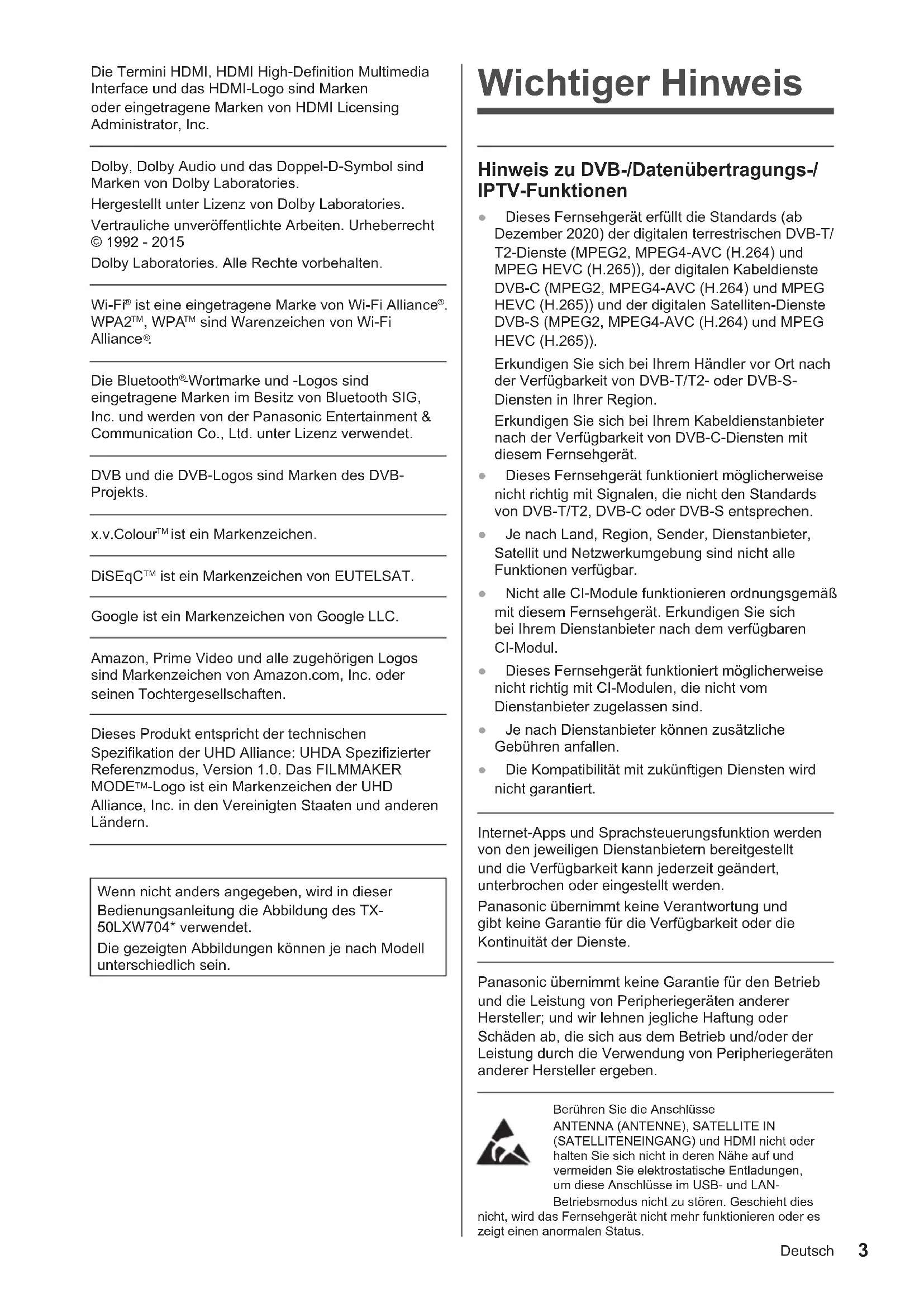 -Logo ist ein Markenzeichen der UHD Alliance, Inc. in den Vereinigten Staaten und anderen Ländern. Wenn nicht anders angegeben, wird in dieser Bedienungsanleitung die Abbildung des TX- 50LXW704* verwendet. Die gezeigten Abbildungen können je nach Modell unterschiedlich sein. Wichtiger Hinweis Hinweis zu DVB-/Datenübertragungs-/ IPTV-Funktionen ● Dieses Fernsehgerät erfüllt die Standards (ab Dezember 2020) der digitalen terrestrischen DVB-T/ T2-Dienste (MPEG2, MPEG4-AVC (H.264) und MPEG HEVC (H.265)), der digitalen Kabeldienste DVB-C (MPEG2, MPEG4-AVC (H.264) und MPEG HEVC (H.265)) und der digitalen Satelliten-Dienste DVB-S (MPEG2, MPEG4-AVC (H.264) und MPEG HEVC (H.265)). Erkundigen Sie sich bei Ihrem Händler vor Ort nach der Verfügbarkeit von DVB-T/T2- oder DVB-S- Diensten in Ihrer Region. Erkundigen Sie sich bei Ihrem Kabeldienstanbieter nach der Verfügbarkeit von DVB-C-Diensten mit diesem Fernsehgerät. ● Dieses Fernsehgerät funktioniert möglicherweise nicht richtig mit Signalen, die nicht den Standards von DVB-T/T2, DVB-C oder DVB-S entsprechen. ● Je nach Land, Region, Sender, Dienstanbieter, Satellit und Netzwerkumgebung sind nicht alle Funktionen verfügbar. ● Nicht alle CI-Module funktionieren ordnungsgemäß mit diesem Fernsehgerät. Erkundigen Sie sich bei Ihrem Dienstanbieter nach dem verfügbaren CI-Modul. ● Dieses Fernsehgerät funktioniert möglicherweise nicht richtig mit CI-Modulen, die nicht vom Dienstanbieter zugelassen sind. ● Je nach Dienstanbieter können zusätzliche Gebühren anfallen. ● Die Kompatibilität mit zukünftigen Diensten wird nicht garantiert. Internet-Apps und Sprachsteuerungsfunktion werden von den jeweiligen Dienstanbietern bereitgestellt und die Verfügbarkeit kann jederzeit geändert, unterbrochen oder eingestellt werden. Panasonic übernimmt keine Verantwortung und gibt keine Garantie für die Verfügbarkeit oder die Kontinuität der Dienste. Panasonic übernimmt keine Garantie für den Betrieb und die Leistung von Peripheriegeräten anderer Hersteller; und wir lehnen jegliche Haftung oder Schäden ab, die sich aus dem Betrieb und/oder der Leistung durch die Verwendung von Peripheriegeräten anderer Hersteller ergeben. Berühren Sie die Anschlüsse