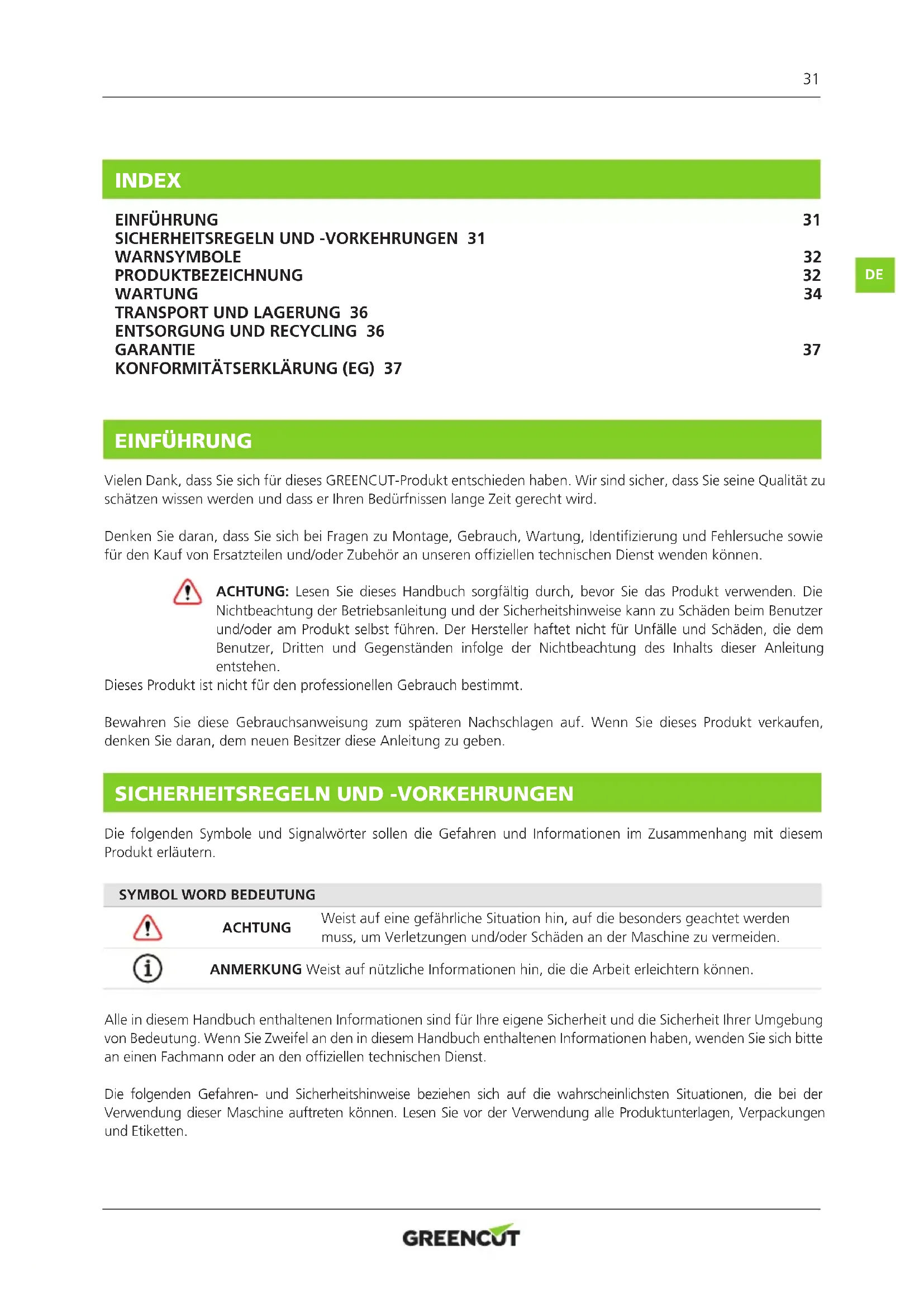 EINFÜHRUNG Vielen Dank, dass Sie sich für dieses GREENCUT-Produkt entschieden haben. Wir sind sicher, dass Sie seine Qualität zu schätzen wissen werden und dass er Ihren Bedürfnissen lange Zeit gerecht wird. Denken Sie daran, dass Sie sich bei Fragen zu Montage, Gebrauch, Wartung, Identizierung und Fehlersuche sowie für den Kauf von Ersatzteilen und/oder Zubehör an unseren ofziellen technischen Dienst wenden können. ACHTUNG: Lesen Sie dieses Handbuch sorgfältig durch, bevor Sie das Produkt verwenden. Die Nichtbeachtung der Betriebsanleitung und der Sicherheitshinweise kann zu Schäden beim Benutzer und/oder am Produkt selbst führen. Der Hersteller haftet nicht für Unfälle und Schäden, die dem Benutzer, Dritten und Gegenständen infolge der Nichtbeachtung des Inhalts dieser Anleitung entstehen. Dieses Produkt ist nicht für den professionellen Gebrauch bestimmt. Bewahren Sie diese Gebrauchsanweisung zum späteren Nachschlagen auf. Wenn Sie dieses Produkt verkaufen, denken Sie daran, dem neuen Besitzer diese Anleitung zu geben.
