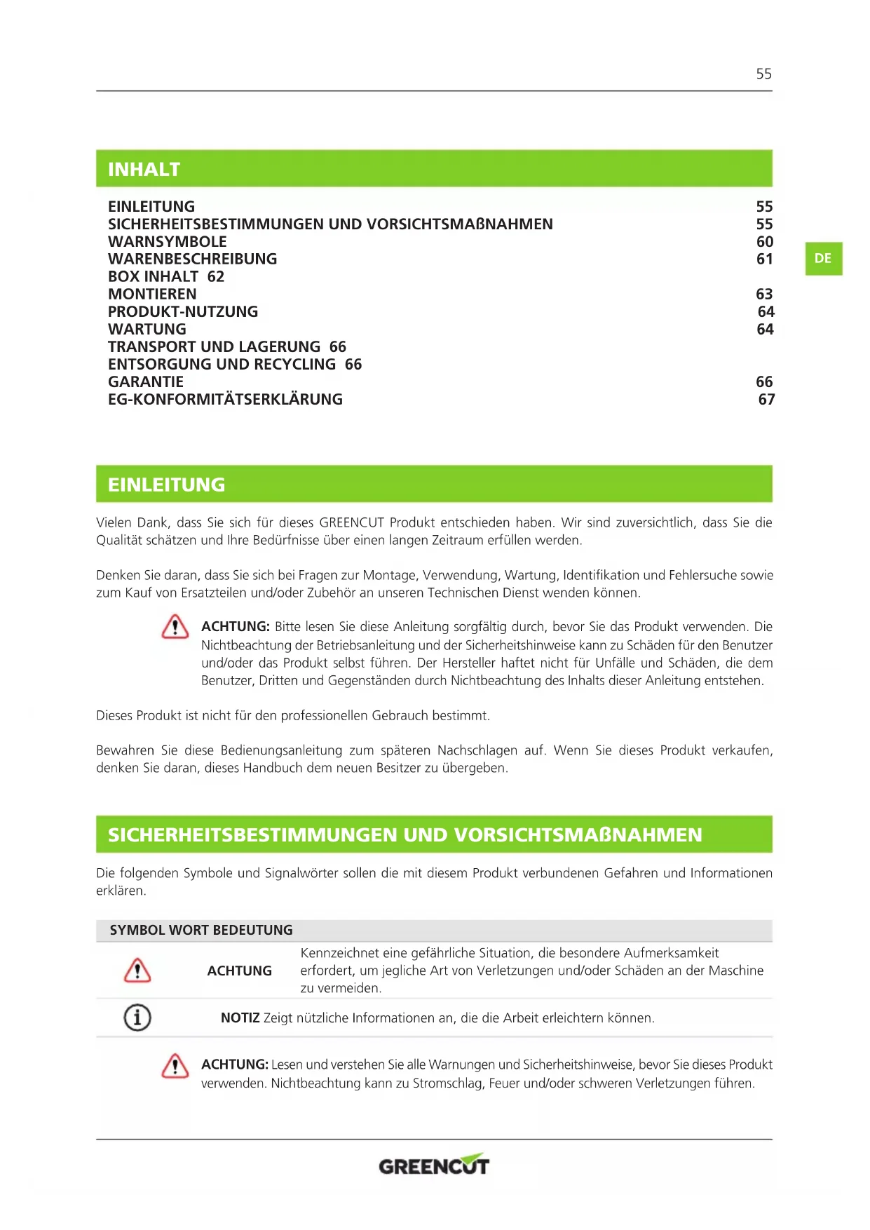 EINLEITUNG Vielen Dank, dass Sie sich für dieses GREENCUT Produkt entschieden haben. Wir sind zuversichtlich, dass Sie die Qualität schätzen und Ihre Bedürfnisse über einen langen Zeitraum erfüllen werden. Denken Sie daran, dass Sie sich bei Fragen zur Montage, Verwendung, Wartung, Identikation und Fehlersuche sowie zum Kauf von Ersatzteilen und/oder Zubehör an unseren Technischen Dienst wenden können. ACHTUNG: Bitte lesen Sie diese Anleitung sorgfältig durch, bevor Sie das Produkt verwenden. Die Nichtbeachtung der Betriebsanleitung und der Sicherheitshinweise kann zu Schäden für den Benutzer und/oder das Produkt selbst führen. Der Hersteller haftet nicht für Unfälle und Schäden, die dem Benutzer, Dritten und Gegenständen durch Nichtbeachtung des Inhalts dieser Anleitung entstehen. Dieses Produkt ist nicht für den professionellen Gebrauch bestimmt. Bewahren Sie diese Bedienungsanleitung zum späteren Nachschlagen auf. Wenn Sie dieses Produkt verkaufen, denken Sie daran, dieses Handbuch dem neuen Besitzer zu übergeben. SICHERHEITSBESTIMMUNGEN UND VORSICHTSMAßNAHMEN Die folgenden Symbole und Signalwörter sollen die mit diesem Produkt verbundenen Gefahren und Informationen erklären.
