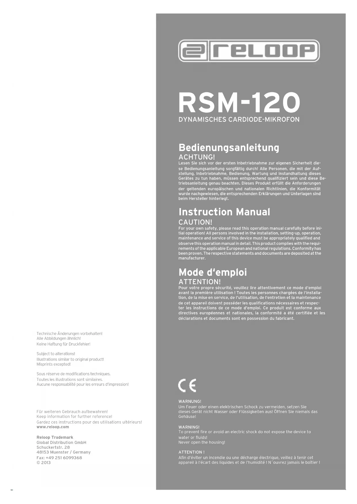 DEUTSCH Bedienungsanleitung ACHTUNG! Lesen Sie sich vor der ersten Inbetriebnahme zur eigenen Sicherheit die-se Bedienungsanleitung sorgfältig durch! Alle Personen, die mit der Auf-stellung, Inbetriebnahme, Bedienung, Wartung und Instandhaltung dieses Gerätes zu tun haben, müssen entsprechend qualiziert sein und diese Be-triebsanleitung genau beachten. Dieses Produkt erfüllt die Anforderungen der geltenden europäischen und nationalen Richtlinien, die Konformität wurde nachgewiesen, die entsprechenden Erklärungen und Unterlagen sind beim Hersteller hinterlegt. Instruction Manual CAUTION! For your own safety, please read this operation manual carefully before ini-tial operation! All persons involved in the installation, setting-up, operation, maintenance and service of this device must be appropriately qualied and observe this operation manual in detail. This product complies with the requi-rements of the applicable European and national regulations. Conformity has been proven. The respective statements and documents are deposited at the manufacturer. Mode d‘emploi ATTENTION! Pour votre propre sécurité, veuillez lire attentivement ce mode d‘emploi avant la première utilisation ! Toutes les personnes chargées de l‘installa-tion, de la mise en service, de l‘utilisation, de l‘entretien et la maintenance de cet appareil doivent posséder les qualications nécessaires et respec-ter les instructions de ce mode d‘emploi. Ce produit est conforme aux directives européennes et nationales, la conformité a été certiée et les déclarations et documents sont en possession du fabricant. RSM-120 WARNUNG!Um Feuer oder einen elektrischen Schock zu vermeiden, setzen Sie dieses Gerät nicht Wasser oder Flüssigkeiten aus! Öffnen Sie niemals das Gehäuse!WARNING!To prevent re or avoid an electric shock do not expose the device to water or uids! Never open the housing!ATTENTION !An d‘éviter un incendie ou une décharge électrique, veillez à tenir cet appareil à l‘écart des liquides et de l‘humidité ! N´ouvrez jamais le boîtier !Für weiteren Gebrauch aufbewahren!Keep information for further reference!Gardez ces instructions pour des utilisations ultérieurs!www.reloop.comReloop TrademarkGlobal Distribution GmbHSchuckertstr. 2848153 Muenster / GermanyFax: +49 251 6099368© 2013Technische Änderungen vorbehalten! Alle Abbildungen ähnlich!Keine Haftung für Druckfehler!Subject to alterations!Illustrations similar to original product!Misprints excepted!Sous réserve de modications techniques.Toutes les illustrations sont similaires.Aucune responsabilité pour les erreurs d‘impression! DYNAMISCHES CARDIODE-MIKROFONDEUTSCH Wir gratulieren Ihnen zum Kauf des Reloop RSM-120. Vielen Dank, dass Sie unserer Technologie Ihr Vertrauen schenken. Vor Inbetriebnahme bitten wir Sie, alle Anweisungen sorgfältig zu studieren und zu befolgen. Nehmen Sie das Reloop RSM-120 aus der Verpackung. Bitte überprüfen Sie vor der ersten Inbetriebnahme, ob kein offensichtli