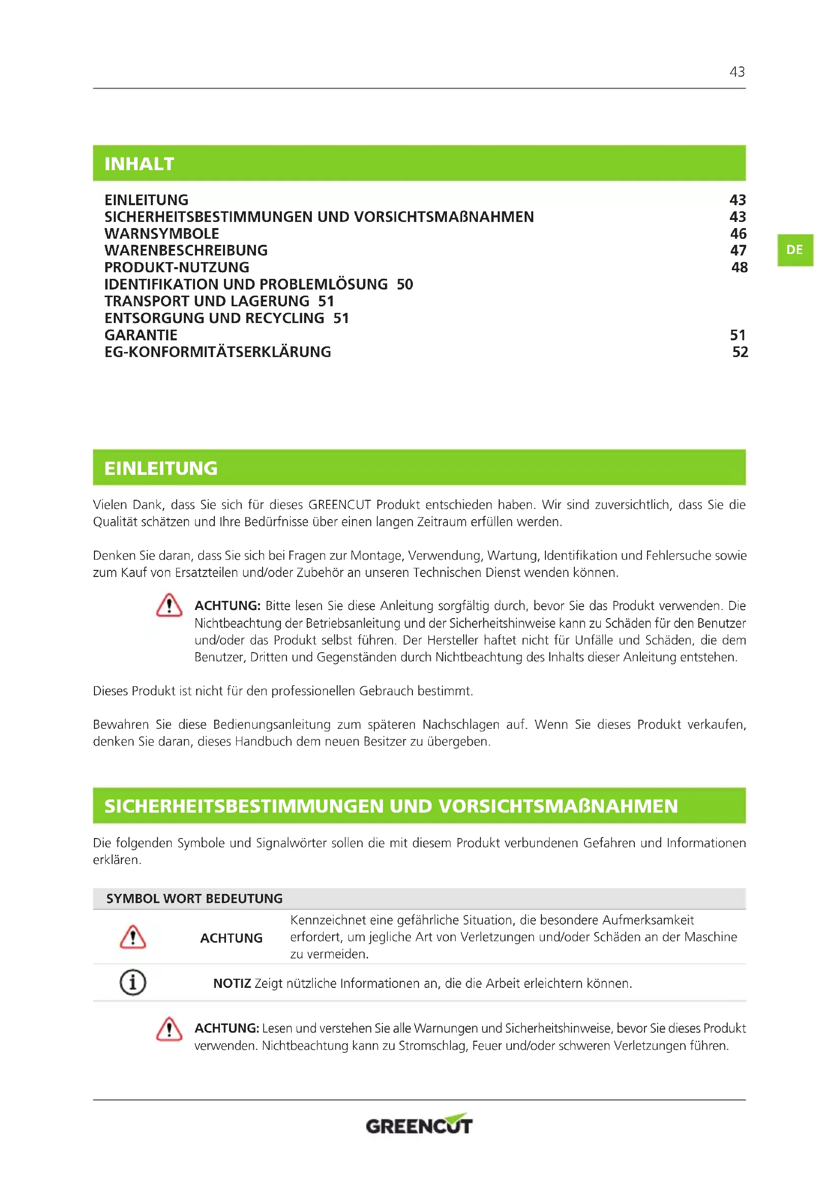 EINLEITUNG Vielen Dank, dass Sie sich für dieses GREENCUT Produkt entschieden haben. Wir sind zuversichtlich, dass Sie die Qualität schätzen und Ihre Bedürfnisse über einen langen Zeitraum erfüllen werden. Denken Sie daran, dass Sie sich bei Fragen zur Montage, Verwendung, Wartung, Identikation und Fehlersuche sowie zum Kauf von Ersatzteilen und/oder Zubehör an unseren Technischen Dienst wenden können. ACHTUNG: Bitte lesen Sie diese Anleitung sorgfältig durch, bevor Sie das Produkt verwenden. Die Nichtbeachtung der Betriebsanleitung und der Sicherheitshinweise kann zu Schäden für den Benutzer und/oder das Produkt selbst führen. Der Hersteller haftet nicht für Unfälle und Schäden, die dem Benutzer, Dritten und Gegenständen durch Nichtbeachtung des Inhalts dieser Anleitung entstehen. Dieses Produkt ist nicht für den professionellen Gebrauch bestimmt. Bewahren Sie diese Bedienungsanleitung zum späteren Nachschlagen auf. Wenn Sie dieses Produkt verkaufen, denken Sie daran, dieses Handbuch dem neuen Besitzer zu übergeben. SICHERHEITSBESTIMMUNGEN UND VORSICHTSMAßNAHMEN Die folgenden Symbole und Signalwörter sollen die mit diesem Produkt verbundenen Gefahren und Informationen erklären.
