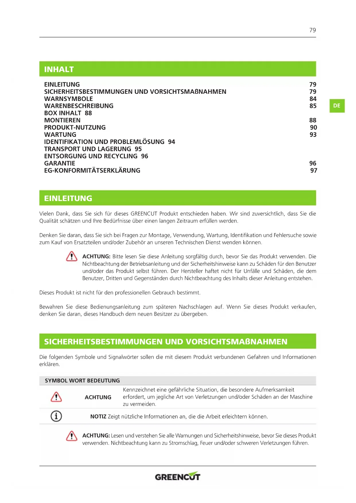 EINLEITUNG Vielen Dank, dass Sie sich für dieses GREENCUT Produkt entschieden haben. Wir sind zuversichtlich, dass Sie die Qualität schätzen und Ihre Bedürfnisse über einen langen Zeitraum erfüllen werden. Denken Sie daran, dass Sie sich bei Fragen zur Montage, Verwendung, Wartung, Identikation und Fehlersuche sowie zum Kauf von Ersatzteilen und/oder Zubehör an unseren Technischen Dienst wenden können. ACHTUNG: Bitte lesen Sie diese Anleitung sorgfältig durch, bevor Sie das Produkt verwenden. Die Nichtbeachtung der Betriebsanleitung und der Sicherheitshinweise kann zu Schäden für den Benutzer und/oder das Produkt selbst führen. Der Hersteller haftet nicht für Unfälle und Schäden, die dem Benutzer, Dritten und Gegenständen durch Nichtbeachtung des Inhalts dieser Anleitung entstehen. Dieses Produkt ist nicht für den professionellen Gebrauch bestimmt. Bewahren Sie diese Bedienungsanleitung zum späteren Nachschlagen auf. Wenn Sie dieses Produkt verkaufen, denken Sie daran, dieses Handbuch dem neuen Besitzer zu übergeben. SICHERHEITSBESTIMMUNGEN UND VORSICHTSMAßNAHMEN Die folgenden Symbole und Signalwörter sollen die mit diesem Produkt verbundenen Gefahren und Informationen erklären.