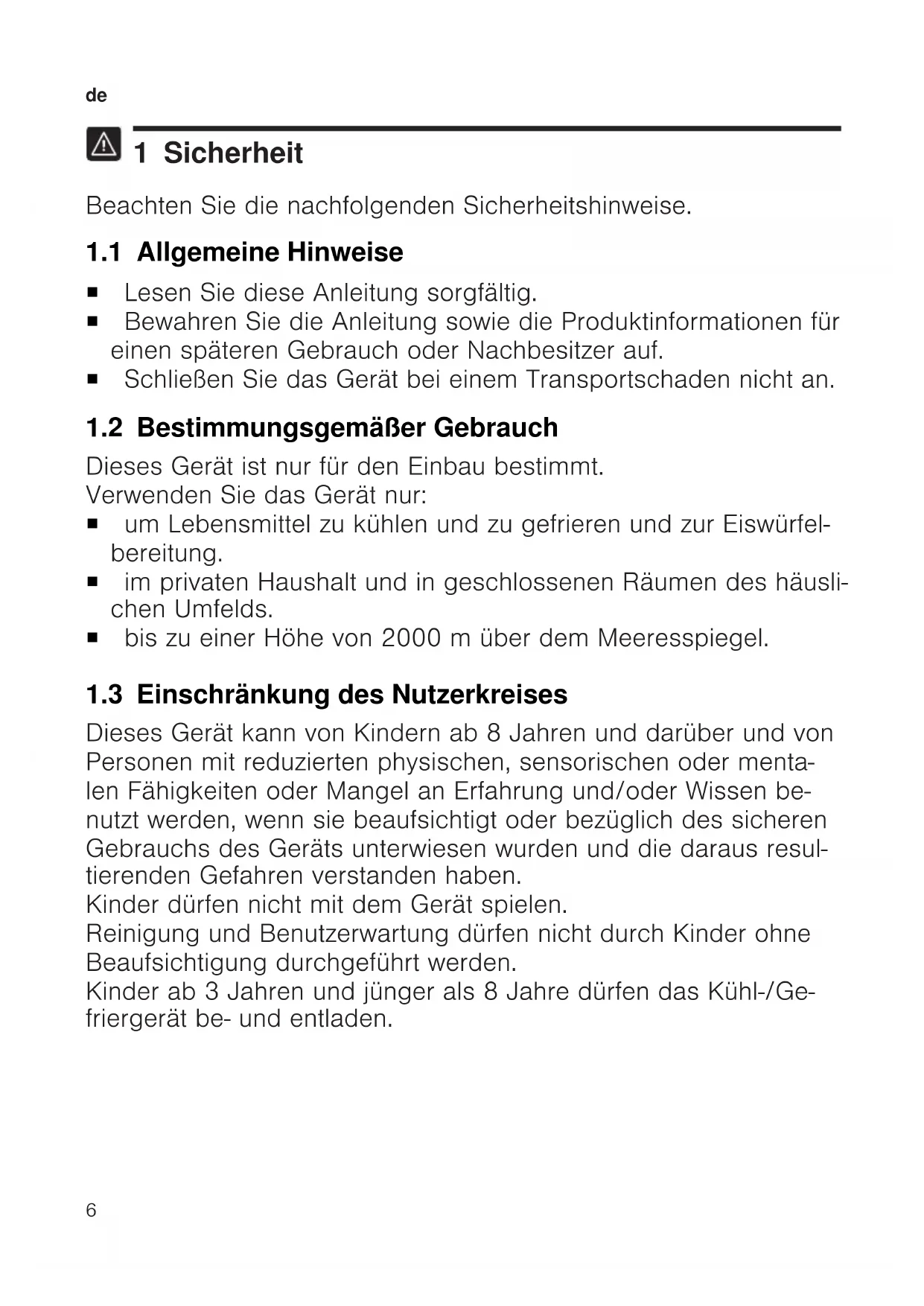 1 Sicherheit Beachten Sie die nachfolgenden Sicherheitshinweise. 1.1 Allgemeine Hinweise ¡ Lesen Sie diese Anleitung sorgfältig. ¡ Bewahren Sie die Anleitung sowie die Produktinformationen für einen späteren Gebrauch oder Nachbesitzer auf. ¡ Schließen Sie das Gerät bei einem Transportschaden nicht an. 1.2 Bestimmungsgemäßer Gebrauch Dieses Gerät ist nur für den Einbau bestimmt. Verwenden Sie das Gerät nur: ¡ um Lebensmittel zu kühlen und zu gefrieren und zur Eiswürfel- bereitung. ¡ im privaten Haushalt und in geschlossenen Räumen des häusli- chen Umfelds. ¡ bis zu einer Höhe von 2000 m über dem Meeresspiegel. 1.3 Einschränkung des Nutzerkreises Dieses Gerät kann von Kindern ab 8 Jahren und darüber und von Personen mit reduzierten physischen, sensorischen oder menta- len Fähigkeiten oder Mangel an Erfahrung und/oder Wissen be- nutzt werden, wenn sie beaufsichtigt oder bezüglich des sicheren Gebrauchs des Geräts unterwiesen wurden und die daraus resul- tierenden Gefahren verstanden haben. Kinder dürfen nicht mit dem Gerät spielen. Reinigung und Benutzerwartung dürfen nicht durch Kinder ohne Beaufsichtigung durchgeführt werden. Kinder ab 3Jahren und jünger als 8Jahre dürfen das Kühl-/Ge- friergerät be- und entladen.de