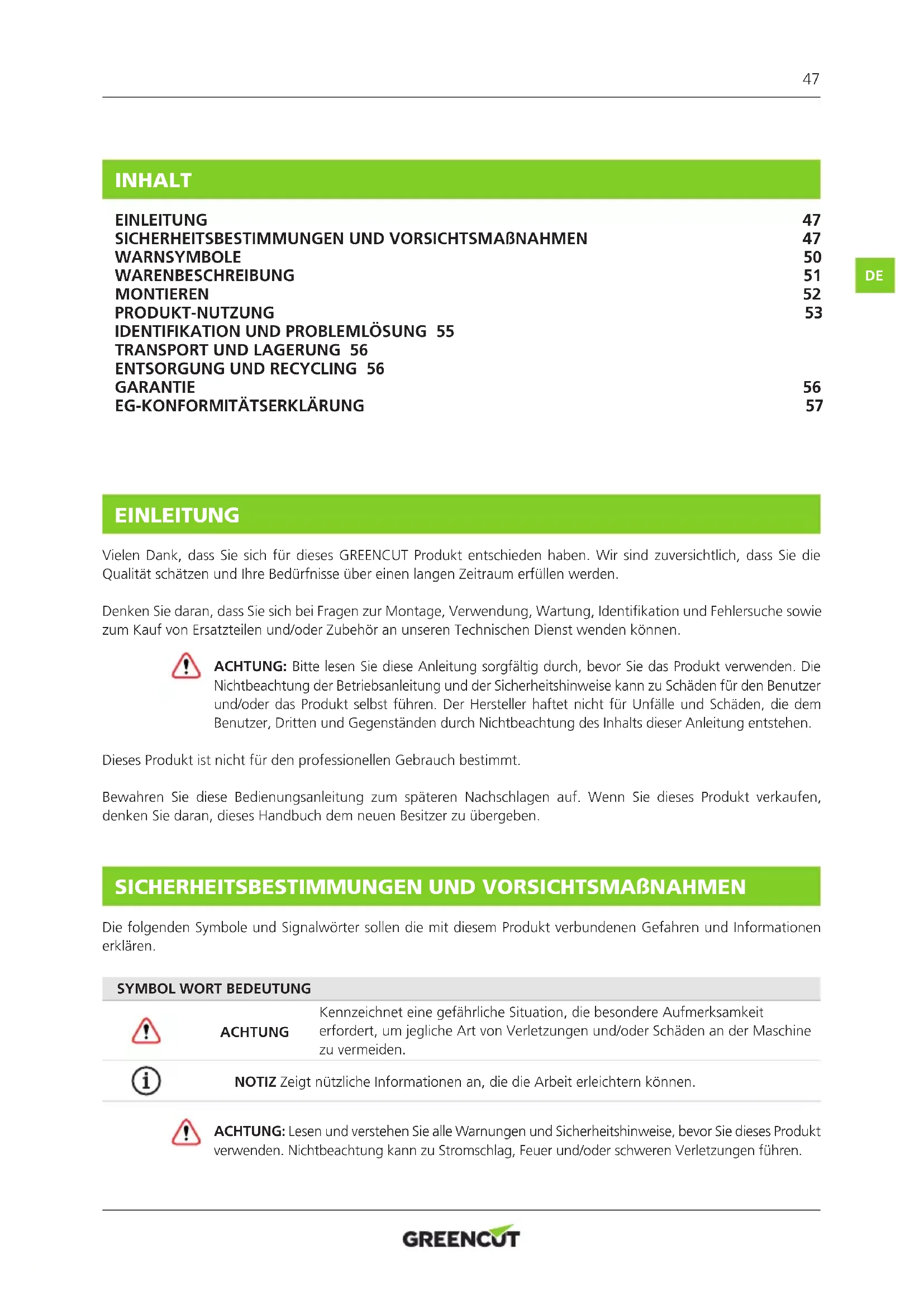 EINLEITUNG Vielen Dank, dass Sie sich für dieses GREENCUT Produkt entschieden haben. Wir sind zuversichtlich, dass Sie die Qualität schätzen und Ihre Bedürfnisse über einen langen Zeitraum erfüllen werden. Denken Sie daran, dass Sie sich bei Fragen zur Montage, Verwendung, Wartung, Identikation und Fehlersuche sowie zum Kauf von Ersatzteilen und/oder Zubehör an unseren Technischen Dienst wenden können. ACHTUNG: Bitte lesen Sie diese Anleitung sorgfältig durch, bevor Sie das Produkt verwenden. Die Nichtbeachtung der Betriebsanleitung und der Sicherheitshinweise kann zu Schäden für den Benutzer und/oder das Produkt selbst führen. Der Hersteller haftet nicht für Unfälle und Schäden, die dem Benutzer, Dritten und Gegenständen durch Nichtbeachtung des Inhalts dieser Anleitung entstehen. Dieses Produkt ist nicht für den professionellen Gebrauch bestimmt. Bewahren Sie diese Bedienungsanleitung zum späteren Nachschlagen auf. Wenn Sie dieses Produkt verkaufen, denken Sie daran, dieses Handbuch dem neuen Besitzer zu übergeben. SICHERHEITSBESTIMMUNGEN UND VORSICHTSMAßNAHMEN Die folgenden Symbole und Signalwörter sollen die mit diesem Produkt verbundenen Gefahren und Informationen erklären.