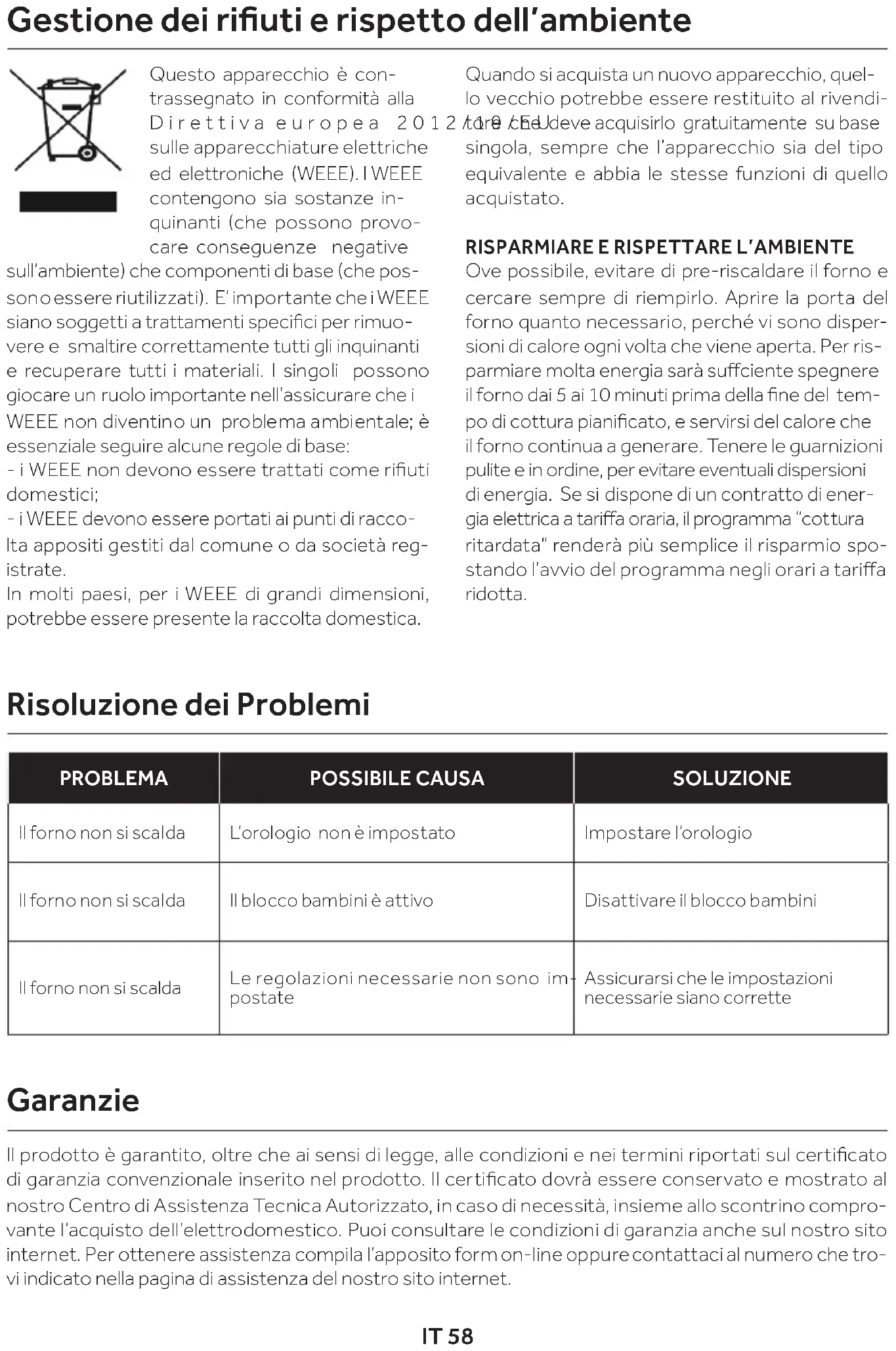 Achtung! Vergewissern Sie sich, dass das Gerät abgekühlt ist bevor Sie es berühren. Achten Sie auf heiße Ober- ächen, da sie Verbrennungen verursachen können. Verwenden Sie destilliertes- oder Trinkwasser. 300 mlDE 77 Entsorgung und umweltschutz Dieses Elektrohaushalts- gerät ist in Einklang mit der EU-Richtlinie 2012/19/EU über Elektro- und Elektron- ik-Altgeräte (WEEE) geken- nzeichnet. Elektro- und Ele- ktronik-Altgeräte enthalten umweltschädigende Substanzen, aber auch Grundkomponenten, die wiederverwendet werden können. Daher ist es wichtig, Elek- tro- und Elektronik-Altgeräte spezisch zu entsorgen, um alle schädlichen Substanzen zu entfernen und wiederverwendbare Teile zu recyceln. Verbraucher leisten einen wichtigen Beitrag zur Gewährleistung, dass Elektro- und Elektronik-Altgeräte nicht zu einem Umwelt- problem werden. Halten Sie sich daher bitte an die folgenden Grundregeln: - Elektro- und Elektronik-Altgeräte dürfen nicht mit dem normalen Hausmüll entsorgt werden. - Elektro-und Elektronik-Altgeräte müssen bei zugelassenen Sammelstellen abgegeben werden, die von der Stadtverwaltung oder an- deren zuständigen Stellen verwaltet werden. In vielen Ländern wird für die Entsorgung großer Elektro- und Elektronik-Altgeräte ein Abholservice angeboten. Beim Kauf eines Häug gestellte fragen Störung Mögliche ursache Lösung der Backofen wird nicht heiß.Die Uhr ist nicht eingestellt. Uhr einstellen.Der Backofen wird nicht heiß. Die Kindersicherung ist eingeschaltet. Kindersicherung deaktivieren. Der Backofen wird nicht heiß.Garfunktion und Temperatur wurden nicht eingestellt. Prüfen, ob die nötigen Einstellun- gen richtig sind. neuen Geräts wird das alte möglicherweise vom Händler zurückgenommen, der es kos- tenfrei entsorgt, sofern das neue Gerät von einem ähnlichen Typ ist und die gleiche Funk- tion erfüllt wie das Altgerät.