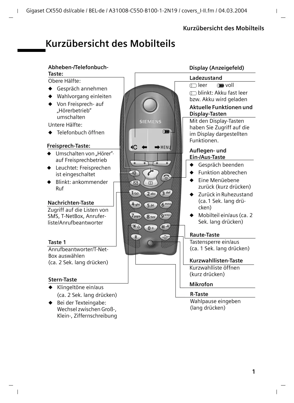 - Gigaset CX550 dsl/cable / BEL-de / A31008-C550-B100-1-2N19 / CX550_voiceIVZ.fm / 04.03.2004 Inhaltsverzeichnis Inhaltsverzeichnis Kurzübersicht des Mobilteils p. 1