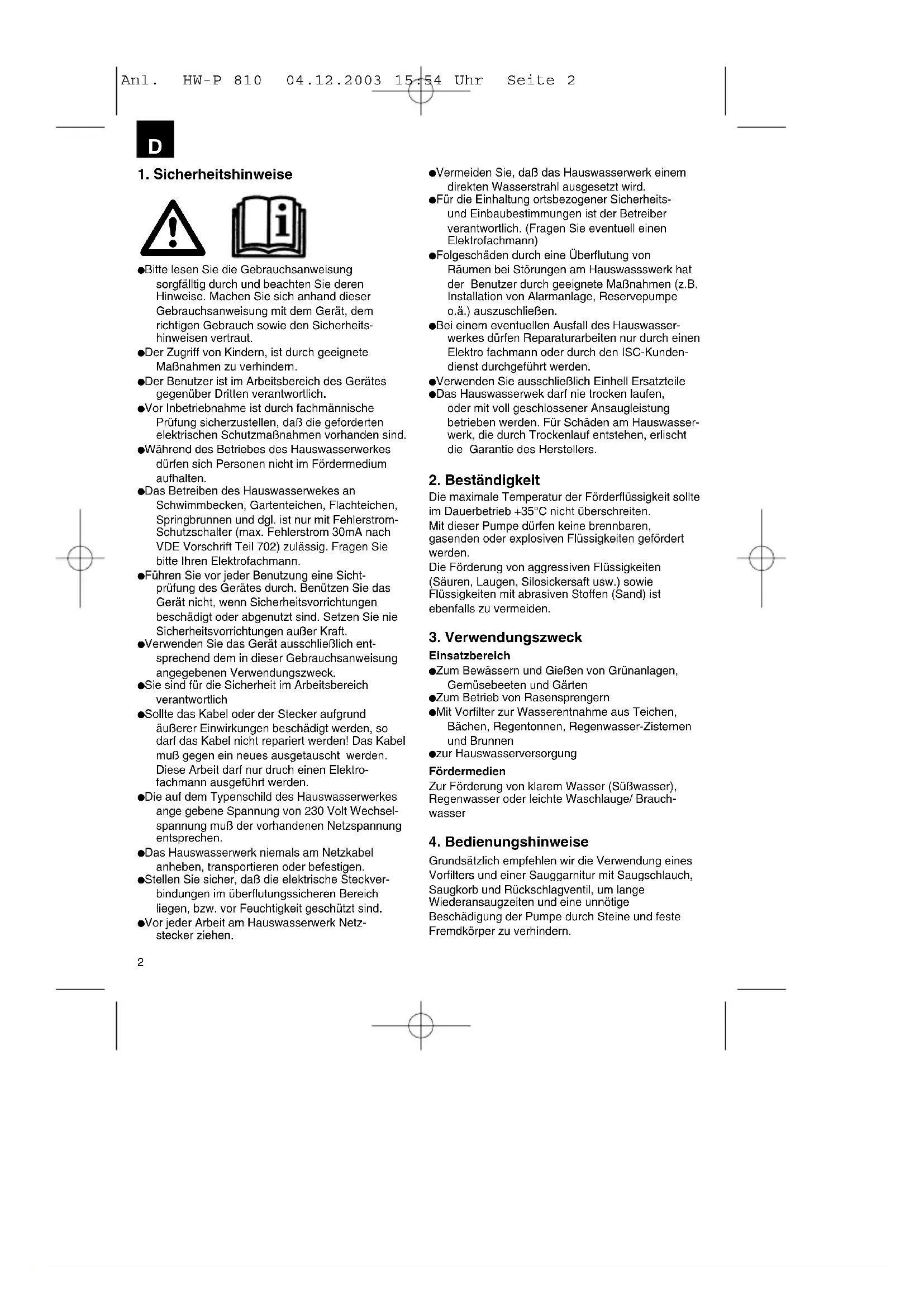 Bitte lesen Sie die Gebrauchsanweisung sorgfälltig durch und beachten Sie deren Hinweise. Machen Sie sich anhand dieser Gebrauchsanweisung mit dem Gerät, dem richtigen Gebrauch sowie den Sicherheits- hinweisen vertraut. Der Zugriff von Kindern, ist durch geeignete Maßnahmen zu verhindern. Der Benutzer ist im Arbeitsbereich des Gerätes gegenüber Dritten verantwortlich. Vor Inbetriebnahme ist durch fachmännische Prüfung sicherzustellen, daß die geforderten elektrischen Schutzmaßnahmen vorhanden sind. Während des Betriebes des Hauswasserwerkes dürfen sich Personen nicht im Fördermedium aufhalten. Das Betreiben des Hauswasserwekes an Schwimmbecken, Gartenteichen, Flachteichen, Springbrunnen und dgl. ist nur mit Fehlerstrom- Schutzschalter (max. Fehlerstrom 30mA nach VDE Vorschrift Teil 702) zulässig. Fragen Sie bitte Ihren Elektrofachmann. Führen Sie vor jeder Benutzung eine Sicht- prüfung des Gerätes durch. Benützen Sie das Gerät nicht, wenn Sicherheitsvorrichtungen beschädigt oder abgenutzt sind. Setzen Sie nie Sicherheitsvorrichtungen außer Kraft. Verwenden Sie das Gerät ausschließlich ent- sprechend dem in dieser Gebrauchsanweisung angegebenen Verwendungszweck. Sie sind für die Sicherheit im Arbeitsbereich verantwortlich Sollte das Kabel oder der Stecker aufgrund äußerer Einwirkungen beschädigt werden, so darf das Kabel nicht repariert werden! Das Kabel muß gegen ein neues ausgetauscht werden. Diese Arbeit darf nur druch einen Elektro- fachmann ausgeführt werden. Die auf dem Typenschild des Hauswasserwerkes ange gebene Spannung von 230 Volt Wechsel- spannung muß der vorhandenen Netzspannung entsprechen. Das Hauswasserwerk niemals am Netzkabel anheben, transportieren oder befestigen. Stellen Sie sicher, daß die elektrische Steckver- bindungen im überflutungssicheren Bereich liegen, bzw. vor Feuchtigkeit geschützt sind. Vor jeder Arbeit am Hauswasserwerk Netz- stecker ziehen. Vermeiden Sie, daß das Hauswasserwerk einem direkten Wasserstrahl ausgesetzt wird. Für die Einhaltung ortsbezogener Sicherheits- und Einbaubestimmungen ist der Betreiber verantwortlich. (Fragen Sie eventuell einen Elektrofachmann) Folgeschäden durch eine Überflutung von Räumen bei Störungen am Hauswassswerk hat der Benutzer durch geeignete Maßnahmen (z.B. Installation von Alarmanlage, Reservepumpe o.ä.) auszuschließen. Bei einem eventuellen Ausfall des Hauswasser- werkes dürfen Reparaturarbeiten nur durch einen Elektro fachmann oder durch den ISC-Kunden- dienst durchgeführt werden. Verwenden Sie ausschließlich Einhell Ersatzteile Das Hauswasserwek darf nie trocken laufen, oder mit voll geschlossener Ansaugleistung betrieben werden. Für Schäden am Hauswasser- werk, die durch Trockenlauf entstehen, erlischt die Garantie des Herstellers.