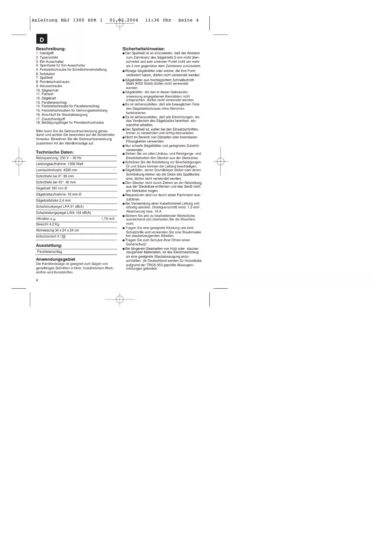 Achtung!Gehörschutz und Schutzbrille tragen. Anleitung HSJ 1300 SPK 1 01.03.2004 11:36 Uhr Seite 51