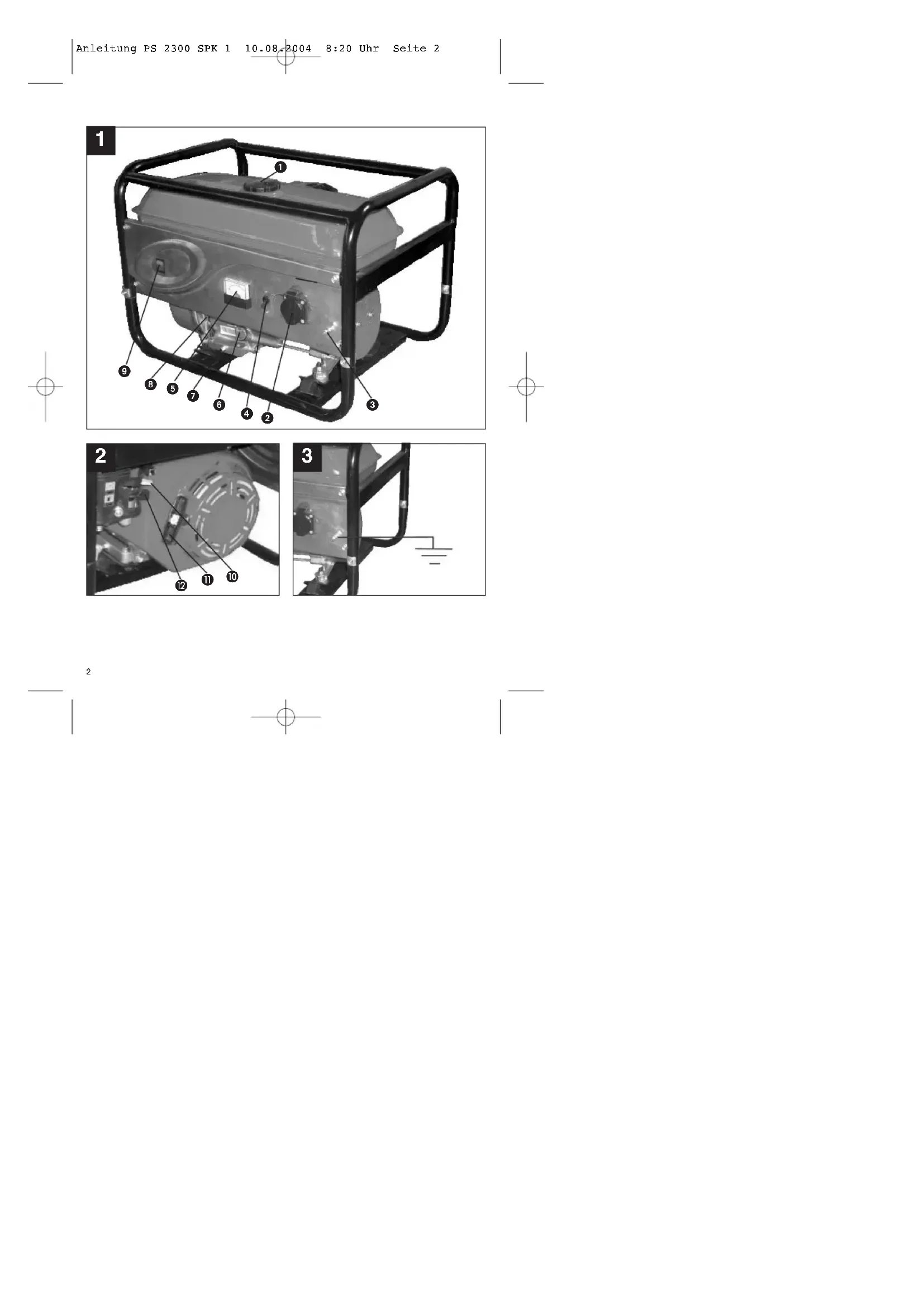 1 Tankdeckel 2 230 V ~ Steckdose 3Erdungsanschluss 4 Sicherheitsauslöser 5Voltmeter 6 Öleinfüllschraube 7 Ölablassschraube 8 Ölmangelsicherung 9 Ein-/Ausschalter 10 Chokehebel 11 Reversierstarteinrichtung 12 Benzinhahn