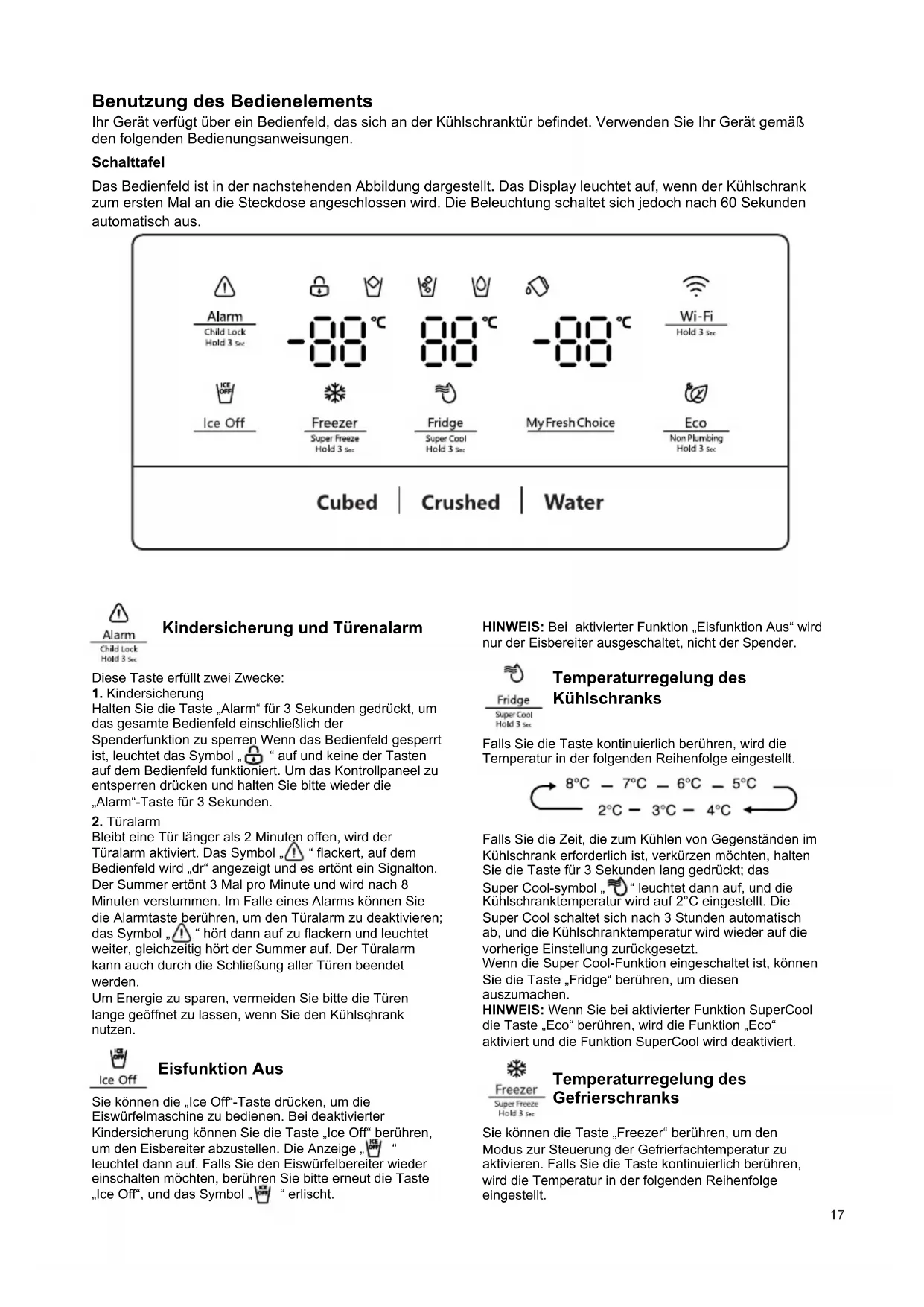 Bleibt eine Tür länger als 2 Minuten offen, wird der Türalarm aktiviert. Das Symbol „ “ flackert, auf dem Bedienfeld wird „dr“ angezeigt und es ertönt ein Signalton. Der Summer ertönt 3 Mal pro Minute und wird nach 8 Minuten verstummen. Im Falle eines Alarms können Sie die Alarmtaste berühren, um den Türalarm zu deaktivieren; das Symbol „ “ hört dann auf zu flackern und leuchtet weiter, gleichzeitig hört der Summer auf. Der Türalarm kann auch durch die Schließung aller Türen beendet werden. Um Energie zu sparen, vermeiden Sie bitte die Türen lange geöffnet zu lassen, wenn Sie den Kühlschrank nutzen. Eisfunktion Aus Sie können die „Ice Off“-Taste drücken, um die Eiswürfelmaschine zu bedienen. Bei deaktivierter Kindersicherung können Sie die Taste „Ice Off“ berühren, um den Eisbereiter abzustellen. Die Anzeige „ “ leuchtet dann auf. Falls Sie den Eiswürfelbereiter wieder einschalten möchten, berühren Sie bitte erneut die Taste „Ice Off“, und das Symbol „ “ erlischt. HINWEIS: Bei aktivierter Funktion „Eisfunktion Aus“ wird nur der Eisbereiter ausgeschaltet, nicht der Spender. Temperaturregelung des Kühlschranks Falls Sie die Taste kontinuierlich berühren, wird die Temperatur in der folgenden Reihenfolge eingestellt. Falls Sie die Zeit, die zum Kühlen von Gegenständen im Kühlschrank erforderlich ist, verkürzen möchten, halten Sie die Taste für 3 Sekunden lang gedrückt; das Super Cool-symbol „ “ leuchtet dann auf, und die Kühlschranktemperatur wird auf 2°C eingestellt. Die Super Cool schaltet sich nach 3 Stunden automatisch ab, und die Kühlschranktemperatur wird wieder auf die vorherige Einstellung zurückgesetzt. Wenn die Super Cool-Funktion eingeschaltet ist, können Sie die Taste „Fridge“ berühren, um diesen auszumachen. HINWEIS: Wenn Sie bei aktivierter Funktion SuperCool die Taste „Eco“ berühren, wird die Funktion „Eco“ aktiviert und die Funktion SuperCool wird deaktiviert. Temperaturregelung des Gefrierschranks Sie können die Taste „Freezer“ berühren, um den Modus zur Steuerung der Gefrierfachtemperatur zu aktivieren. Falls Sie die Taste kontinuierlich berühren, wird die Temperatur in der folgenden Reihenfolge eingestellt. 17•