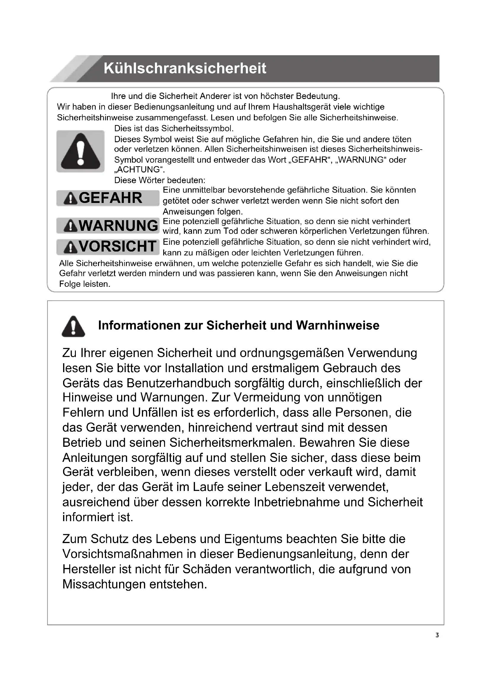 29Ihre und die Sicherheit Anderer ist von höchster Bedeutung. Kühlschranksicherheit Wir haben in dieser Bedienungsanleitung und auf Ihrem Haushaltsgerät viele wichtige Sicherheitshinweise zusammengefasst. Lesen und befolgen Sie alle Sicherheitshinweise. Dies ist das Sicherheitssymbol. Dieses Symbol weist Sie auf mögliche Gefahren hin, die Sie und andere töten oder verletzen können. Allen Sicherheitshinweisen ist dieses Sicherheitshinweis- Symbol vorangestellt und entweder das Wort „GEFAHR“, „WARNUNG“ oder „ACHTUNG“. Diese Wörter bedeuten: GEFAHR WARNUNG VORSICHT Eine unmittelbar bevorstehende gefährliche Situation. Sie könnten getötet oder schwer verletzt werden wenn Sie nicht sofort den Anweisungen folgen. Eine potenziell gefährliche Situation, so denn sie nicht verhindert wird, kann zum Tod oder schweren körperlichen Verletzungen führen. Eine potenziell gefährliche Situation, so denn sie nicht verhindert wird, kann zu mäßigen oder leichten Verletzungen führen. Alle Sicherheitshinweise erwähnen, um welche potenzielle Gefahr es sich handelt, wie Sie die Gefahr verletzt werden mindern und was passieren kann, wenn Sie den Anweisungen nicht Folge leisten. Informationen zur Sicherheit und Warnhinweise Zu Ihrer eigenen Sicherheit und ordnungsgemäßen Verwendung lesen Sie bitte vor Installation und erstmaligem Gebrauch des Geräts das Benutzerhandbuch sorgfältig durch, einschließlich der Hinweise und Warnungen. Zur Vermeidung von unnötigen Fehlern und Unfällen ist es erforderlich, dass alle Personen, die das Gerät verwenden, hinreichend vertraut sind mit dessen Betrieb und seinen Sicherheitsmerkmalen. Bewahren Sie diese Anleitungen sorgfältig auf und stellen Sie sicher, dass diese beim Gerät verbleiben, wenn dieses verstellt oder verkauft wird, damit jeder, der das Gerät im Laufe seiner Lebenszeit verwendet, ausreichend über dessen korrekte Inbetriebnahme und Sicherheit informiert ist. Zum Schutz des Lebens und Eigentums beachten Sie bitte die Vorsichtsmaßnahmen in dieser Bedienungsanleitung, denn der Hersteller ist nicht für Schäden verantwortlich, die aufgrund von Missachtungen entstehen.Sicherheit für Kinder und Menschen mit Gebrechen Nach EN-Norm Dieses Gerät kann von Kindern von 8 Jahren und älter sowie Personen mit eingeschränkten körperlichen, sensorischen bzw. geistigen Fähigkeiten oder mangelnder Erfahrung und Wissen verwendet werden, wenn sie eine Beaufsichtigung bzw. Anweisung für die Nutzung der Maschine auf sichere Weise erfahren und die Risiken gekannt haben. Die Kinder dürfen nicht mit dem Gerät spielen. Die Reinigung und Wartung dürfen nicht von Kindern ohne Aufsicht durchgeführt werden. Die Kinder im Alter von 3 bis 8 Jahren dürfen Kühlgeräte be- und entladen. Nach IEC-Norm Dieses Gerät ist nicht für die Verwendung von Personen (auch Kinder) geeignet, die körperlich, sensorisch oder geistig behindert sind oder keine nötige Erfahrung oder ausreichend Kenntnis von dem Produkt haben, außer sie von einer Person, die für ihre Sicherheit verantwortlich ist, Anweisungen für den Gebrauch des Geräts erhalten haben oder von dieser beaufsichtigt werden. Die Kinder sollten beaufsichtigt werden, um sicherzustellen, dass sie nicht mit dem Gerät spielen. Halten Sie alle Verpackungsteile von Kinder fern, weil es die Gefahr des Erstickens besteht. Ziehen Sie den Stecker aus der Buchse, wenn Sie das Gerät entsorgen, schneiden Sie das Verbindungskabel (so nah am Gerät wie möglich) ab und entfernen Sie die Tür, um zu vermeiden, dass spielende Kinder Stromschläge erhalten, wenn sie sich darin einschließen. Wenn Sie das Gerät, mit Magnettürverschluss, gegen eine älteres Gerät mit Schnappschloss an der Tür oder dem Deckel austauschen, achten Sie bitte darauf, das Schnappschloss unbrauchbar zu machen, bevor sie es entsorgen. Dadurch wird die Gefahr vermieden, dass für Kinder daraus eine Todesfalle wird.Allgemeine Sicherheitsvorschriften Dieses Gerät ist für den Haushalt und ähnliche Anwendungen wie: -Mitarbeiter-Küchenbereiche in Läden, Büros und anderen Arbeitsumgebungen vorgesehen. -Bauernhäuser und von Kunden in Hotels, Motels und anderen Wohnräumen; -Bett- und Frühstück-Typ Umgebungen -Gastronomie und ähnliche Non-Retail-Anwendungen Bewahren Sie keine explosiven Stoffe wie Spraydosen mit brennbaren Treibmittel in diesem Gerät. Wenn das Netzkabel beschädigt ist, muss es durch den Hersteller, seinen Kundendienst oder ähnlich qualifizierte Personen ersetzt werden, um eine Gefährdung zu vermeiden. WARNUNG — Halten Sie die Belüftungsöffnungen, die Geräteverkleidung oder die integrierte Struktur von Behinderungen frei . WARNUNG — Verwenden Sie keine mechanischen Vorrichtungen oder anderen Mittel, um den Entfrostungsprozess zu beschleunigen, außer wenn die vom Hersteller empfohlen sind. WARNUNG — Verwenden Sie keine elektrischen Geräte innerhalb des Lebensmittellablagefachs des Gerätes, außer wenn sie die vom Hersteller empfohlenen Typen sind. Das Kältemittel und Isoliertreibgas sind brennbar. Bei der Entsorgung des Geräts handeln Sie es nur bei einem zugelassenen Entsorgungszentrum. Nicht Flamme aussetzen WARNUNG — Stellen Sie bei der Positionierung des Geräts sicher, dass das Netzkabel nicht eingeklemmt oder beschädigt ist. WARNUNG – Füllen Sie das Trinkwasser nur in den Wasserbehälter. WARNUNG — Beschädigen Sie den Kältemittelkreislauf nicht.WARNUNG — Stellen Sie die Mehrfachkupplungssteckdose oder portable Stromversorgung nicht an der Geräterückseite auf Austauschen des LED-Lichts: WARNUNG - Das LED-Licht muss nicht vom Anwender ersetzt werden! Wenn das LED-Licht beschädigt ist, wenden Sie sich an den Kundendienst. Kältemittel Das Kältemittel Isobuten (R600a) ist innerhalb des Kältemittelkreislaufs des Gerätes enthalten, und ein Naturgas mit einer besonders hohen Umweltverträglichkeit ist jedoch brennbar. Während des Transports und der Installation des Gerätes sollen Si