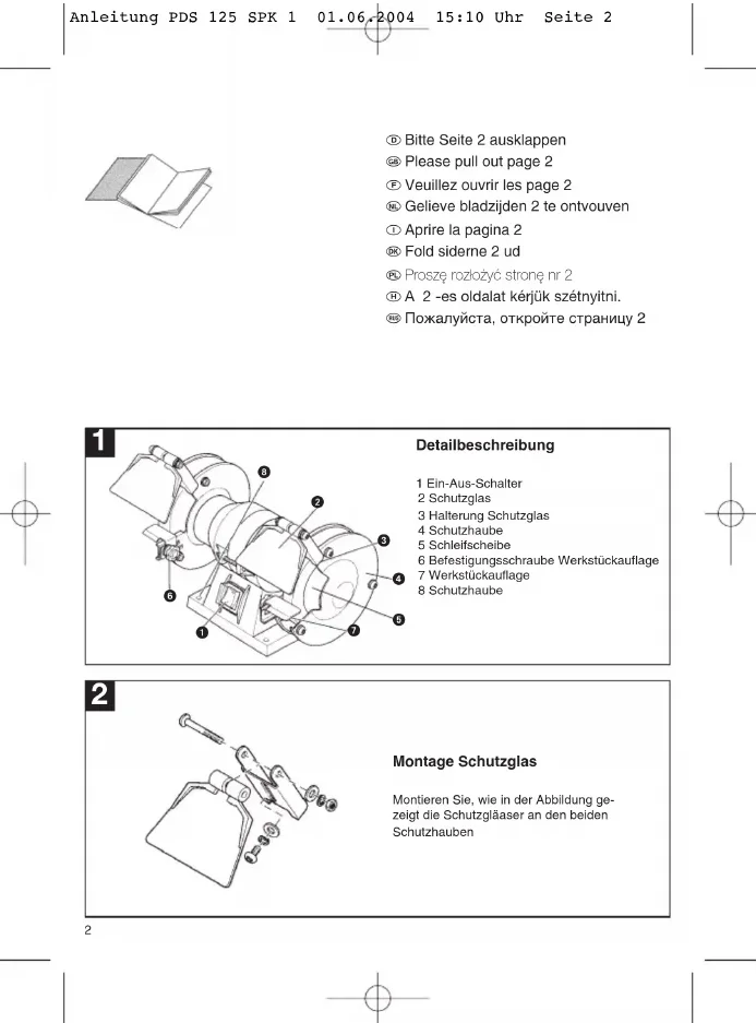 Art.-Nr.: 44.124.21 I.-Nr.: 01014 Anleitung PDS 125 SPK 1 01.06.2004 15:10 Uhr Seite 12 Detailbeschreibung 1 Ein-Aus-Schalter 2 Schutzglas 3 Halterung Schutzglas 4 Schutzhaube 5 Schleifscheibe 6 Befestigungsschraube Werkstückauflage 7 Werkstückauflage 8 Schutzhaube Montage Schutzglas Montieren Sie, wie in der Abbildung ge- zeigt die Schutzgläaser an den beiden Schutzhauben