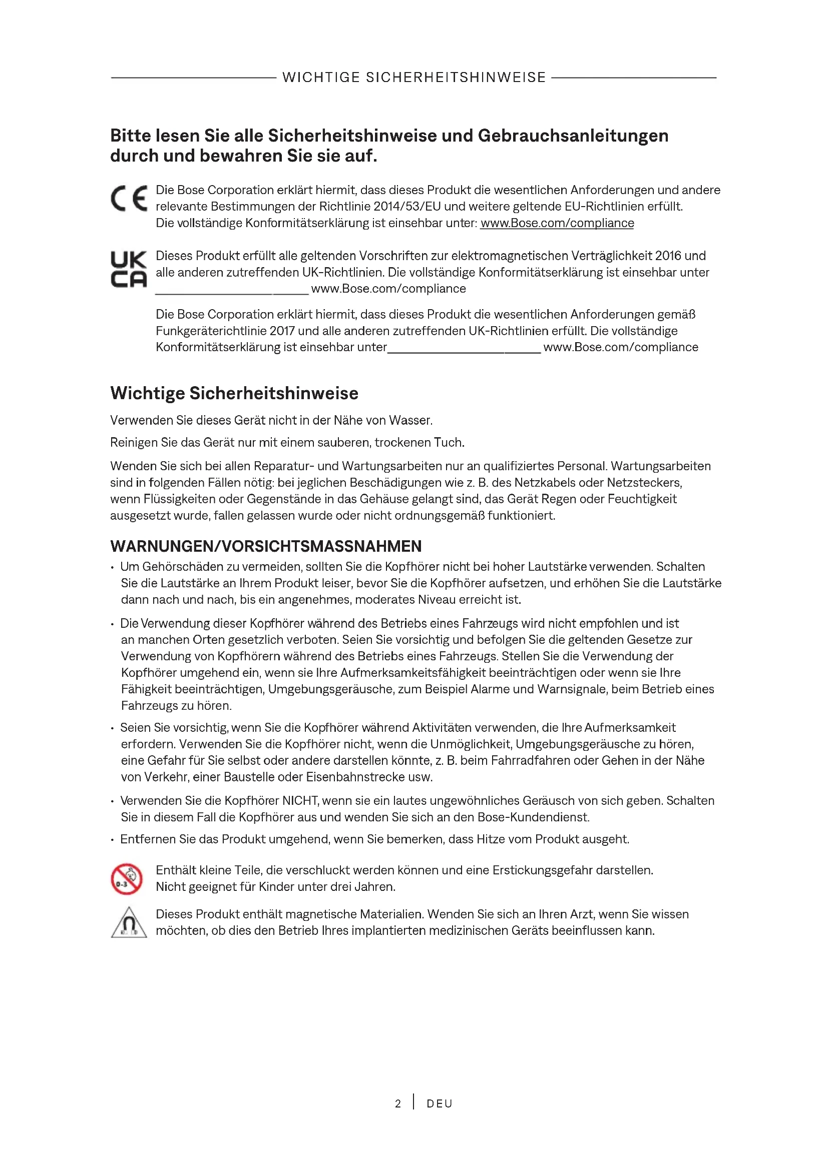 DEU Bitte lesen Sie alle Sicherheitshinweise und Gebrauchsanleitungen durch und bewahren Sie sie auf. Die Bose Corporation erklärt hiermit, dass dieses Produkt die wesentlichen Anforderungen und andere relevante Bestimmungen der Richtlinie 2014/53/EU und weitere geltende EU-Richtlinien erfüllt. Die vollständige Konformitätserklärung ist einsehbar unter: www.Bose.com/compliancewww.Bose.com/compliance Dieses Produkt erfüllt alle geltenden Vorschriften zur elektromagnetischen Verträglichkeit 2016 und alle anderen zutreffenden UK-Richtlinien. Die vollständige Konformitätserklärung ist einsehbar unter www.Bose.com/compliancewww.Bose.com/compliance Die Bose Corporation erklärt hiermit, dass dieses Produkt die wesentlichen Anforderungen gemäß Funkgeräterichtlinie 2017 und alle anderen zutreffenden UK-Richtlinien erfüllt. Die vollständige Konformitätserklärung ist einsehbar unter www.Bose.com/compliancewww.Bose.com/compliance Wichtige Sicherheitshinweise Verwenden Sie dieses Gerät nicht in der Nähe von Wasser. Reinigen Sie das Gerät nur mit einem sauberen, trockenen Tuch. Wenden Sie sich bei allen Reparatur- und Wartungsarbeiten nur an qualifiziertes Personal. Wartungsarbeiten sind in folgenden Fällen nötig: bei jeglichen Beschädigungen wie z. B. des Netzkabels oder Netzsteckers, wenn Flüssigkeiten oder Gegenstände in das Gehäuse gelangt sind, das Gerät Regen oder Feuchtigkeit ausgesetzt wurde, fallen gelassen wurde oder nicht ordnungsgemäß funktioniert. WARNUNGEN/VORSICHTSMASSNAHMEN