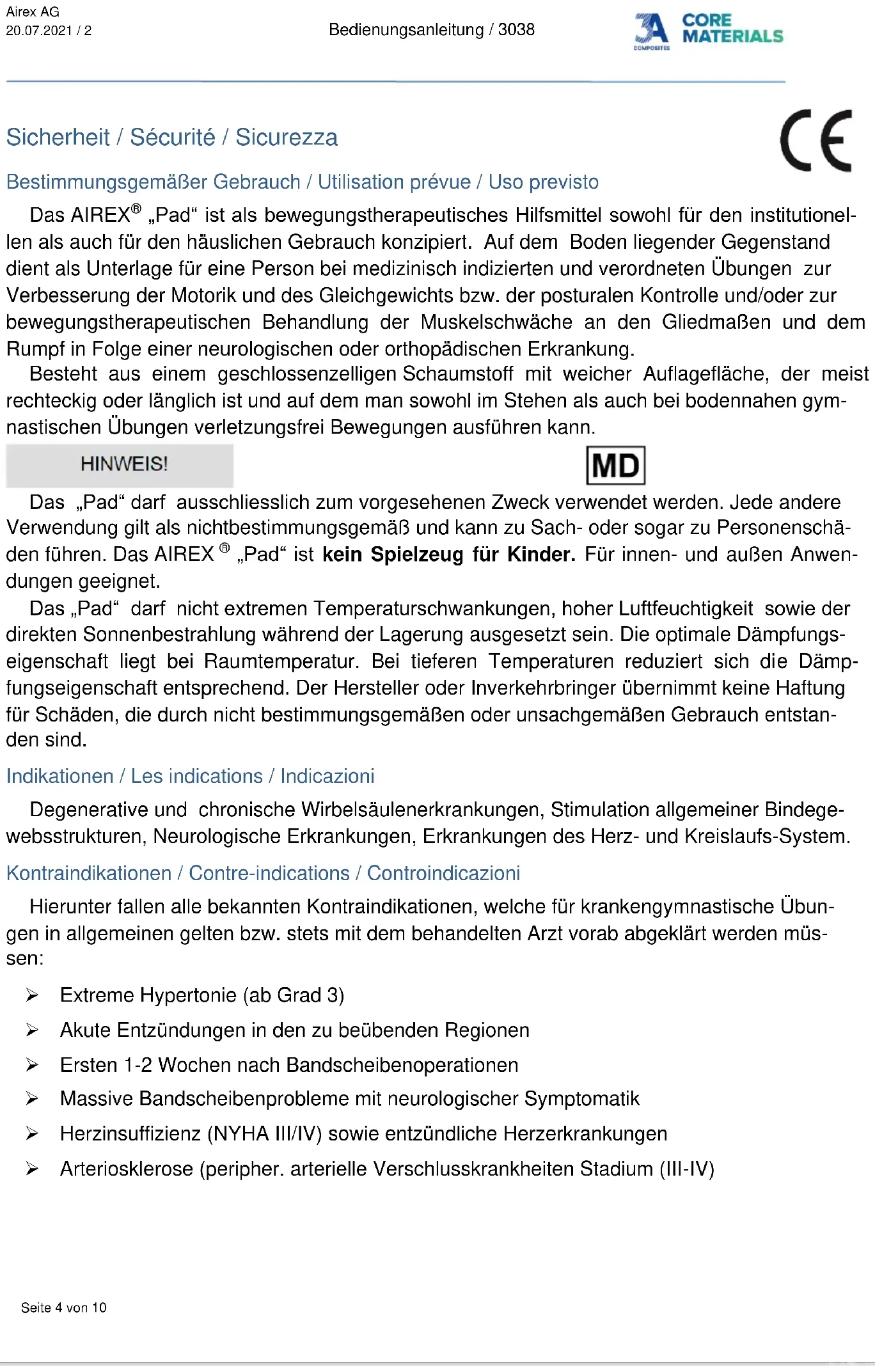 „Pad“ ist kein Spielzeug für Kinder. Für innen- und außen Anwen- dungen geeignet. Das „Pad“ darf nicht extremen Temperaturschwankungen, hoher Luftfeuchtigkeit sowie der direkten Sonnenbestrahlung während der Lagerung ausgesetzt sein. Die optimale Dämpfungs- eigenschaft liegt bei Raumtemperatur. Bei tieferen Temperaturen reduziert sich die Dämp- fungseigenschaft entsprechend. Der Hersteller oder Inverkehrbringer übernimmt keine Haftung für Schäden, die durch nicht bestimmungsgemäßen oder unsachgemäßen Gebrauch entstan- den sind. Indikationen / Les indications / Indicazioni Degenerative und chronische Wirbelsäulenerkrankungen, Stimulation allgemeiner Bindege- websstrukturen, Neurologische Erkrankungen, Erkrankungen des Herz- und Kreislaufs-System. Kontraindikationen / Contre-indications / Controindicazioni Hierunter fallen alle bekannten Kontraindikationen, welche für krankengymnastische Übun- gen in allgemeinen gelten bzw. stets mit dem behandelten Arzt vorab abgeklärt werden müs- sen: Extreme Hypertonie (ab Grad 3) Akute Entzündungen in den zu beübenden Regionen Ersten 1-2 Wochen nach Bandscheibenoperationen Massive Bandscheibenprobleme mit neurologischer Symptomatik Herzinsuffizienz (NYHA III/IV) sowie entzündliche Herzerkrankungen Arteriosklerose (peripher. arterielle Verschlusskrankheiten Stadium (III-IV)Airex AG