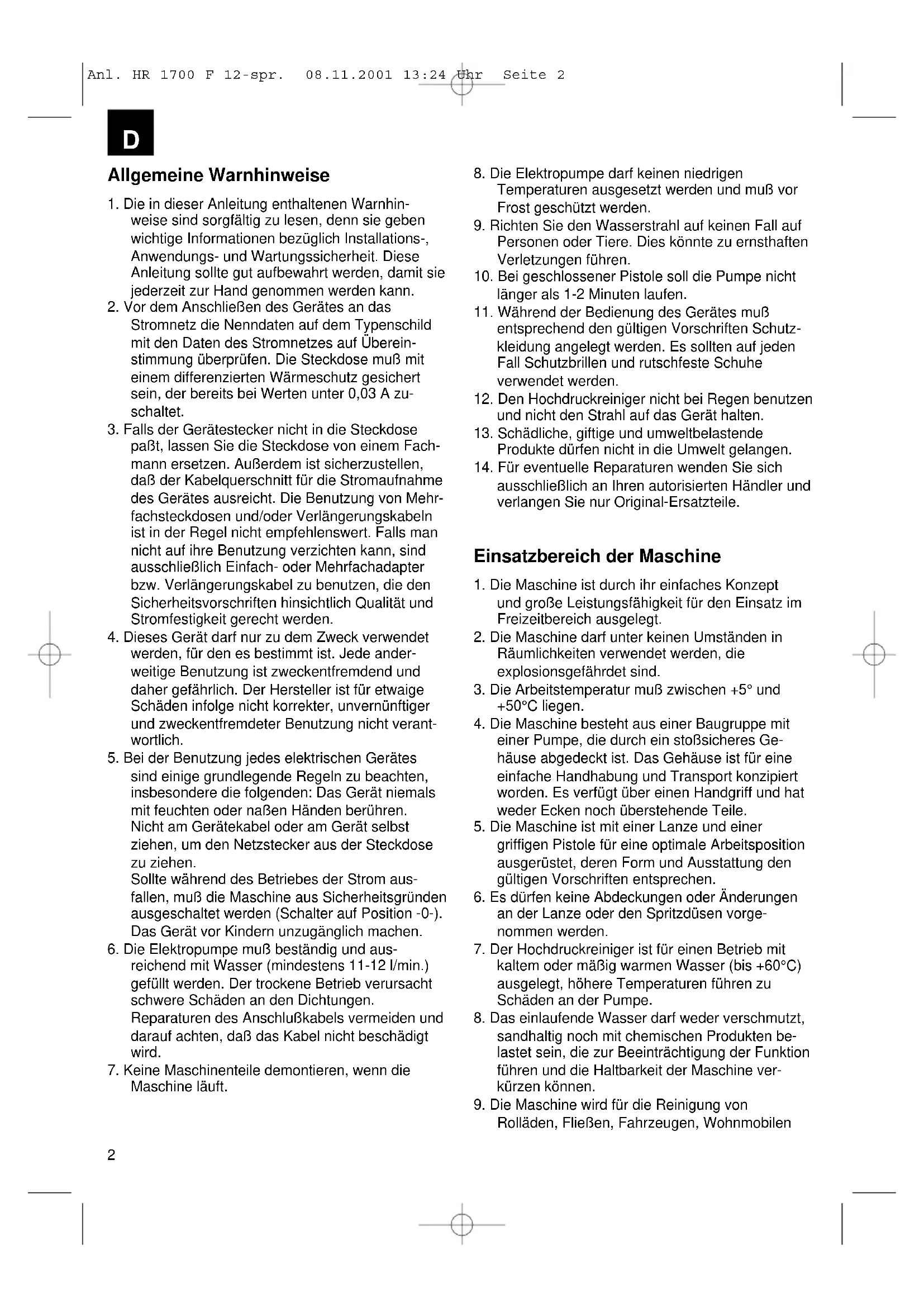 Anl. HR 1700 F 12-spr. 08.11.2001 13:24 Uhr Seite 2und Bereiche verwendet, in denen der Einsatz von Druck für die Beseitigung von Schmutz ge- fordert ist.