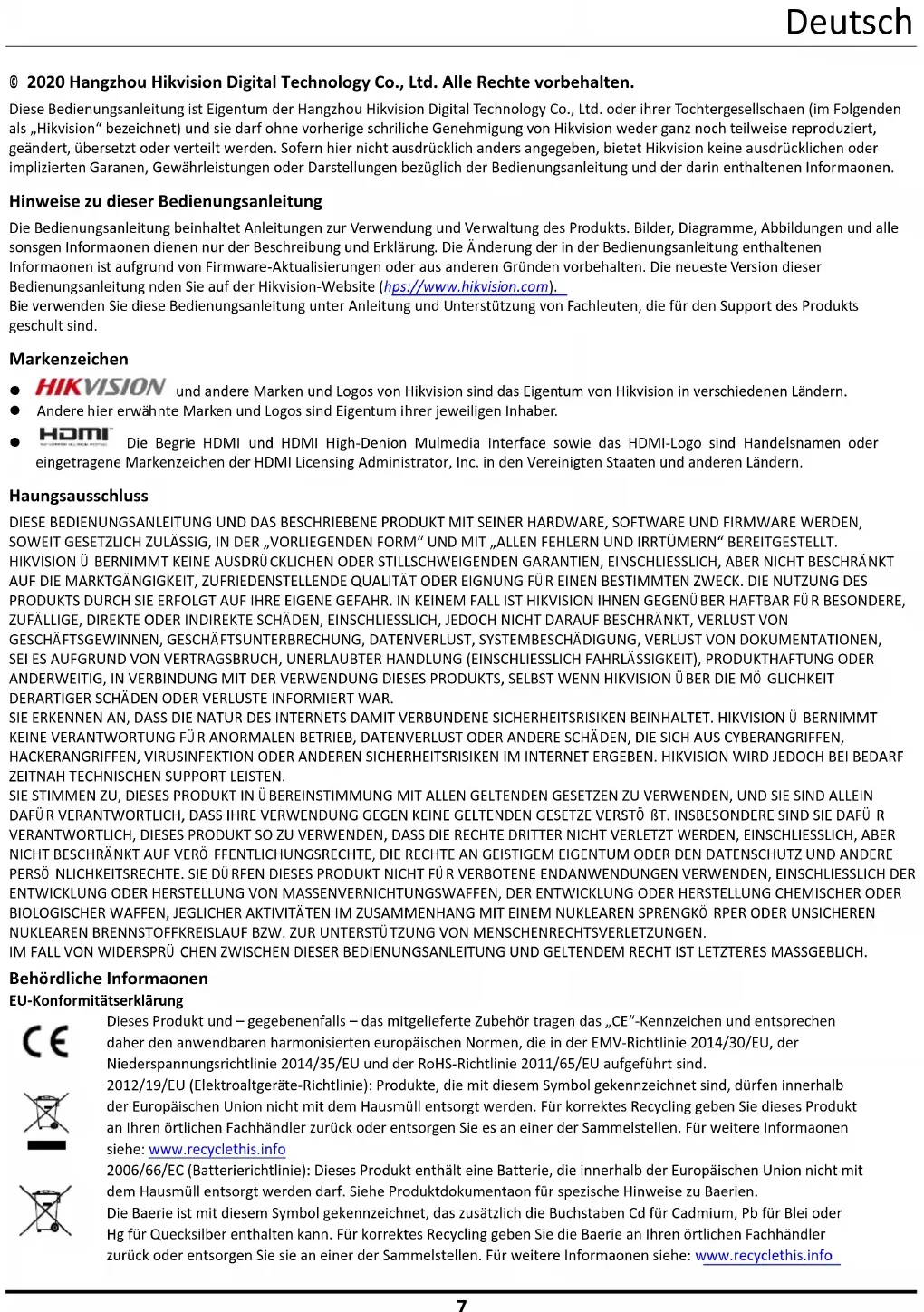 © 2020 Hangzhou Hikvision Digital Technology Co., Ltd. Alle Rechte vorbehalten. Diese Bedienungsanleitung ist Eigentum der Hangzhou Hikvision Digital Technology Co., Ltd. oder ihrer Tochtergesellschaften (im Folgenden als „Hikvision“ bezeichnet) und sie darf ohne vorherige schriftliche Genehmigung von Hikvision weder ganz noch teilweise reproduziert, geändert, übersetzt oder verteilt werden. Sofern hier nicht ausdrücklich anders angegeben, bietet Hikvision keine ausdrücklichen oder implizierten Garantien, Gewährleistungen oder Darstellungen bezüglich der Bedienungsanleitung und der darin enthaltenen Informationen. Hinweise zu dieser Bedienungsanleitung Die Bedienungsanleitung beinhaltet Anleitungen zur Verwendung und Verwaltung des Produkts. Bilder, Diagramme, Abbildungen und alle sonstigen Informationen dienen nur der Beschreibung und Erklärung. Die Änderung der in der Bedienungsanleitung enthaltenen Informationen ist aufgrund von Firmware-Aktualisierungen oder aus anderen Gründen vorbehalten. Die neueste Version dieser Bedienungsanleitung finden Sie auf der Hikvision-Website (https://www.hikvision.com). Bitte verwenden Sie diese Bedienungsanleitung unter Anleitung und Unterstützung von Fachleuten, die für den Support des Produkts geschult sind. Markenzeichen und andere Marken und Logos von Hikvision sind das Eigentum von Hikvision in verschiedenen Ländern. Andere hier erwähnte Marken und Logos sind Eigentum ihrer jeweiligen Inhaber. Die Begriffe HDMI und HDMI High-Definition Multimedia Interface sowie das HDMI-Logo sind Handelsnamen oder eingetragene Markenzeichen der HDMI Licensing Administrator, Inc. in den Vereinigten Staaten und anderen Ländern. Haftungsausschluss DIESE BEDIENUNGSANLEITUNG UND DAS BESCHRIEBENE PRODUKT MIT SEINER HARDWARE, SOFTWARE UND FIRMWARE WERDEN, SOWEIT GESETZLICH ZULÄSSIG, IN DER „VORLIEGENDEN FORM“ UND MIT „ALLEN FEHLERN UND IRRTÜMERN“ BEREITGESTELLT. HIKVISION Ü BERNIMMT KEINE AUSDRÜCKLICHEN ODER STILLSCHWEIGENDEN GARANTIEN, EINSCHLIESSLICH, ABER NICHT BESCHRÄNKT AUF DIE MARKTGÄNGIGKEIT, ZUFRIEDENSTELLENDE QUALITÄT ODER EIGNUNG FÜR EINEN BESTIMMTEN ZWECK. DIE NUTZUNG DES PRODUKTS DURCH SIE ERFOLGT AUF IHRE EIGENE GEFAHR. IN KEINEM FALL IST HIKVISION IHNEN GEGENÜBER HAFTBAR FÜR BESONDERE, ZUFÄLLIGE, DIREKTE ODER INDIREKTE SCHÄDEN, EINSCHLIESSLICH, JEDOCH NICHT DARAUF BESCHRÄNKT, VERLUST VON GESCHÄFTSGEWINNEN, GESCHÄFTSUNTERBRECHUNG, DATENVERLUST, SYSTEMBESCHÄDIGUNG, VERLUST VON DOKUMENTATIONEN, SEI ES AUFGRUND VON VERTRAGSBRUCH, UNERLAUBTER HANDLUNG (EINSCHLIESSLICH FAHRLÄSSIGKEIT), PRODUKTHAFTUNG ODER ANDERWEITIG, IN VERBINDUNG MIT DER VERWENDUNG DIESES PRODUKTS, SELBST WENN HIKVISION ÜBER DIE MÖ GLICHKEIT DERARTIGER SCHÄDEN ODER VERLUSTE INFORMIERT WAR. SIE ERKENNEN AN, DASS DIE NATUR DES INTERNETS DAMIT VERBUNDENE SICHERHEITSRISIKEN BEINHALTET. HIKVISION Ü BERNIMMT KEINE VERANTWORTUNG FÜR ANORMALEN BETRIEB, DATENVERLUST ODER ANDERE SCHÄDEN, DIE SICH AUS CYBERANGRIFFEN, HACKERANGRIFFEN, VIRUSINFEKTION ODER ANDEREN SICHERHEITSRISIKEN IM INTERNET ERGEBEN. HIKVISION WIRD JEDOCH BEI BEDARF ZEITNAH TECHNISCHEN SUPPORT LEISTEN. SIE STIMMEN ZU, DIESES PRODUKT IN ÜBEREINSTIMMUNG MIT ALLEN GELTENDEN GESETZEN ZU VERWENDEN, UND SIE SIND ALLEIN DAFÜR VERANTWORTLICH, DASS IHRE VERWENDUNG GEGEN KEINE GELTENDEN GESETZE VERSTÖ ßT. INSBESONDERE SIND SIE DAFÜ R VERANTWORTLICH, DIESES PRODUKT SO ZU VERWENDEN, DASS DIE RECHTE DRITTER NICHT VERLETZT WERDEN, EINSCHLIESSLICH, ABER NICHT BESCHRÄNKT AUF VERÖ FFENTLICHUNGSRECHTE, DIE RECHTE AN GEISTIGEM EIGENTUM ODER DEN DATENSCHUTZ UND ANDERE PERSÖ NLICHKEITSRECHTE. SIE DÜRFEN DIESES PRODUKT NICHT FÜR VERBOTENE ENDANWENDUNGEN VERWENDEN, EINSCHLIESSLICH DER ENTWICKLUNG ODER HERSTELLUNG VON MASSENVERNICHTUNGSWAFFEN, DER ENTWICKLUNG ODER HERSTELLUNG CHEMISCHER ODER BIOLOGISCHER WAFFEN, JEGLICHER AKTIVITÄTEN IM ZUSAMMENHANG MIT EINEM NUKLEAREN SPRENGKÖ RPER ODER UNSICHEREN NUKLEAREN BRENNSTOFFKREISLAUF BZW. ZUR UNTERSTÜTZUNG VON MENSCHENRECHTSVERLETZUNGEN. IM FALL VON WIDERSPRÜ CHEN ZWISCHEN DIESER BEDIENUNGSANLEITUNG UND GELTENDEM RECHT IST LETZTERES MASSGEBLICH. Behördliche Informationen EU-Konformitätserklärung