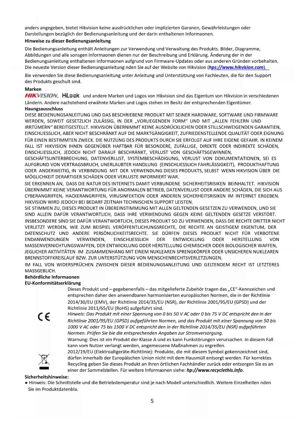 Deutsch Das Gerät muss in einem sicheren Bereich aufgestellt werden, um ein Herunterfallen und Verletzungen zu vermeiden. Weitere Informationen finden Sie unter https://www.hikvision.com. © 2022 Hangzhou Hikvision Digital Technology Co., Ltd. Alle Rechte vorbehalten. Diese Bedienungsanleitung ist Eigentum der Hangzhou Hikvision Digital Technology Co., Ltd. oder ihrer Tochtergesellschaften (im Folgenden als „Hikvision“ bezeichnet) und sie darf ohne vorherige schriftliche Genehmigung von Hikvision weder ganz noch teilweise reproduziert, geändert, übersetzt oder verteilt werden. Sofern hier nicht ausdrücklich5 anders angegeben, bietet Hikvision keine ausdrücklichen oder implizierten Garantien, Gewährleistungen oder Darstellungen bezüglich der Bedienungsanleitung und der darin enthaltenen Informationen. Hinweise zu dieser Bedienungsanleitung Die Bedienungsanleitung enthält Anleitungen zur Verwendung und Verwaltung des Produkts. Bilder, Diagramme, Abbildungen und alle sonstigen Informationen dienen nur der Beschreibung und Erklärung. Änderung der in der Bedienungsanleitung enthaltenen Informationen aufgrund von Firmware-Updates oder aus anderen Gründen vorbehalten. Die neueste Version dieser Bedienungsanleitung finden Sie auf der Website von Hikvision (https://www.hikvision.com). Bitte verwenden Sie diese Bedienungsanleitung unter Anleitung und Unterstützung von Fachleuten, die für den Support des Produkts geschult sind. Marken , und andere Marken und Logos von Hikvision sind das Eigentum von Hikvision in verschiedenen Ländern. Andere nachstehend erwähnte Marken und Logos stehen im Besitz der entsprechenden Eigentümer. Haftungsausschluss DIESE BEDIENUNGSANLEITUNG UND DAS BESCHRIEBENE PRODUKT MIT SEINER HARDWARE, SOFTWARE UND FIRMWARE WERDEN, SOWEIT GESETZLICH ZULÄSSIG, IN DER „VORLIEGENDEN FORM“ UND MIT „ALLEN FEHLERN UND IRRTÜMERN“ BEREITGESTELLT. HIKVISION ÜBERNIMMT KEINE AUSDRÜCKLICHEN ODER STILLSCHWEIGENDEN GARANTIEN, EINSCHLIESSLICH, ABER NICHT BESCHRÄNKT AUF DIE MARKTGÄNGIGKEIT, ZUFRIEDENSTELLENDE QUALITÄT ODER EIGNUNG FÜR EINEN BESTIMMTEN ZWECK. DIE NUTZUNG DES PRODUKTS DURCH SIE ERFOLGT AUF IHRE EIGENE GEFAHR. IN KEINEM FALL IST HIKVISION IHNEN GEGENÜBER HAFTBAR FÜR BESONDERE, ZUFÄLLIGE, DIREKTE ODER INDIREKTE SCHÄDEN, EINSCHLIESSLICH, JEDOCH NICHT DARAUF BESCHRÄNKT, VERLUST VON GESCHÄFTSGEWINNEN, GESCHÄFTSUNTERBRECHUNG, DATENVERLUST, SYSTEMBESCHÄDIGUNG, VERLUST VON DOKUMENTATIONEN, SEI ES AUFGRUND VON VERTRAGSBRUCH, UNERLAUBTER HANDLUNG (EINSCHLIESSLICH FAHRLÄSSIGKEIT), PRODUKTHAFTUNG ODER ANDERWEITIG, IN VERBINDUNG MIT DER VERWENDUNG DIESES PRODUKTS, SELBST WENN HIKVISION ÜBER DIE MÖGLICHKEIT DERARTIGER SCHÄDEN ODER VERLUSTE INFORMIERT WAR. SIE ERKENNEN AN, DASS DIE NATUR DES INTERNETS DAMIT VERBUNDENE SICHERHEITSRISIKEN BEINHALTET. HIKVISION ÜBERNIMMT KEINE VERANTWORTUNG FÜR ANORMALEN BETRIEB, DATENVERLUST ODER ANDERE SCHÄDEN, DIE SICH AUS CYBERANGRIFFEN, HACKERANGRIFFEN, VIRUSINFEKTION ODER ANDEREN SICHERHEITSRISIKEN IM INTERNET ERGEBEN. HIKVISION WIRD JEDOCH BEI BEDARF ZEITNAH TECHNISCHEN SUPPORT LEISTEN. SIE STIMMEN ZU, DIESES PRODUKT IN ÜBEREINSTIMMUNG MIT ALLEN GELTENDEN GESETZEN ZU VERWENDEN, UND SIE SIND ALLEIN DAFÜR VERANTWORTLICH, DASS IHRE VERWENDUNG GEGEN KEINE GELTENDEN GESETZE VERSTÖßT. INSBESONDERE SIND SIE DAFÜR VERANTWORTLICH, DIESES PRODUKT SO ZU VERWENDEN, DASS DIE RECHTE DRITTER NICHT VERLETZT WERDEN, WIE ZUM BEISPIEL VERÖFFENTLICHUNGSRECHTE, DIE RECHTE AN GEISTIGEM EIGENTUM, DER DATENSCHUTZ UND ANDERE PERSÖNLICHKEITSRECHTE. SIE DÜRFEN DIESES PRODUKT NICHT FÜR VERBOTENE ENDANWENDUNGEN VERWENDEN, EINSCHLIESSLICH DER ENTWICKLUNG ODER HERSTELLUNG VON MASSENVERNICHTUNGSWAFFEN, DER ENTWICKLUNG ODER HERSTELLUNG CHEMISCHER ODER BIOLOGISCHER WAFFEN, JEGLICHER AKTIVITÄTEN IM ZUSAMMENHANG MIT EINEM NUKLEAREN SPRENGKÖRPER ODER UNSICHEREN NUKLEAREN BRENNSTOFFKREISLAUF BZW. ZUR UNTERSTÜTZUNG VON MENSCHENRECHTSVERLETZUNGEN. IM FALL VON WIDERSPRÜCHEN ZWISCHEN DIESER BEDIENUNGSANLEITUNG UND GELTENDEM RECHT IST LETZTERES MASSGEBLICH. Behördliche Informationen EU-Konformitätserklärung
