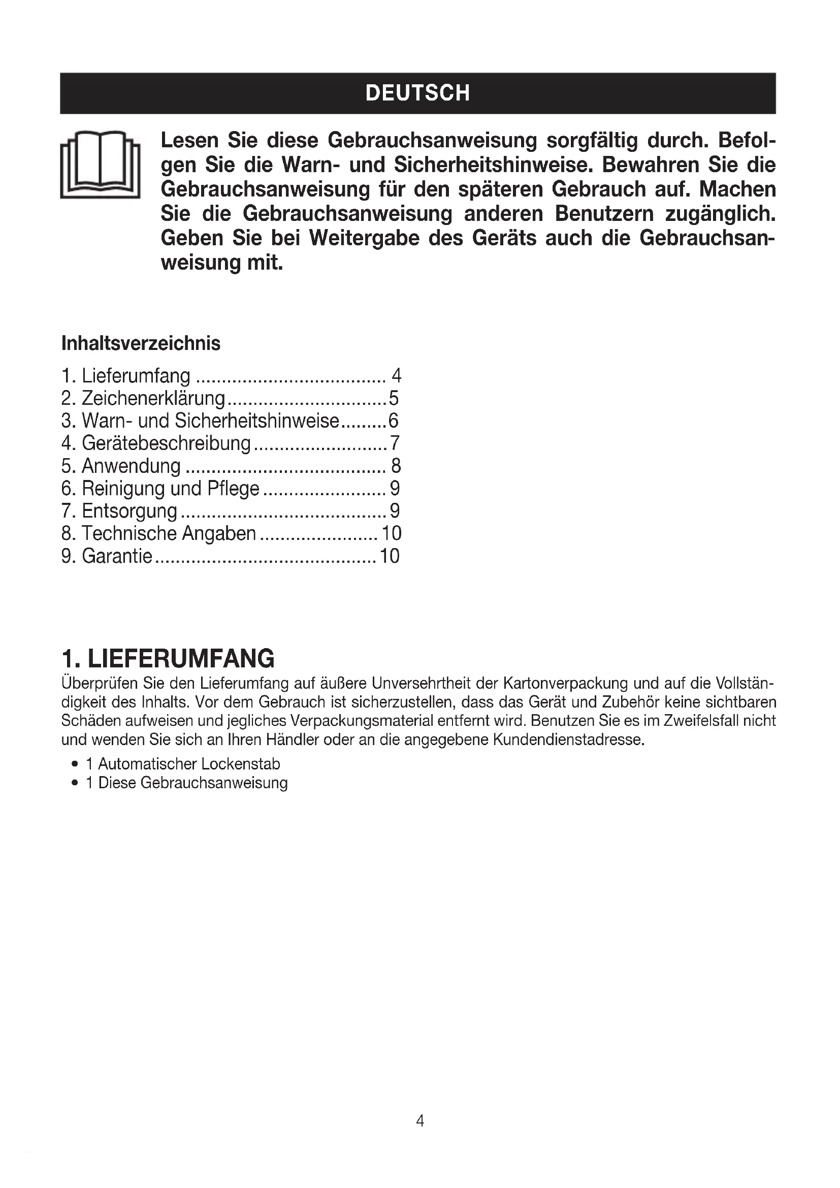 1 Diese Gebrauchsanweisung Inhaltsverzeichnis 1 Lieferumfang 4 2 Zeichenerklärung 5 3 Warn- und Sicherheitshinweise 6 4 Gerätebeschreibung 7 5 Anwendung 8 6 Reinigung und Pflege 9 7 Entsorgung 9 8 Technische Angaben 10 9 Garantie 10 DEUTSCH5