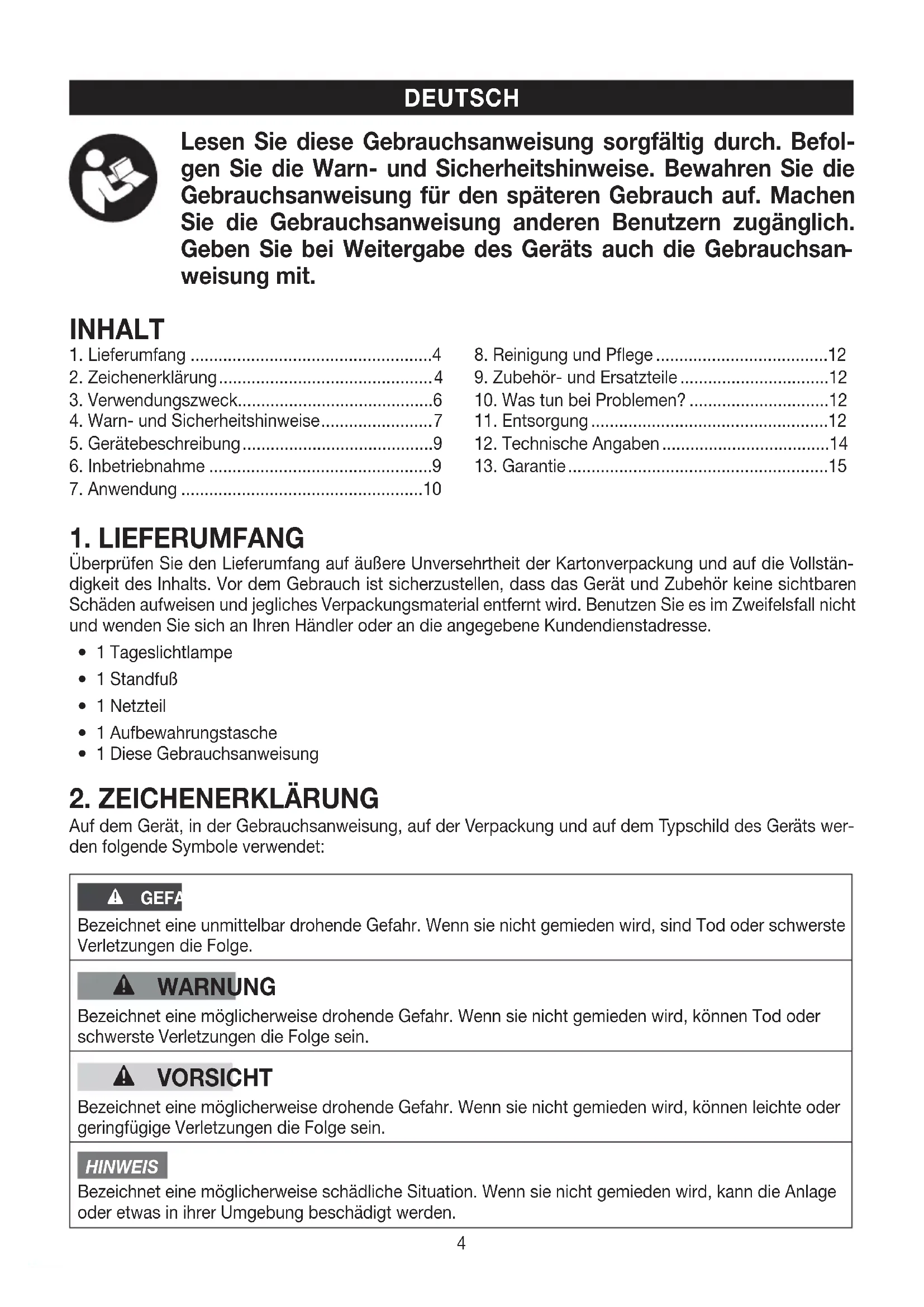 Auf dem Gerät, in der Gebrauchsanweisung, auf der Verpackung und auf dem Typschild des Geräts wer- den folgende Symbole verwendet: GEFAHR Bezeichnet eine unmittelbar drohende Gefahr. Wenn sie nicht gemieden wird, sind Tod oder schwerste Verletzungen die Folge. WARNUNG Bezeichnet eine möglicherweise drohende Gefahr. Wenn sie nicht gemieden wird, können Tod oder schwerste Verletzungen die Folge sein. VORSICHT Bezeichnet eine möglicherweise drohende Gefahr. Wenn sie nicht gemieden wird, können leichte oder geringfügige Verletzungen die Folge sein. HINWEIS Bezeichnet eine möglicherweise schädliche Situation. Wenn sie nicht gemieden wird, kann die Anlage oder etwas in ihrer Umgebung beschädigt werden. INHALT