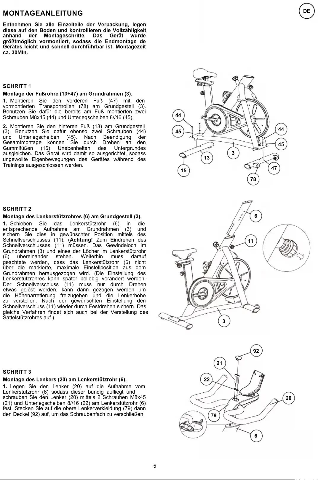 Lenkerstützrohr (6) sodass dieser bündig auiegt und schrauben Sie den Lenker (20) mittels 2 Schrauben M8x45 (21) und Unterlegscheiben 8//16 (22) am Lenkerstützrohr (6) fest. Stecken Sie auf die obere Lenkerverkleidung (79) dann den Deckel (92) auf, um das Schraubenfach zu verschließen. SCHRITT 1 SCHRITT 2 SCHRITT 3 Montage der Fußrohre (13+47) am Grundrahmen (3). Montage des Lenkerstützrohres (6) am Grundgestell (3). Montage des Lenkers (20) am Lenkerstützrohr (6).