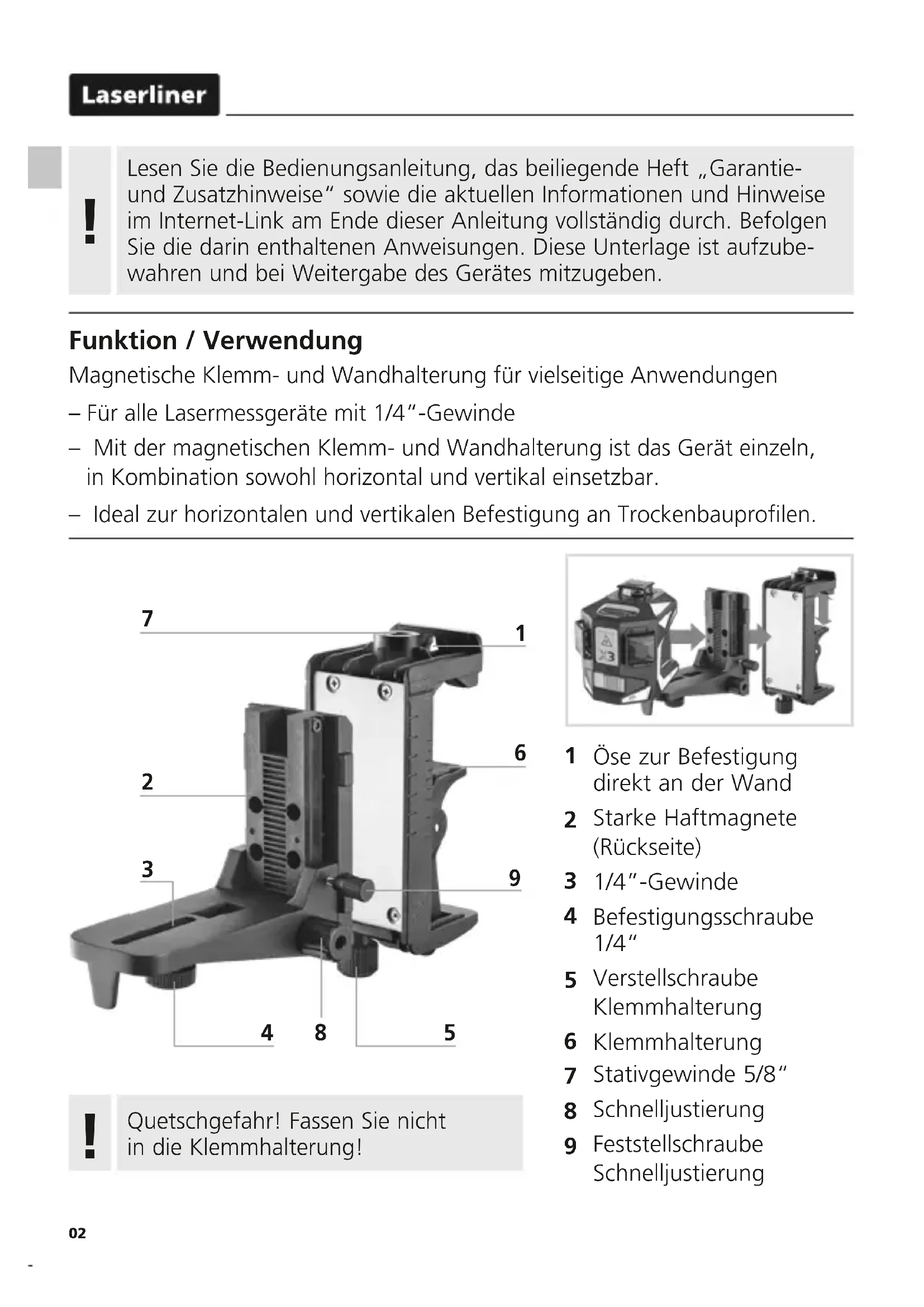 Funktion / Verwendung Magnetische Klemm- und Wandhalterung für vielseitige Anwendungen – Für alle Lasermessgeräte mit 1/4“-Gewinde – Mit der magnetischen Klemm- und Wandhalterung ist das Gerät einzeln, in Kombination sowohl horizontal und vertikal einsetzbar. – Ideal zur horizontalen und vertikalen Befestigung an Trockenbauprolen. Lesen Sie die Bedienungsanleitung, das beiliegende Heft „Garantie- und Zusatzhinweise“ sowie die aktuellen Informationen und Hinweise im Internet-Link am Ende dieser Anleitung vollständig durch. Befolgen Sie die darin enthaltenen Anweisungen. Diese Unterlage ist aufzube- wahren und bei Weitergabe des Gerätes mitzugeben. !03 CrossGrip Pro Mit der Klemmhalterung (6) lässt sich die Wandhalterung horizontal und vertikal an Trockenbauprofilen befestigen. Mit der Verstellschraube (5) lässt sich die Öffnungsweite der Klemmhalterung verstellen.