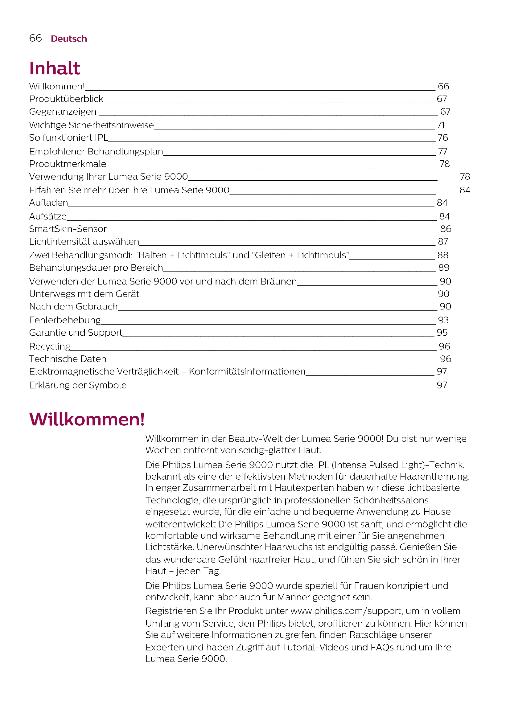 Deutsch Inhalt Willkommen!__________________________________________________________________________________________ 66 Produktüberblick_____________________________________________________________________________________ 67 Gegenanzeigen _______________________________________________________________________________________ 67 Wichtige Sicherheitshinweise________________________________________________________________________ 71 So funktioniert IPL____________________________________________________________________________________ 76 Empfohlener Behandlungsplan______________________________________________________________________ 77 Produktmerkmale_____________________________________________________________________________________ 78 Verwendung Ihrer Lumea Serie9000________________________________________________________________ 78 Erfahren Sie mehr über Ihre Lumea Serie9000_____________________________________________________ 84 Aufladen______________________________________________________________________________________________ 84 Aufsätze_______________________________________________________________________________________________ 84 SmartSkin-Sensor_____________________________________________________________________________________ 86 Lichtintensität auswählen____________________________________________________________________________ 87 Zwei Behandlungsmodi: "Halten + Lichtimpuls" und "Gleiten + Lichtimpuls"______________________ 88 Behandlungsdauer pro Bereich______________________________________________________________________ 89 Verwenden der Lumea Serie9000 vor und nach dem Bräunen____________________________________ 90 Unterwegs mit dem Gerät____________________________________________________________________________ 90 Nach dem Gebrauch__________________________________________________________________________________ 90 Fehlerbehebung______________________________________________________________________________________ 93 Garantie und Support________________________________________________________________________________ 95 Recycling______________________________________________________________________________________________ 96 Technische Daten_____________________________________________________________________________________ 96 Elektromagnetische Verträglichkeit – Konformitätsinformationen_________________________________ 97 Erklärung der Symbole_______________________________________________________________________________ 97 Willkommen! Willkommen in der Beauty-Welt der Lumea Serie9000! Du bist nur wenige Wochen entfernt von seidig-glatter Haut. Die Philips Lumea Serie 9000 nutzt die IPL (Intense Pulsed Light)-Technik, bekannt als eine der effektivsten Methoden für dauerhafte Haarentfernung. In enger Zusammenarbeit mit Hautexperten haben wir diese lichtbasierte Technologie, die ursprünglich in professionellen Schönheitssalons eingesetzt wurde, für die einfache und bequeme Anwendung zu Hause weiterentwickelt.Die Philips Lumea Serie9000 ist sanft, und ermöglicht die komfortable und wirksame Behandlung mit einer für Sie angenehmen Lichtstärke. Unerwünschter Haarwuchs ist endgültig passé. Genießen Sie das wunderbare Gefühl haarfreier Haut, und fühlen Sie sich schön in Ihrer Haut – jeden Tag. Die Philips Lumea Serie9000 wurde speziell für Frauen konzipiert und entwickelt, kann aber auch für Männer geeignet sein. Registrieren Sie Ihr Produkt unter www.philips.com/support, um in vollem Umfang vom Service, den Philips bietet, profitieren zu können. Hier können Sie auf weitere Informationen zugreifen, finden Ratschläge unserer Experten und haben Zugriff auf Tutorial-Videos und FAQs rund um Ihre Lumea Serie9000.67 Deutsch Hinweis: Bewahren Sie diese Anleitung stets bei dem Produkt auf. Produktüberblick 1 Lichtaustrittsfenster mit integriertem UV-Filter 2 Aufsätze a Körper-Aufsatz b Aufsatz fürs Gesicht c Aufsatz für die Bikinizone (BRI957, BRI958) d Aufsatz für die Achseln (BRI957, BRI958) e Präzisionsaufsatz (BRI955) 3 SmartSkin-Sensor 4 Integriertes Sicherheitssystem 5 Reflektor im Aufsatz 6 Elektrische Kontakte 7 Öffnung für elektrische Kontakte 8 Blitztaste 9 Ein-/Ausschalter 10 Bestätigungstaste 11 Umschalttasten 12 Intensitätsanzeigen 13 Einstellungsempfehlungstaste 14 Bereitschaftsanzeige 15 Belüftungsschlitze 16 Gerätestecker 17 Adapter 18 Kleines Netzteil 19 Elegante Tasche (nicht abgebildet) 20 Reinigungstuch (nicht abgebildet) Gegenanzeigen Bedingungen: Verwenden Sie das Gerät keinesfalls in folgenden Situationen: