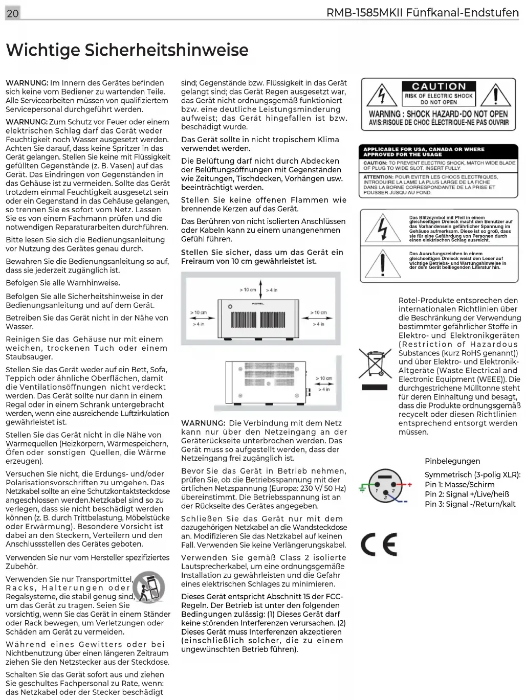 einschließlich Lüfter aus und Lüfter automatisch. Bitte wählen Sie die Lüfterauswahl, die am besten zu den Installations- und Kühlanforderungen passt. HINWEIS: Die RMB-1585MKII liefert eine sehr hohe Leistung und entsprechend stark ist auch bei eingeschalteten Lüftern die Wärmeentwicklung. Um einen reibungslosen Betrieb zu gewährleisten, achten Sie auf eine ordnungsgemäße Installation und eine ausreichende Belüftung. Bei Störungen In Audiosystemen sind viele Schwierigkeiten auf falsches Anschließen oder falsches Einstellen der Bedienelemente zurückzuführen. Sollten Probleme auftreten, isolieren Sie den betroffenen Bereich, prüfen die Einstellung der Bedienelemente, lokalisieren die Ursache der Störung und nehmen die notwendigen Veränderungen vor. Die Betriebsanzeige leuchtet nicht Die Endstufe bekommt keinen Strom. Prüfen Sie, ob sich der POWER- Schalter an der Gerätefront in der EIN-Position bendet. Prüfen Sie die Netzanschlüsse an der Endstufe und der Wandsteckdose. Austauschen der Sicherung Funktioniert ein anderes elektrisches Gerät, wenn es an die Steckdose angeschlossen ist, aber die Endstufe nicht, so kann dies ein Hinweis darauf sein, dass die Grobsicherung im Gehäuseinnern durchgebrannt ist. Sollte dies der Fall sein, so lassen Sie die Sicherung von Ihrem autorisierten Rotel-Fachhändler auswechseln. Kein Ton Bekommt die Endstufe Strom und ist trotzdem kein Ton zu hören, prüfen Sie, ob die Betriebsanzeige an der Gerätefront blinkt. Falls ja, beachten Sie bitte die Hinweise unten. Falls nicht, prüfen Sie, ob alle Geräte richtig angeschlossen sind und die Einstellungen an den angeschlossenen Geräten richtig vorgenommen wurden. Betriebsanzeige blinkt (Schutzmodus) Wurde die Endstufe von den Schutzschaltungen abgeschaltet, beginnt die POWER-Anzeige an der Gerätefront zu blinken. Normalerweise passiert dies nur, wenn die Endstufe überhitzt wurde, die Lautsprecher nicht richtig angeschlossen wurden oder bei extremer Belastung. Schalten Sie das System ab und warten Sie, bis sich die Endstufe abgekühlt hat. Drücken Sie den POWER-Schalter anschließend einmal ein und aus, um die Schutzschaltungen zurückzusetzen. Ist die Störung nicht beseitigt oder tritt sie erneut auf, liegt das Problem im System oder in der Endstufe selber.25 Deutsch Technische Daten LeistungLeistung (5ch angesteuert, 8 Ohm) 210 Watt/Kanal LeistungLeistung (5ch angesteuert, 8 Ohm) 340 Watt/Kanal LeistungLeistung (2ch angesteuert, 8 Ohm) 440 Watt/Kanal GesamtklirrfaktorGesamtklirrfaktor < 0,03 % IntermodulationsverzerrungIntermodulationsverzerrung (60 Hz : 7 kHz, 4:1) < 0,03 % FrequenzgangFrequenzgang (+0, -0.3 dB) 10 Hz – 100 kHz DämpfungsfaktorDämpfungsfaktor (1 kHz, 8 Ohm) 223 Eingangsimpedanz/-empfindlichkeitEingangsimpedanz/-empfindlichkeit Unsymmetrisch 12 kOhm/1,89 Volt Symmetrisch 50 kOhm/4,7 Volt VerstärkungVerstärkung 26,9 dB Signal-Rausch-VerhältnisSignal-Rausch-Verhältnis (A-Bewertung) 120 dB Übersprechen/TrennungÜbersprechen/Trennung > 55 db SpannungsversorgungSpannungsversorgung Europa: 230 Volt, 50 Hz LeistungsaufnahmeLeistungsaufnahme 1200 Watt BTUBTU (4 Ohm, 1/8 Leistung) 3317 BTU / h AbmessungenAbmessungen (Breite x Höhe x Tiefe) 431 x 237 x 456 mm Höhe des FrontpanelsHöhe des Frontpanels 5 HE (221,5 mm) NettogewichtNettogewicht 37 kg Diese Bedienungsanleitung entspricht dem technischen Stand bei Drucklegung. Änderungen in Technik und Ausstattung vorbehalten. Das Rotel-Logo ist eine eingetragene Marke von The Rotel Co, Ltd., Tokio, Japan.26 RMB-1585MKII Etapa de Potencia de Cinco Canales a ser utilizado durante un largo período de tiempo. Deje inmediatamente de utilizar el aparato y envíelo a un servicio técnico cualificado para su inspección/reparación si: el cable de alimentación o alguna clavija del mismo ha sido dañado.; han caído objetos o se ha derramado líquido en el interior del aparato; el aparato ha sido expuesto a la lluvia; el aparato muestra signos de funcionamiento inadecuado; el aparato ha sido golpeado o dañado de algún modo. El aparato no debería ser utilizado en un clima tropical. En ningún caso debe impedirse la ventilación del aparato cubriendo las aberturas destinadas a tal efecto con objetos tales como periódicos, manteles, cortinas, etc. No se deben colocar sobre el aparato fuentes de llama desnuda, como por ejemplo velas encendidas. Tocar terminales o cables sin aislar puede provocar una sensación desagradable. Debe dejar un mínimo de 10 centímetros de espacio libre alrededor del aparato. ADVERTENCIA: El conector del cable de alimentación del panel posterior hace las veces de dispositivo de desconexión de la red eléctrica. En consecuencia, el aparato debe ubicarse en un área abierta que permita acceder fácilmente a dicho conector. El aparato debe ser conectado únicamente a una fuente de alimentación del tipo y la tensión especificados en su panel posterior (corriente eléctrica alterna de 120 V/60 Hz para EE.UU. y 230 V/50 Hz para la Comunidad Europea). Conecte el aparato a la toma de corriente eléctrica únicamente a través del cable de alimentación suministrado de serie o un equivalente exacto del mismo. No modifique de ningún modo dicho cable. No utilice cables de extensión. La clavija principal del cable de alimentación permite desconectar por completo el aparato. En consecuencia, para desconectar completamente el aparato de la red eléctrica la clavija principal del cable de alimentación debería ser retirada de la toma de corriente Este símbolo sirve para alertar al usuario sobre la presencia de tensiones peligrosas no aisladas en el interior del aparato susceptibles de constituir un riesgo de electrocución. Este símbolo sirve para alertar al usuario sobre la presencia de instrucciones importantes relacionadas con el funcionamiento y el mantenimiento (servicio técnico) tanto en este manual como en la literatura que acompaña al producto. Los productos Rotel están diseñados para satisf