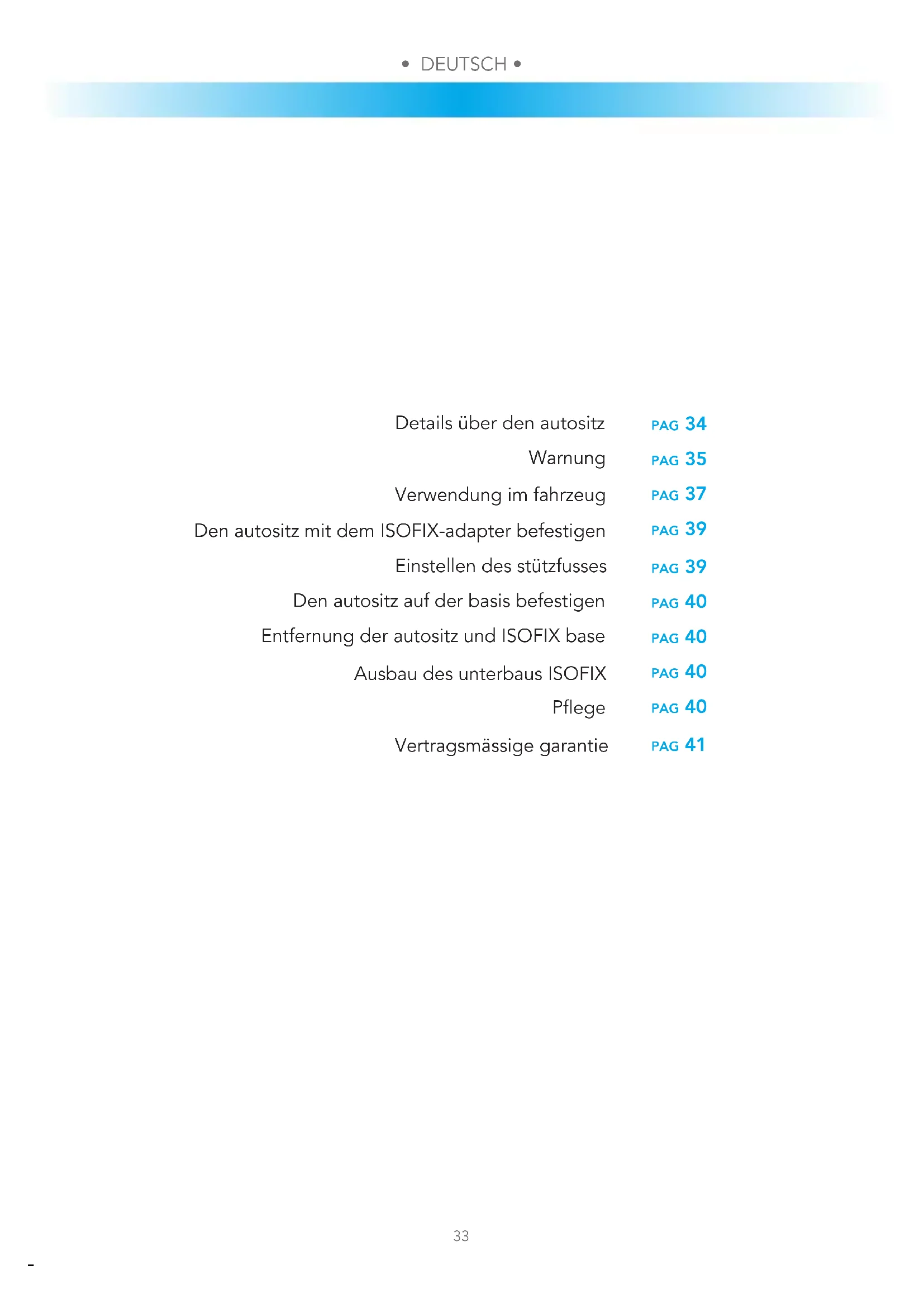 GARANTIE CONVENTIONNELLE pag 34 pag 35 pag 37 pag 39 pag 39 pag 40 pag 40 pag 40 pag 40 pag 41 Details über den autositz Warnung Verwendung im fahrzeug Den autositz mit dem ISOFIX-adapter befestigen Einstellen des stützfusses Den autositz auf der basis befestigen Entfernung der autositz und ISOFIX base Ausbau des unterbaus ISOFIX Pege Vertragsmässige garantie• DEUTSCH • • DEUTSCH •