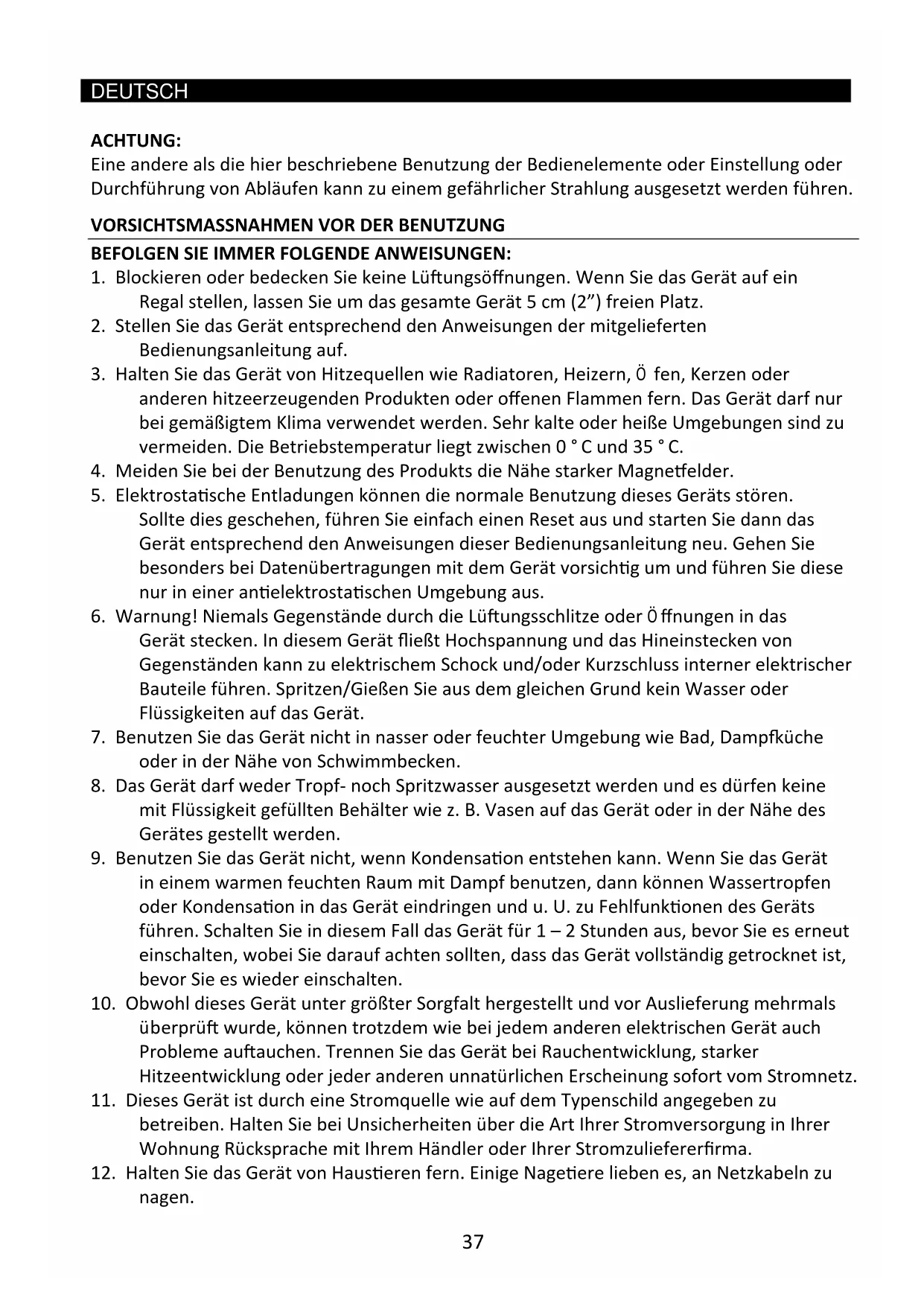 8. Das Gerät darf weder Tropf- noch Spritzwasser ausgesetzt werden und es dürfen keine