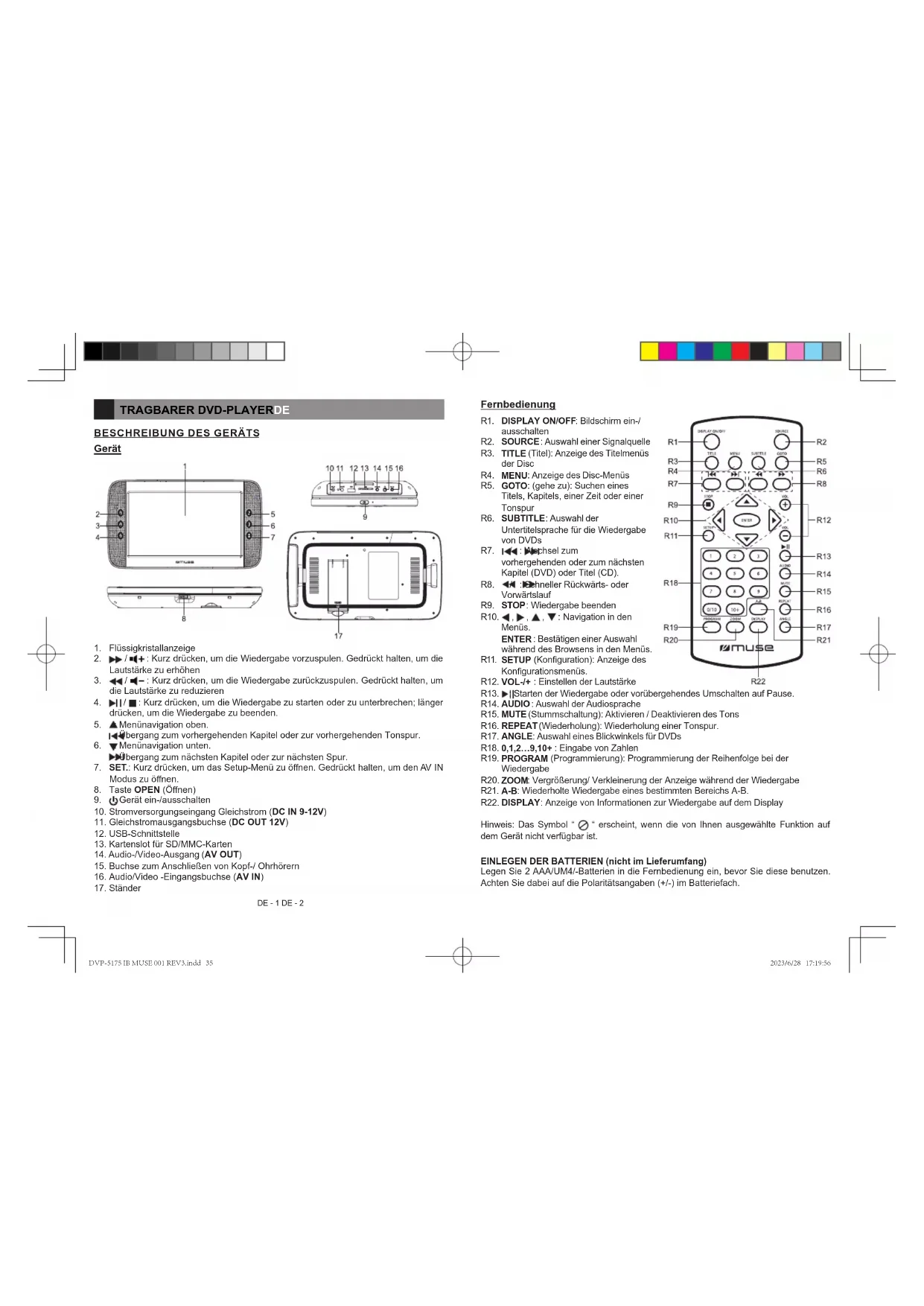 : Bildschirm ein-/ ausschalten R2. SOURCE : Auswahl einer Signalquelle R3. TITLE (Titel): Anzeige des Titelmenüs der Disc R4. MENU : Anzeige des Disc-Menüs R5. GOTO : (gehe zu): Suchen eines Titels, Kapitels, einer Zeit oder einer Tonspur R6. SUBTITLE : Auswahl der Untertitelsprache für die Wiedergabe von DVDs R7. / : Wechsel zum vorhergehenden oder zum nächsten Kapitel (DVD) oder Titel (CD). R8. / : Schneller Rückwärts- oder Vorwärtslauf R9. STOP : Wiedergabe beenden R10. , , , : Navigation in den Menüs. ENTER : Bestätigen einer Auswahl während des Browsens in den Menüs. R11. SETUP (Konguration): Anzeige des Kongurationsmenüs. R12. VOL-/+ : Einstellen der Lautstärke R13. : Starten der Wiedergabe oder vorübergehendes Umschalten auf Pause. R14. AUDIO : Auswahl der Audiosprache R15. MUTE (Stummschaltung): Aktivieren / Deaktivieren des Tons R16. REPEAT (Wiederholung): Wiederholung einer Tonspur. R17. ANGLE : Auswahl eines Blickwinkels für DVDs R18. 0,1,2…9,10+ : Eingabe von Zahlen R19. PROGRAM (Programmierung): Programmierung der Reihenfolge bei der Wiedergabe R20. ZOOM : Vergrößerung/ Verkleinerung der Anzeige während der Wiedergabe R21. A-B : Wiederholte Wiedergabe eines bestimmten Bereichs A-B. R22. DISPLAY : Anzeige von Informationen zur Wiedergabe auf dem Display Hinweis: Das Symbol “ “ erscheint, wenn die von Ihnen ausgewählte Funktion auf dem Gerät nicht verfügbar ist. EINLEGEN DER BATTERIEN (nicht im Lieferumfang) Legen Sie 2 AAA/UM4/-Batterien in die Fernbedienung ein, bevor Sie diese benutzen. Achten Sie dabei auf die Polaritätsangaben (+/-) im Batteriefach. Fernbedienung DVP-5175 IB MUSE 001 REV3.indd 35DVP-5175 IB MUSE 001 REV3.indd 35 2023/6/28 17:19:562023/6/28 17:19:56DE - 3 DE - 4 Netzwerkadapter x1 Zigarettenanzünderadapter x1 Gleichstrom-Audio-/Video-Kabel x1 Montagehalterung x1 Fernbedienung x1 Werfen Sie leere Batterien nicht in den Hausmüll, sondern geben Sie diese bei einer Sammelstelle oder bei Ihrem Händler ab. HINWEISE: - Versuchen Sie nicht, nicht auadbare Batterien aufzuladen. Erhitzen Sie Batterien nicht, demontieren Sie sie nicht. - Wenn Sie die Fernbedienung während längerer Zeit nicht verwenden, entfernen Sie die Batterien, um Schäden durch Ausießen der Batterie zu vermeiden. - Entsorgen Sie leere Batterien umweltgerecht. - Werfen Sie Batterien nicht ins Feuer! - Batterien dürfen keiner übermäßigen Hitze ausgesetzt werden (wie zum Beispiel praller Sonne, Feuer oder anderen ähnlichen Hitzequellen). ACHTUNG: Wenn die Batterie nicht richtig eingelegt wird, besteht die Gefahr, dass die Batterie explodiert. Ersetzen Sie eine leere Batterie nur mit einer identischen oder gleichwertigen Batterie. ZUBEHÖR STROMVERSORGUNG Achtung: