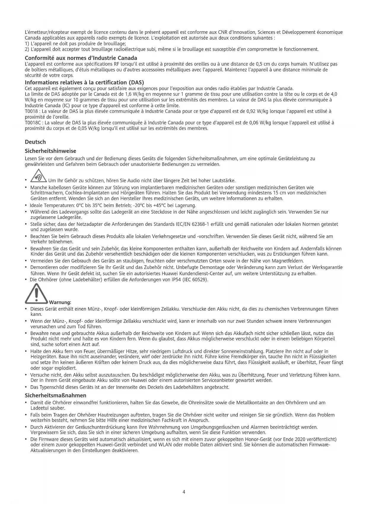 - Die Firmware dieses Geräts wird automatisch aktualisiert, wenn es sich mit einem zuvor gekoppelten Honor-Gerät (vor Ende 2020 veröentlicht) oder einem zuvor gekoppelten Huawei-Gerät verbindet und WLAN oder mobile Daten aktiviert sind. Sie können die automatischen Firmware- Aktualisierungen in den Einstellungen deaktivieren. 4Hinweise zur Entsorgung und zum Recycling Das Symbol auf Ihrem Produkt, Ihrem Akku, Ihrem Informationsmaterial oder Ihrer Verpackung bedeutet, dass die Produkte und Akkus am Ende ihrer Lebensdauer getrennt entsorgt werden und den von den Kommunen ausgewiesenen Sammelpunkten zugeführt werden müssen. Dadurch wird sichergestellt, dass Elektro- und Elektronik-Altgeräte in einer Weise recycelt und behandelt werden, die wertvolle Materialien schont und die menschliche Gesundheit und die Umwelt schützt. Für weitere Informationen kontaktieren Sie Ihre lokalen Behörden, Händler oder Entsorgungsunternehmen für Haushaltsmüll oder besuchen Sie die Website https://consumer.huawei.com/en/. Konformität mit EU-Bestimmungen Huawei Device Co., Ltd. erklärt hiermit, dass dieses Gerät T0018/T0018C den folgenden Richtlinien RED 2014/53/EU, RoHS 2011/65/EU, der EU- Verordnung REACH und der Batterierichtlinie (sofern Batterien enthalten sind) entspricht. Der vollständige Text der EU-Konformitätserklärung sowie aktuelle Informationen zu Zubehör und Software sind unter folgender Internetadresse verfügbar: https://consumer.huawei.com/certication. Dieses Gerät darf in allen Mitgliedstaaten der EU betrieben werden. Frequenzbänder und Leistung T0018: Bluetooth: 2,4 GHz 10 dBm. T0018C: Bluetooth: 2,4 GHz 8 dBm. Informationen zur HF-Exposition In Ländern/Regionen, die den SAR-Grenzwert von 2,0 W/kg über 10 Gramm Gewebe annehmen, entspricht das Gerät den HF-Spezikationen, wenn es in der Nähe von Ohren, Gliedmaßen oder in einem Abstand von 0,5 cm vom menschlichen Körper verwendet wird. Höchster gemeldeter SAR-Wert von Model T0018: 0,30 W/kg für den Kopf. T0018Ct ist ein Funksender und -empfänger mit geringer Leistung. Gemäß den Empfehlungen der internationalen Richtlinien wurde das Gerät so entwickelt, dass es die Grenzwerte der Zielmärkten einhält, auf dem es in Verkehr gebracht werden soll. Rechtliche Hinweise Copyright © Huawei Device Co., Ltd. 2023. Alle Rechte vorbehalten. Alle Inhalte in den Dokumenten in der Verpackung, einschließlich, aber nicht beschränkt auf Informationen und Darstellungen des Aussehens, der Farbe, Größe sowie der unterstützten Funktionen des Produkts (die neuesten Funktionen sind über Software-Aktualisierungen verfügbar) dienen nur als Referenz. Das tatsächliche Produkt kann abweichen. Die Wortmarke Bluetooth