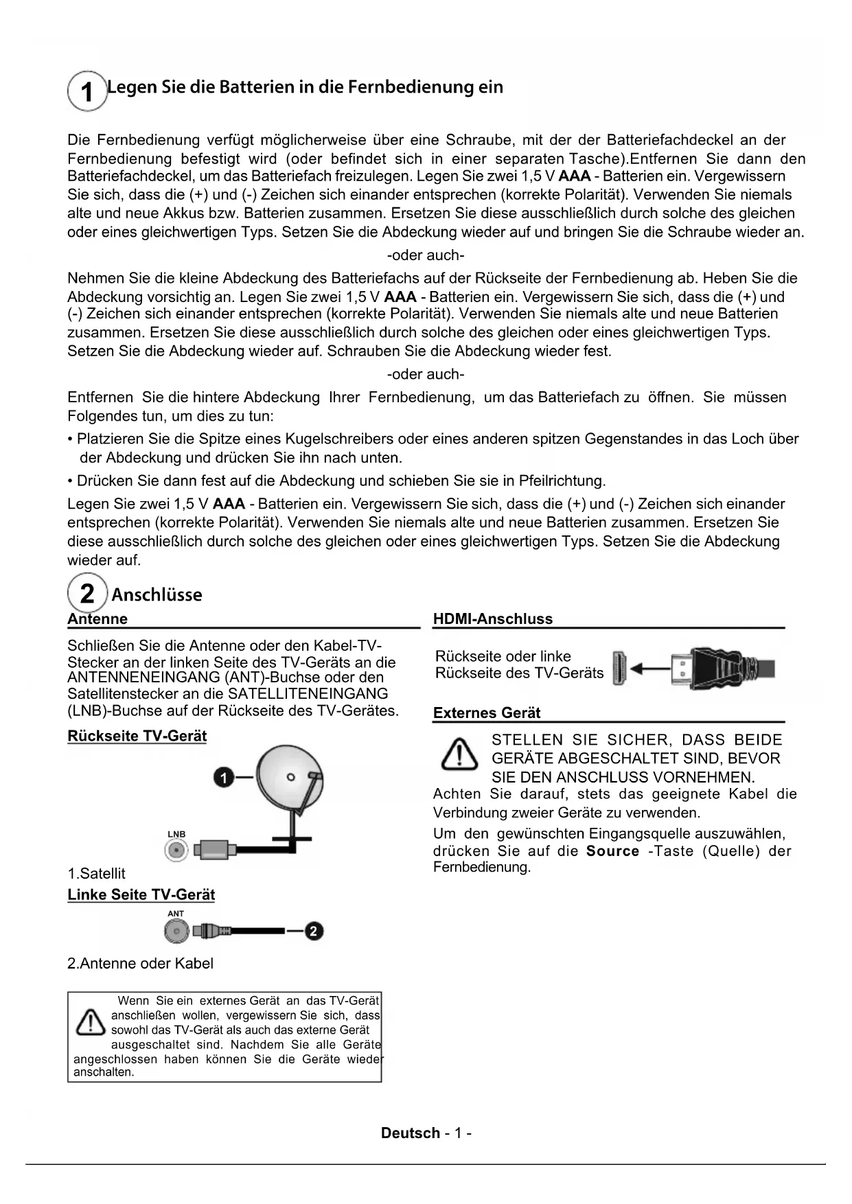 SIE DEN ANSCHLUSS VORNEHMEN. Achten Sie darauf, stets das geeignete Kabel die Verbindung zweier Geräte zu verwenden. Um den gewünschten Eingangsquelle auszuwählen, drücken Sie auf die Source -Taste (Quelle) der Fernbedienung.Deutsch - 2 - Strom Geben Sie Ihrem Gerät nach dem Auspacken genug Zeit, sich der Raumtemperatur der Umgebung anzupassen, bevor Sie es einstecken. Stecken Sie das Netzkabel in eine Netzsteckdose. WICHTIG: Das TV-Gerät ist nur für den Betrieb mit 220-240V Wechselstromquelle mit 50 Hz ausgelegt. Schalten Sie das Fernsehgerät ein.