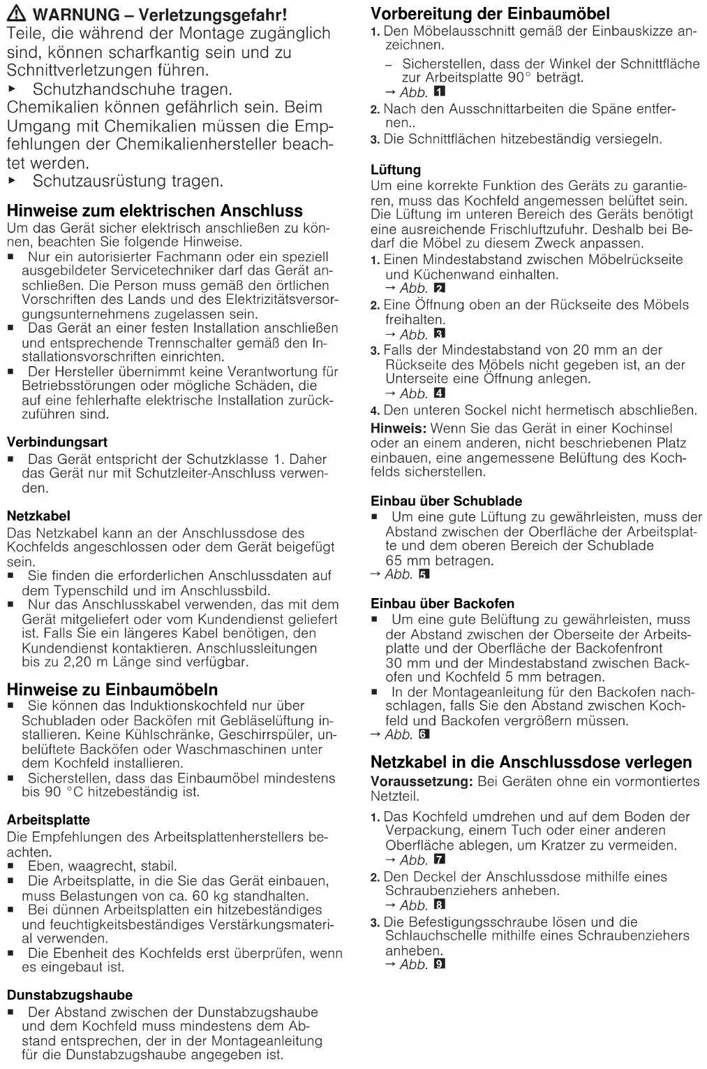 Allgemeine Hinweise ¡ Lesen Sie diese Anleitung sorgfältig. ¡ Nur eine konzessionierte Fachkraft darf das Gerät anschließen. ¡ Eine unsachgemäße Installation, Öffnung des Geräts, Verbindung oder Montage führt zum Verlust der Gültigkeit der Pro- duktgarantie. ¡ Vor der Durchführung jeglicher Arbeiten die Stromzufuhr abstellen. ¡ Nach der Installation sicherstellen, dass der Benutzer keinen Zugang zu den elek- trischen Bauteilen hat. ¡ Nie dieses Gerät in Booten oder Fahrzeu- gen verwenden. Sichere Montage Beachten Sie diese Sicherheitshinweise, wenn Sie das Gerät montieren. Nur bei fachgerechtem Einbau entspre- chend der Montageanleitung ist die Sicher- heit beim Gebrauch gewährleistet. Der In- stallateur ist für das einwandfreie Funktio- nieren des Geräts am Aufstellungsort ver- antwortlich. WARNUNG‒Gefahr durch Magnetismus! Das Gerät enthält Permanentmagnete. Die- se können elektronische Implantate, z.B. Herzschrittmacher oder Insulinpumpen be- einflussen. ▶ Personen mit elektronischen Implantaten müssen 10cm Mindestabstand zum Ge- rät einhalten.7 WARNUNG‒Verletzungsgefahr! Teile, die während der Montage zugänglich sind, können scharfkantig sein und zu Schnittverletzungen führen. ▶ Schutzhandschuhe tragen. Chemikalien können gefährlich sein. Beim Umgang mit Chemikalien müssen die Emp- fehlungen der Chemikalienhersteller beach- tet werden. ▶ Schutzausrüstung tragen. Hinweise zum elektrischen Anschluss Um das Gerät sicher elektrisch anschließen zu kön- nen, beachten Sie folgende Hinweise. ¡ Nur ein autorisierter Fachmann oder ein speziell ausgebildeter Servicetechniker darf das Gerät an- schließen. Die Person muss gemäß den örtlichen Vorschriften des Lands und des Elektrizitätsversor- gungsunternehmens zugelassen sein. ¡ Das Gerät an einer festen Installation anschließen und entsprechende Trennschalter gemäß den In- stallationsvorschriften einrichten. ¡ Der Hersteller übernimmt keine Verantwortung für Betriebsstörungen oder mögliche Schäden, die auf eine fehlerhafte elektrische Installation zurück- zuführen sind. Verbindungsart ¡ Das Gerät entspricht der Schutzklasse 1. Daher das Gerät nur mit Schutzleiter-Anschluss verwen- den. Netzkabel Das Netzkabel kann an der Anschlussdose des Kochfelds angeschlossen oder dem Gerät beigefügt sein. ¡ Sie finden die erforderlichen Anschlussdaten auf dem Typenschild und im Anschlussbild. ¡ Nur das Anschlusskabel verwenden, das mit dem Gerät mitgeliefert oder vom Kundendienst geliefert ist. Falls Sie ein längeres Kabel benötigen, den Kundendienst kontaktieren. Anschlussleitungen bis zu 2,20m Länge sind verfügbar. Hinweise zu Einbaumöbeln ¡ Sie können das Induktionskochfeld nur über Schubladen oder Backöfen mit Gebläselüftung in- stallieren. Keine Kühlschränke, Geschirrspüler, un- belüftete Backöfen oder Waschmaschinen unter dem Kochfeld installieren. ¡ Sicherstellen, dass das Einbaumöbel mindestens bis 90°C hitzebeständig ist. Arbeitsplatte Die Empfehlungen des Arbeitsplattenherstellers be- achten. ¡ Eben, waagrecht, stabil. ¡ Die Arbeitsplatte, in die Sie das Gerät einbauen, muss Belastungen von ca. 60kg standhalten. ¡ Bei dünnen Arbeitsplatten ein hitzebeständiges und feuchtigkeitsbeständiges Verstärkungsmateri- al verwenden. ¡ Die Ebenheit des Kochfelds erst überprüfen, wenn es eingebaut ist. Dunstabzugshaube ¡ Der Abstand zwischen der Dunstabzugshaube und dem Kochfeld muss mindestens dem Ab- stand entsprechen, der in der Montageanleitung für die Dunstabzugshaube angegeben ist. Vorbereitung der Einbaumöbel