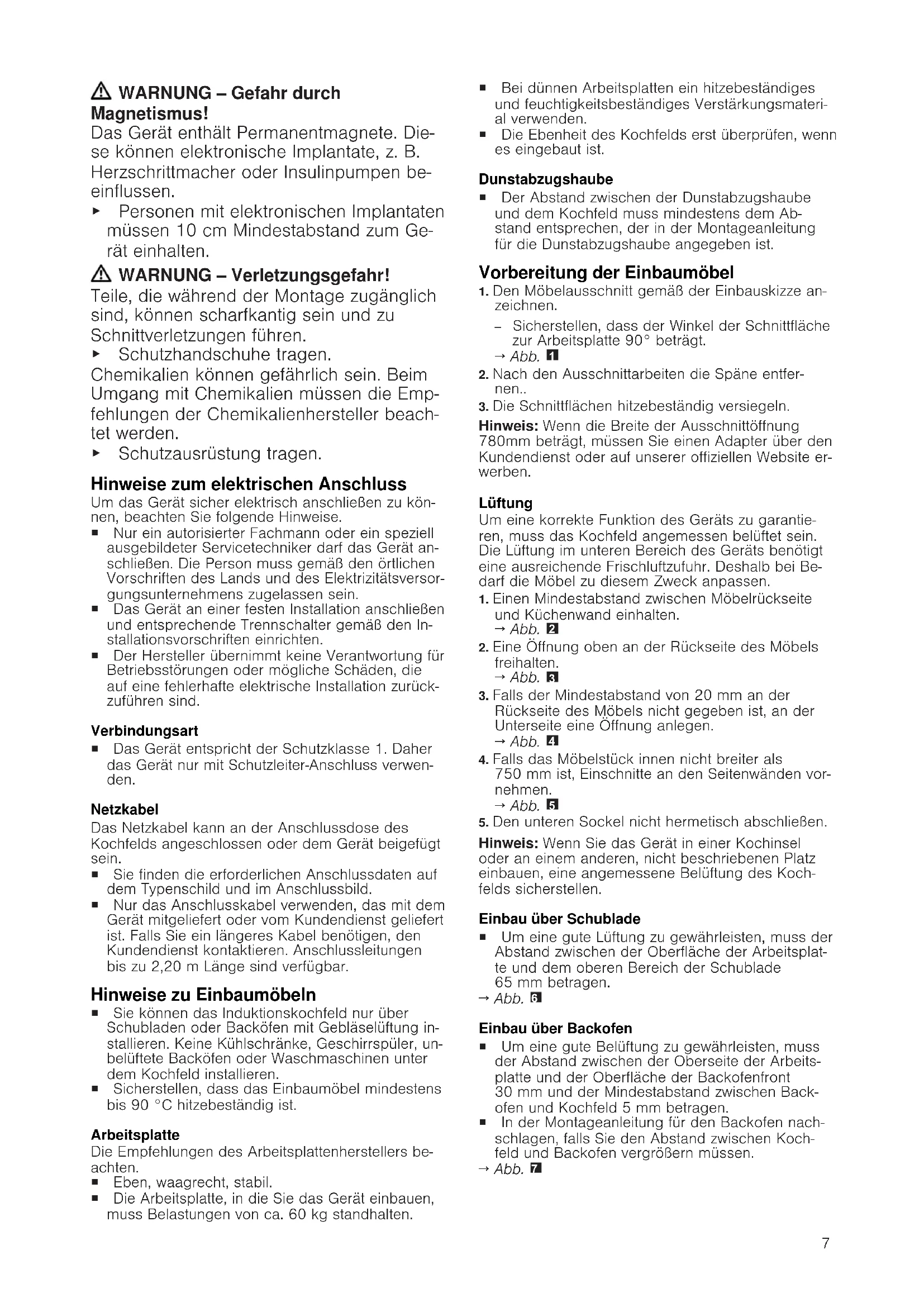 Allgemeine Hinweise ¡ Lesen Sie diese Anleitung sorgfältig. ¡ Nur eine konzessionierte Fachkraft darf das Gerät anschließen. ¡ Eine unsachgemäße Installation, Öffnung des Geräts, Verbindung oder Montage führt zum Verlust der Gültigkeit der Pro- duktgarantie. ¡ Vor der Durchführung jeglicher Arbeiten die Stromzufuhr abstellen. ¡ Nach der Installation sicherstellen, dass der Benutzer keinen Zugang zu den elek- trischen Bauteilen hat. ¡ Nie dieses Gerät in Booten oder Fahrzeu- gen verwenden. Sichere Montage Beachten Sie diese Sicherheitshinweise, wenn Sie das Gerät montieren. Nur bei fachgerechtem Einbau entspre- chend der Montageanleitung ist die Sicher- heit beim Gebrauch gewährleistet. Der In- stallateur ist für das einwandfreie Funktio- nieren des Geräts am Aufstellungsort ver- antwortlich.7 WARNUNG‒Gefahr durch Magnetismus! Das Gerät enthält Permanentmagnete. Die- se können elektronische Implantate, z.B. Herzschrittmacher oder Insulinpumpen be- einflussen. ▶ Personen mit elektronischen Implantaten müssen 10cm Mindestabstand zum Ge- rät einhalten. WARNUNG‒Verletzungsgefahr! Teile, die während der Montage zugänglich sind, können scharfkantig sein und zu Schnittverletzungen führen. ▶ Schutzhandschuhe tragen. Chemikalien können gefährlich sein. Beim Umgang mit Chemikalien müssen die Emp- fehlungen der Chemikalienhersteller beach- tet werden. ▶ Schutzausrüstung tragen. Hinweise zum elektrischen Anschluss Um das Gerät sicher elektrisch anschließen zu kön- nen, beachten Sie folgende Hinweise. ¡ Nur ein autorisierter Fachmann oder ein speziell ausgebildeter Servicetechniker darf das Gerät an- schließen. Die Person muss gemäß den örtlichen Vorschriften des Lands und des Elektrizitätsversor- gungsunternehmens zugelassen sein. ¡ Das Gerät an einer festen Installation anschließen und entsprechende Trennschalter gemäß den In- stallationsvorschriften einrichten. ¡ Der Hersteller übernimmt keine Verantwortung für Betriebsstörungen oder mögliche Schäden, die auf eine fehlerhafte elektrische Installation zurück- zuführen sind. Verbindungsart ¡ Das Gerät entspricht der Schutzklasse 1. Daher das Gerät nur mit Schutzleiter-Anschluss verwen- den. Netzkabel Das Netzkabel kann an der Anschlussdose des Kochfelds angeschlossen oder dem Gerät beigefügt sein. ¡ Sie finden die erforderlichen Anschlussdaten auf dem Typenschild und im Anschlussbild. ¡ Nur das Anschlusskabel verwenden, das mit dem Gerät mitgeliefert oder vom Kundendienst geliefert ist. Falls Sie ein längeres Kabel benötigen, den Kundendienst kontaktieren. Anschlussleitungen bis zu 2,20m Länge sind verfügbar. Hinweise zu Einbaumöbeln ¡ Sie können das Induktionskochfeld nur über Schubladen oder Backöfen mit Gebläselüftung in- stallieren. Keine Kühlschränke, Geschirrspüler, un- belüftete Backöfen oder Waschmaschinen unter dem Kochfeld installieren. ¡ Sicherstellen, dass das Einbaumöbel mindestens bis 90°C hitzebeständig ist. Arbeitsplatte Die Empfehlungen des Arbeitsplattenherstellers be- achten. ¡ Eben, waagrecht, stabil. ¡ Die Arbeitsplatte, in die Sie das Gerät einbauen, muss Belastungen von ca. 60kg standhalten. ¡ Bei dünnen Arbeitsplatten ein hitzebeständiges und feuchtigkeitsbeständiges Verstärkungsmateri- al verwenden. ¡ Die Ebenheit des Kochfelds erst überprüfen, wenn es eingebaut ist. Dunstabzugshaube ¡ Der Abstand zwischen der Dunstabzugshaube und dem Kochfeld muss mindestens dem Ab- stand entsprechen, der in der Montageanleitung für die Dunstabzugshaube angegeben ist. Vorbereitung der Einbaumöbel