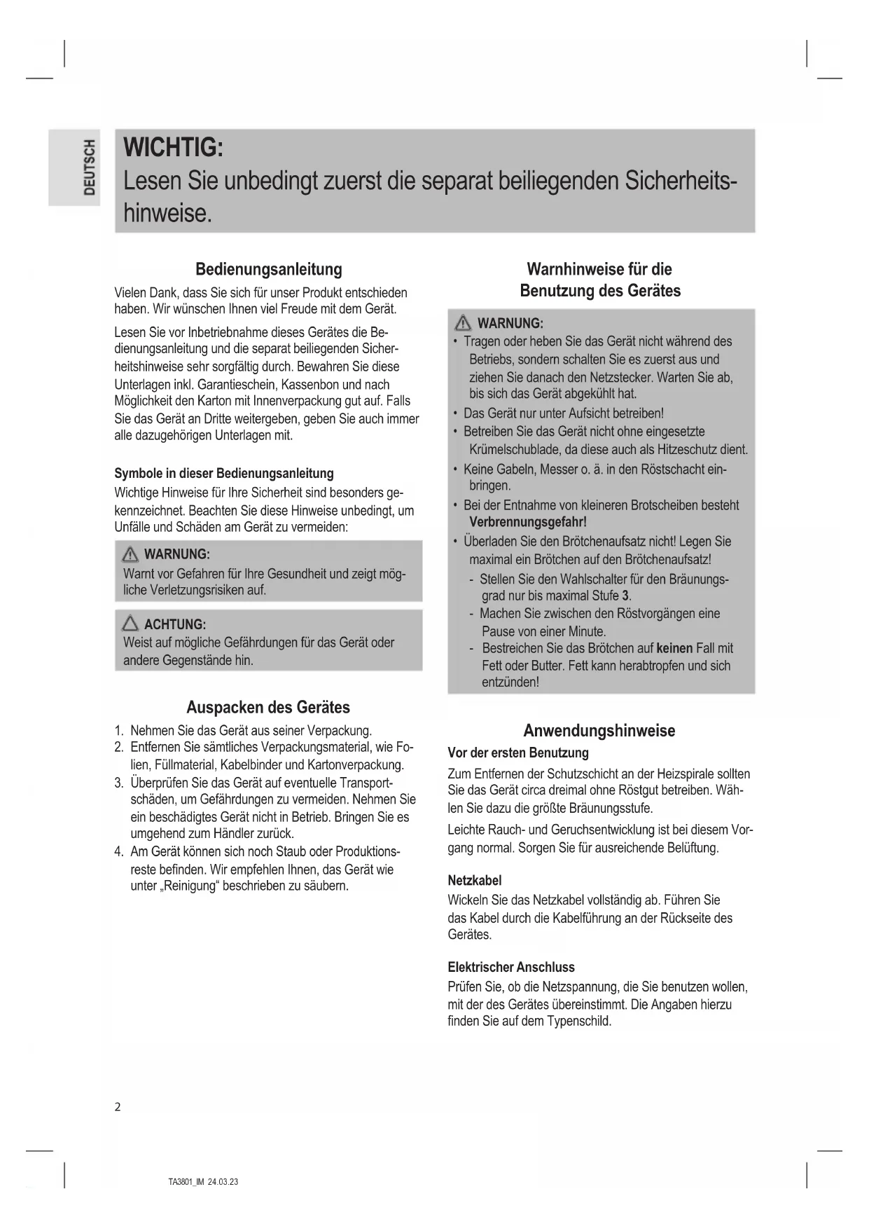 TA 3801 TA3801_IM 24.03.23 Bedienungsanleitung Instruction Manual • Gebruiksaanwijzing • Mode d’emploi Manual de instrucciones • Istruzioni per l’uso • Instrukcja obsługi / Gwarancja Használati utasítás • Руководство по эксплуатации • TOASTER Toaster • Broodrooster • Grille-pain Tostadora • Tostapane • Toster Kenyérpirító • Тостер •2 TA3801_IM 24.03.23 WICHTIG: Lesen Sie unbedingt zuerst die separat beiliegenden Sicherheits- hinweise. Bedienungsanleitung Vielen Dank, dass Sie sich für unser Produkt entschieden haben. Wir wünschen Ihnen viel Freude mit dem Gerät. Lesen Sie vor Inbetriebnahme dieses Gerätes die Be- dienungsanleitung und die separat beiliegenden Sicher- heitshinweise sehr sorgfältig durch. Bewahren Sie diese Unterlagen inkl. Garantieschein, Kassenbon und nach Möglichkeit den Karton mit Innenverpackung gut auf. Falls Sie das Gerät an Dritte weitergeben, geben Sie auch immer alle dazugehörigen Unterlagen mit. Symbole in dieser Bedienungsanleitung Wichtige Hinweise für Ihre Sicherheit sind besonders ge- kennzeichnet. Beachten Sie diese Hinweise unbedingt, um Unfälle und Schäden am Gerät zu vermeiden: WARNUNG: Warnt vor Gefahren für Ihre Gesundheit und zeigt mög- liche Verletzungsrisiken auf. ACHTUNG: Weist auf mögliche Gefährdungen für das Gerät oder andere Gegenstände hin. Auspacken des Gerätes