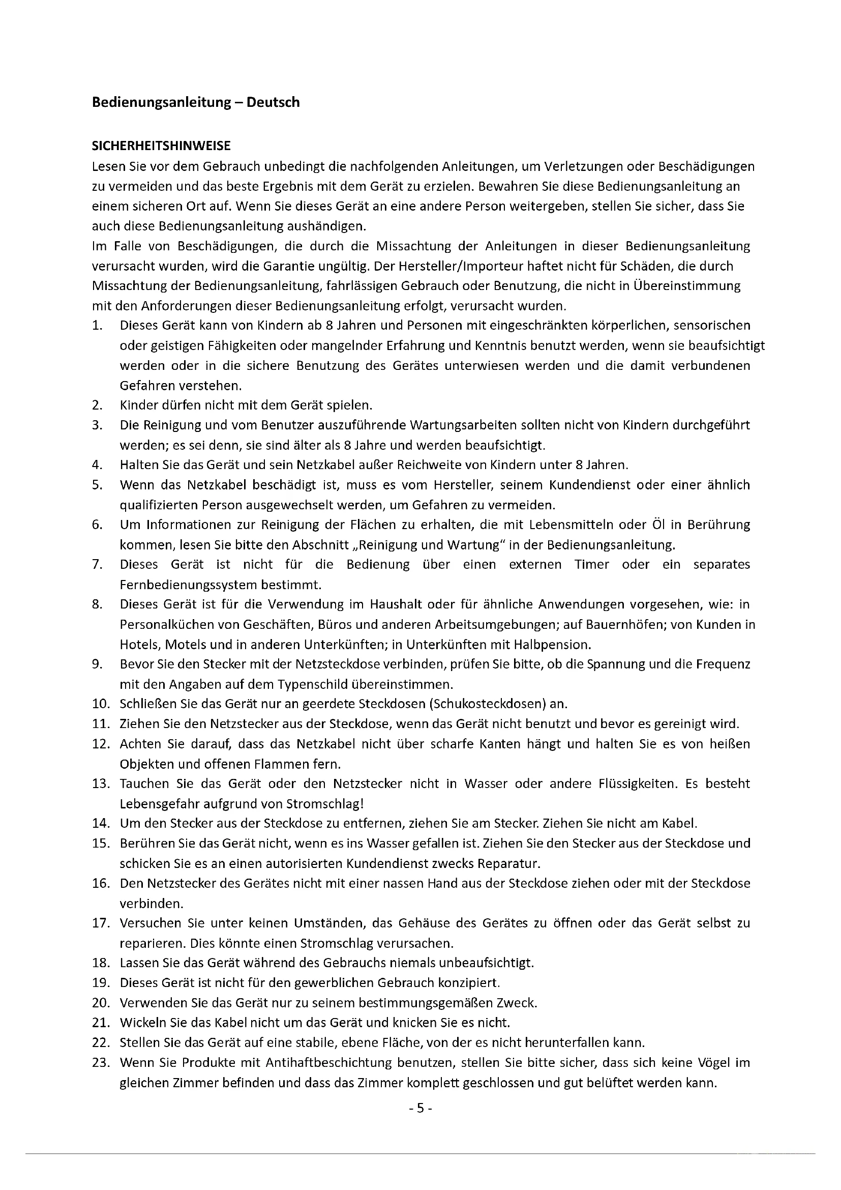 23. Wenn Sie Produkte mit Antihaftbeschichtung benutzen, stellen Sie bitte sicher, dass sich keine Vögel im