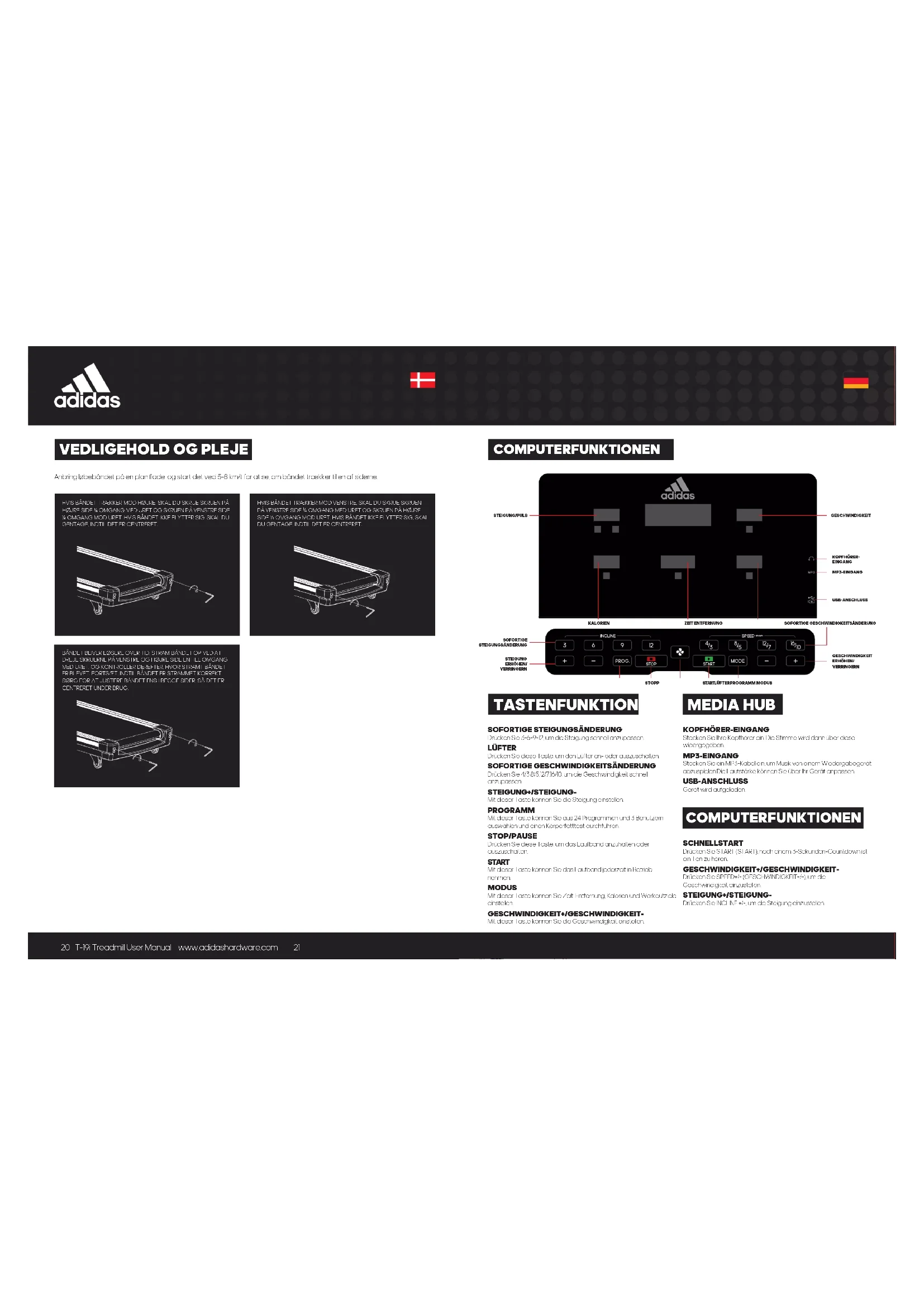 Anbring løbebåndet på en plan flade, og start det ved 5-8 km/t for at se, om båndet trækker til en af siderne.STEIGUNG/PULSSOFORTIGE STEIGUNGSÄNDERUNGSTEIGUNG ERHÖHEN/VERRINGERNKALORIENSTOPPZEIT ENTFERNUNGUSB-ANSCHLUSSMP3-EINGANGKOPFHÖRER-EINGANGGESCHWINDIGKEITSTARTLÜFTERPROGRAMM MODUSGESCHWINDIGKEIT ERHÖHEN/VERRINGERNSOFORTIGE GESCHWINDIGKEITSÄNDERUNG COMPUTERFUNKTIONEN TASTENFUNKTION SOFORTIGE STEIGUNGSÄNDERUNGDrücken Sie 3-6-9-12, um die Steigung schnell anzupassen.LÜFTERDrücken Sie diese Taste, um den Lüfter an- oder auszuschalten.SOFORTIGE GESCHWINDIGKEITSÄNDERUNGDrücken Sie 4/3,8/5,12/7,16/10, um die Geschwindigkeit schnell anzupassen.STEIGUNG+/STEIGUNG-Mit dieser Taste können Sie die Steigung einstellen.PROGRAMMMit dieser Taste können Sie aus 24 Programmen und 3 Benutzern auswählen und einen Körperfetttest durchführen.STOP/PAUSEDrücken Sie diese Taste, um das Laufband anzuhalten oder auszuschalten.STARTMit dieser Taste können Sie das Laufband jederzeit in Betrieb nehmen.MODUSMit dieser Taste können Sie Zeit, Entfernung, Kalorien und Workoutziele einstellen.GESCHWINDIGKEIT+/GESCHWINDIGKEIT-Mit dieser Taste können Sie die Geschwindigkeit einstellen.KOPFHÖRER-EINGANGStecken Sie Ihre Kopfhörer ein. Die Stimme wird dann über diese widergegeben.MP3-EINGANGStecken Sie ein MP3-Kabel ein, um Musik von einem Wiedergabegerät abzuspielen.Die Lautstärke können Sie über Ihr Gerät anpassen.USB-ANSCHLUSSGerät wird aufgeladen. MEDIA HUB SCHNELLSTARTDrücken Sie START (START), nach einem 3-Sekunden-Countdown ist ein Ton zu hören.GESCHWINDIGKEIT+/GESCHWINDIGKEIT-Drücken Sie SPEED+/- (GESCHWINDIGKEIT+/-), um die Geschwindigkeit einzustellen.STEIGUNG+/STEIGUNG-Drücken Sie INCLINE +/-, um die Steigung einzustellen.. COMPUTERFUNKTIONEN22 T-19i Treadmill User Manual www.adidashardware.com 23 MODUS