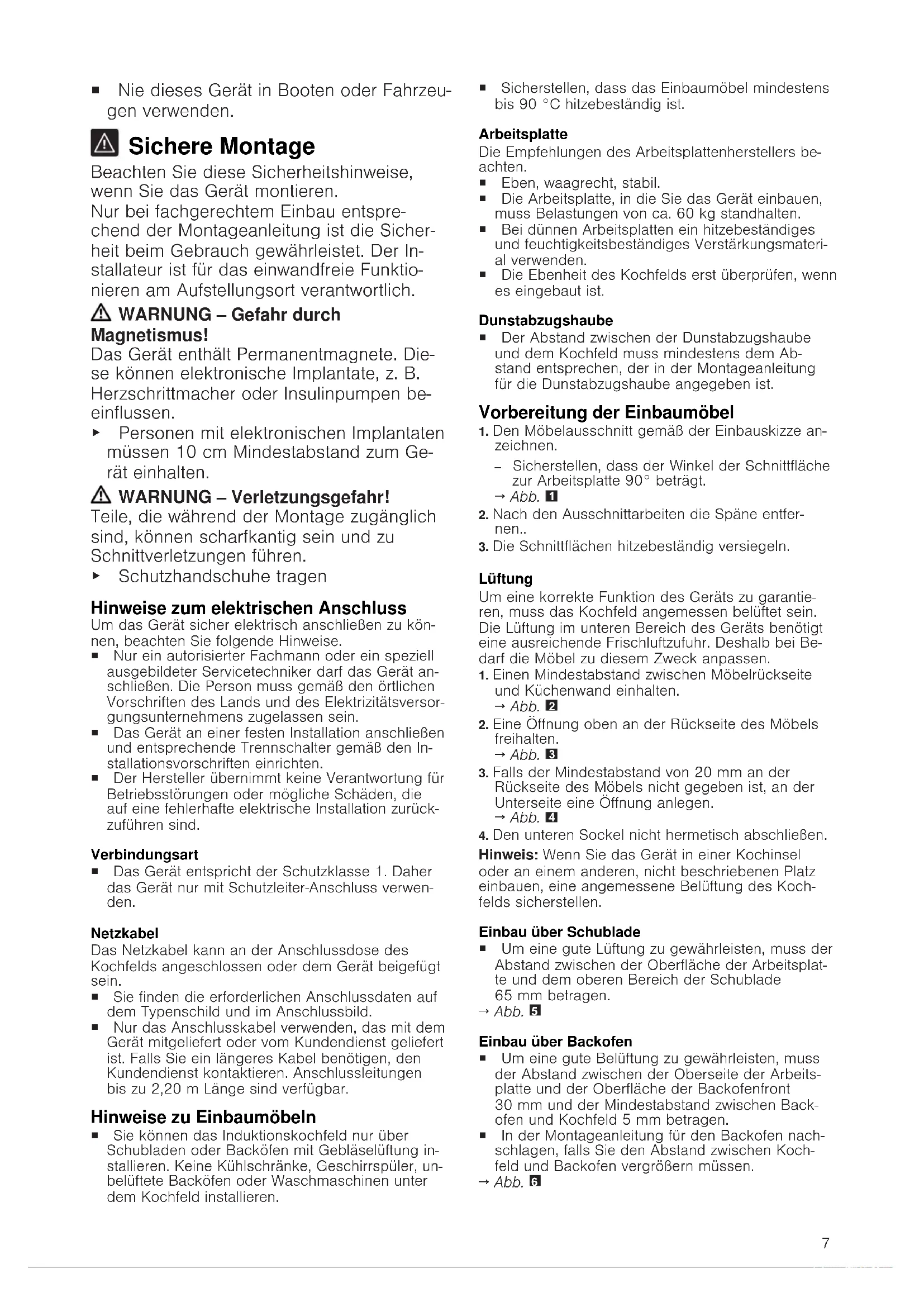 Allgemeine Hinweise ¡ Lesen Sie diese Anleitung sorgfältig. ¡ Nur eine konzessionierte Fachkraft darf das Gerät anschließen. ¡ Eine unsachgemäße Installation, Öffnung des Geräts, Verbindung oder Montage führt zum Verlust der Gültigkeit der Pro- duktgarantie. ¡ Vor der Durchführung jeglicher Arbeiten die Stromzufuhr abstellen. ¡ Nach der Installation sicherstellen, dass der Benutzer keinen Zugang zu den elek- trischen Bauteilen hat.7 ¡ Nie dieses Gerät in Booten oder Fahrzeu- gen verwenden. Sichere Montage Beachten Sie diese Sicherheitshinweise, wenn Sie das Gerät montieren. Nur bei fachgerechtem Einbau entspre- chend der Montageanleitung ist die Sicher- heit beim Gebrauch gewährleistet. Der In- stallateur ist für das einwandfreie Funktio- nieren am Aufstellungsort verantwortlich. WARNUNG‒Gefahr durch Magnetismus! Das Gerät enthält Permanentmagnete. Die- se können elektronische Implantate, z.B. Herzschrittmacher oder Insulinpumpen be- einflussen. ▶ Personen mit elektronischen Implantaten müssen 10cm Mindestabstand zum Ge- rät einhalten. WARNUNG‒Verletzungsgefahr! Teile, die während der Montage zugänglich sind, können scharfkantig sein und zu Schnittverletzungen führen. ▶ Schutzhandschuhe tragen Hinweise zum elektrischen Anschluss Um das Gerät sicher elektrisch anschließen zu kön- nen, beachten Sie folgende Hinweise. ¡ Nur ein autorisierter Fachmann oder ein speziell ausgebildeter Servicetechniker darf das Gerät an- schließen. Die Person muss gemäß den örtlichen Vorschriften des Lands und des Elektrizitätsversor- gungsunternehmens zugelassen sein. ¡ Das Gerät an einer festen Installation anschließen und entsprechende Trennschalter gemäß den In- stallationsvorschriften einrichten. ¡ Der Hersteller übernimmt keine Verantwortung für Betriebsstörungen oder mögliche Schäden, die auf eine fehlerhafte elektrische Installation zurück- zuführen sind. Verbindungsart ¡ Das Gerät entspricht der Schutzklasse 1. Daher das Gerät nur mit Schutzleiter-Anschluss verwen- den. Netzkabel Das Netzkabel kann an der Anschlussdose des Kochfelds angeschlossen oder dem Gerät beigefügt sein. ¡ Sie finden die erforderlichen Anschlussdaten auf dem Typenschild und im Anschlussbild. ¡ Nur das Anschlusskabel verwenden, das mit dem Gerät mitgeliefert oder vom Kundendienst geliefert ist. Falls Sie ein längeres Kabel benötigen, den Kundendienst kontaktieren. Anschlussleitungen bis zu 2,20m Länge sind verfügbar. Hinweise zu Einbaumöbeln ¡ Sie können das Induktionskochfeld nur über Schubladen oder Backöfen mit Gebläselüftung in- stallieren. Keine Kühlschränke, Geschirrspüler, un- belüftete Backöfen oder Waschmaschinen unter dem Kochfeld installieren. ¡ Sicherstellen, dass das Einbaumöbel mindestens bis 90°C hitzebeständig ist. Arbeitsplatte Die Empfehlungen des Arbeitsplattenherstellers be- achten. ¡ Eben, waagrecht, stabil. ¡ Die Arbeitsplatte, in die Sie das Gerät einbauen, muss Belastungen von ca. 60kg standhalten. ¡ Bei dünnen Arbeitsplatten ein hitzebeständiges und feuchtigkeitsbeständiges Verstärkungsmateri- al verwenden. ¡ Die Ebenheit des Kochfelds erst überprüfen, wenn es eingebaut ist. Dunstabzugshaube ¡ Der Abstand zwischen der Dunstabzugshaube und dem Kochfeld muss mindestens dem Ab- stand entsprechen, der in der Montageanleitung für die Dunstabzugshaube angegeben ist. Vorbereitung der Einbaumöbel