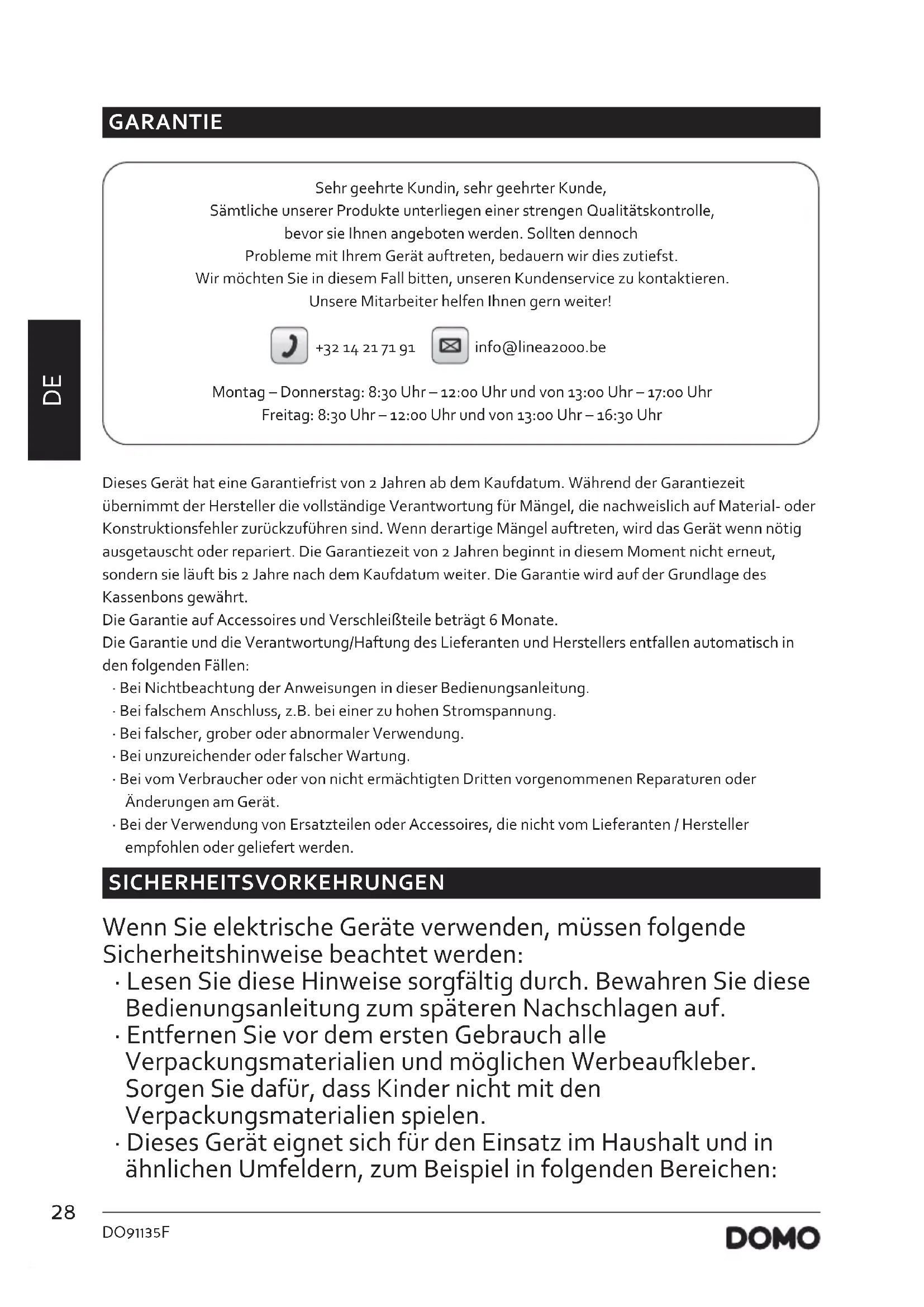 GARANTIE Sehr geehrte Kundin, sehr geehrter Kunde, Sämtliche unserer Produkte unterliegen einer strengen Qualitätskontrolle, bevor sie Ihnen angeboten werden. Sollten dennoch Probleme mit Ihrem Gerät auftreten, bedauern wir dies zutiefst. Wir möchten Sie in diesem Fall bitten, unseren Kundenservice zu kontaktieren. Unsere Mitarbeiter helfen Ihnen gern weiter! +32 14 21 71 91 info@linea2000.be Montag – Donnerstag: 8:30 Uhr – 12:00 Uhr und von 13:00 Uhr – 17:00 Uhr Freitag: 8:30 Uhr – 12:00 Uhr und von 13:00 Uhr – 16:30 Uhr Dieses Gerät hat eine Garantiefrist von 2 Jahren ab dem Kaufdatum. Während der Garantiezeit übernimmt der Hersteller die vollständige Verantwortung für Mängel, die nachweislich auf Material- oder Konstruktionsfehler zurückzuführen sind. Wenn derartige Mängel auftreten, wird das Gerät wenn nötig ausgetauscht oder repariert. Die Garantiezeit von 2 Jahren beginnt in diesem Moment nicht erneut, sondern sie läuft bis 2 Jahre nach dem Kaufdatum weiter. Die Garantie wird auf der Grundlage des Kassenbons gewährt. Die Garantie auf Accessoires und Verschleißteile beträgt 6 Monate. Die Garantie und die Verantwortung/Haftung des Lieferanten und Herstellers entfallen automatisch in den folgenden Fällen: