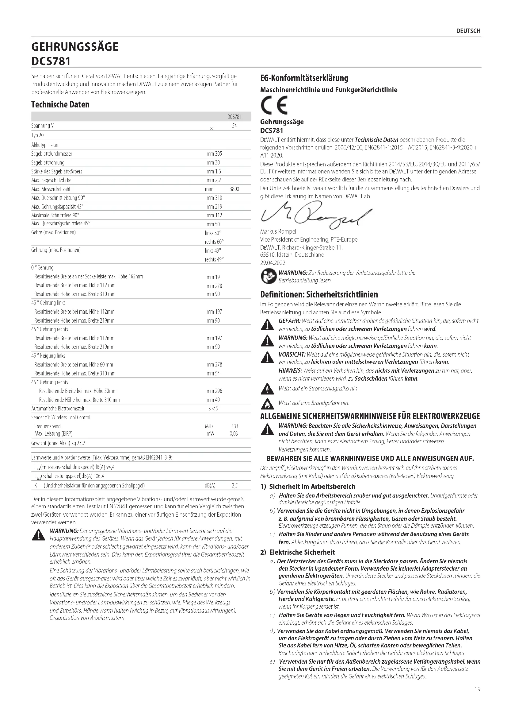 WARNUNG: Der angegebene Vibrations- und/oder Lärmwert bezieht sich auf die Hauptanwendung des Gerätes. Wenn das Gerät jedoch für andere Anwendungen, mit anderem Zubehör oder schlecht gewartet eingesetzt wird, kann der Vibrations- und/oder Lärmwert verschieden sein. Dies kann den Expositionsgrad über die Gesamtbetriebszeit erheblicherhöhen. Eine Schätzung der Vibrations- und/oder Lärmbelastung sollte auch berücksichtigen, wie oft das Gerät ausgeschaltet wird oder über welche Zeit es zwar läuft, aber nicht wirklich in Betrieb ist. Dies kann die Exposition über die Gesamtbetriebszeit erheblichmindern. Identifizieren Sie zusätzliche Sicherheitsmaßnahmen, um den Bediener vor den Vibrations- und/oder Lärmauswirkungen zu schützen, wie: Pflege des Werkzeugs und Zubehörs, Hände warm halten (wichtig in Bezug auf Vibrationsauswirkungen), Organisation vonArbeitsmustern. EG‑Konformitätserklärung Maschinenrichtlinie und Funkgeräterichtlinie Gehrungssäge DCS781 DeWALT erklärt hiermit, dass diese unter Technische Daten beschriebenen Produkte die folgenden Vorschriften erfüllen: 2006/42/EC, EN62841‑1:2015 +AC:2015; EN62841‑3‑9:2020 + A11:2020. Diese Produkte entsprechen außerdem den Richtlinien 2014/53/EU, 2014/30/EU und 2011/65/ EU. Für weitere Informationen wenden Sie sich bitte an DeWALT unter der folgenden Adresse oder schauen Sie auf der Rückseite dieser Betriebsanleitungnach. Der Unterzeichnete ist verantwortlich für die Zusammenstellung des technischen Dossiers und gibt diese Erklärung im Namen von DeWALTab. Markus Rompel Vice President of Engineering, PTE‑Europe DeWALT, Richard‑Klinger‑Straße 11, 65510, Idstein, Deutschland